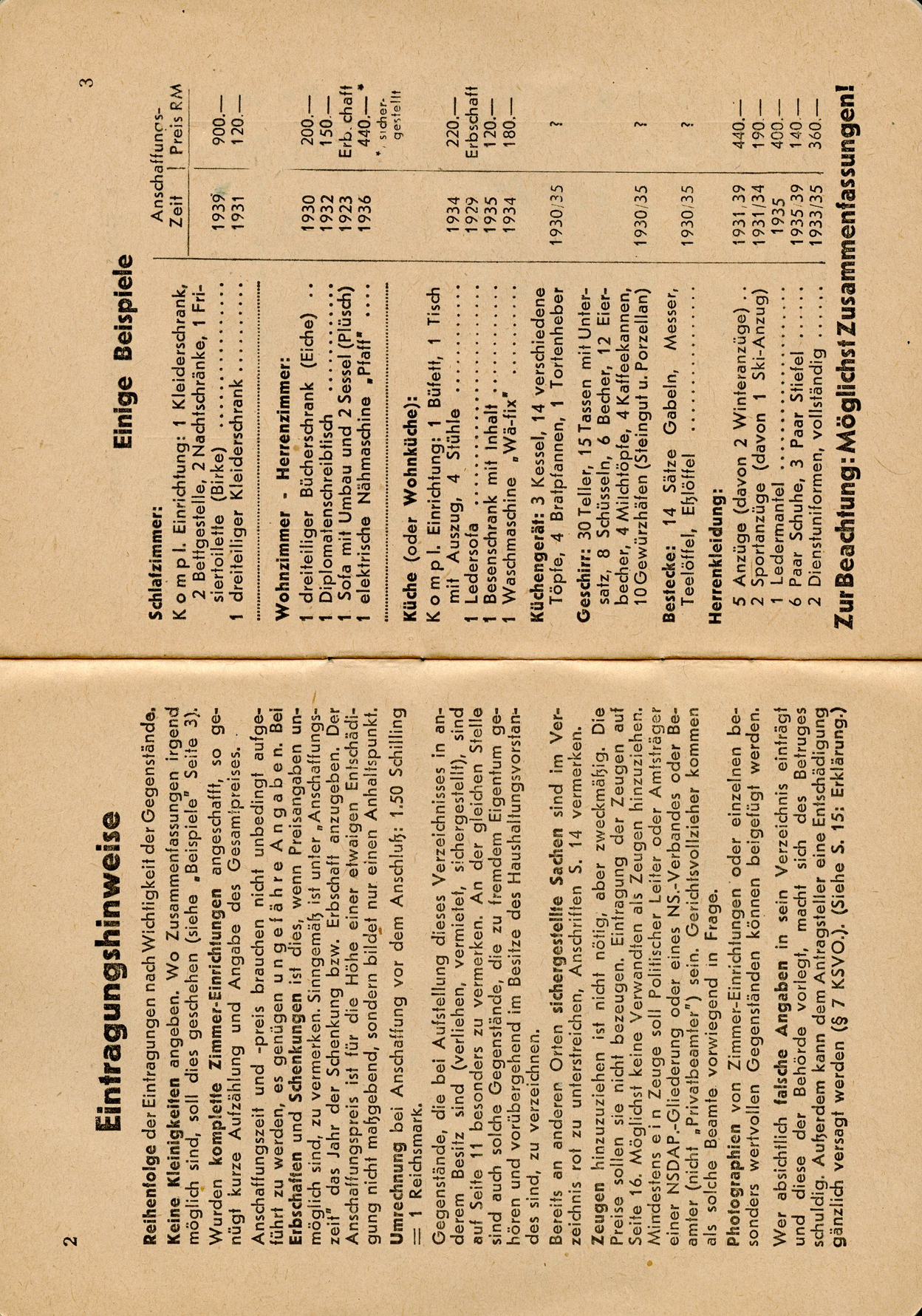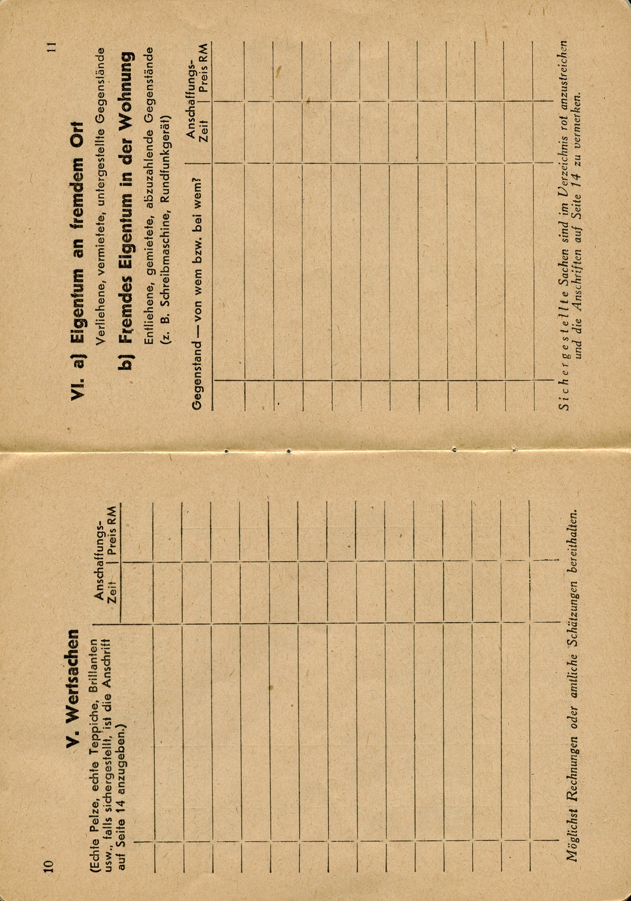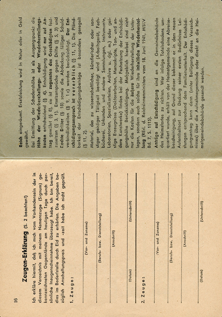 [Below: Page within. This basically says that the government will provide compensation for any of your equipment and home furnishing damged by enemy operations or damaged during defense with its own weapons. It also says 'Currently working for: Wehrmacht']
