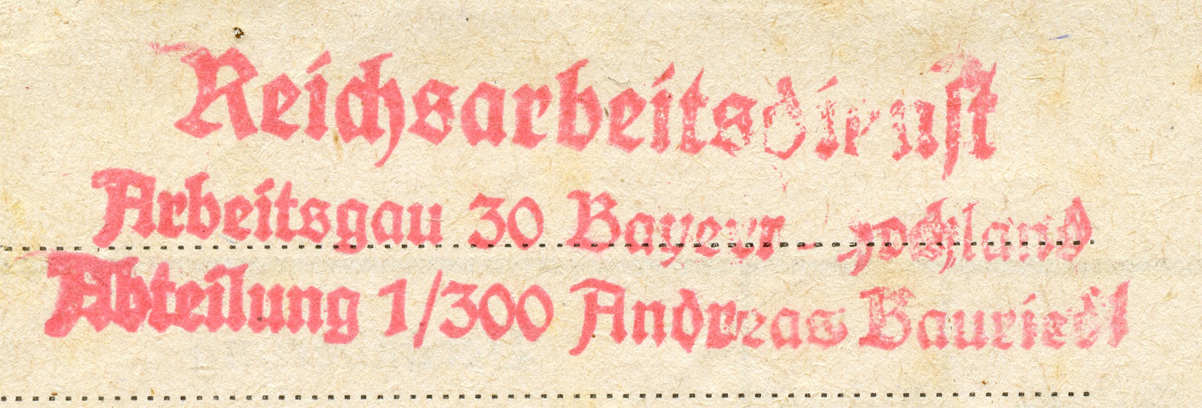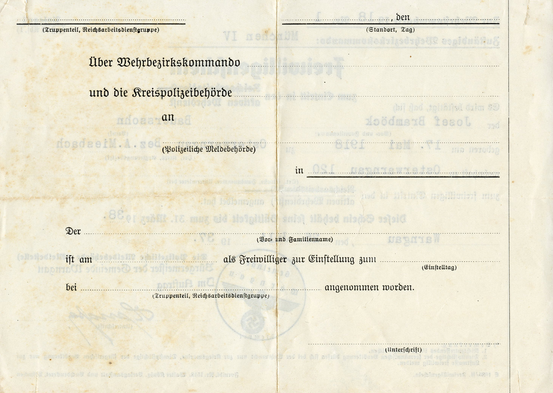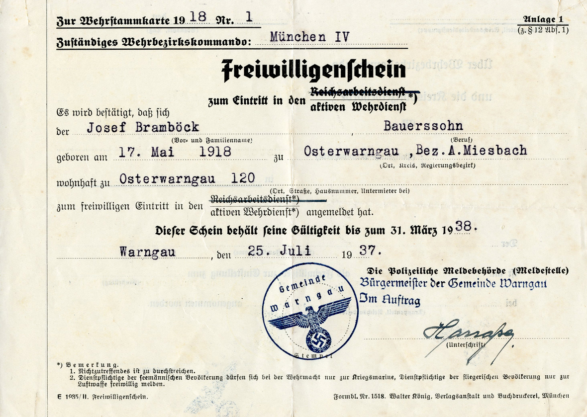 [Above: This is a volunteer certificate from Munich dated July 25, 1937 for entry into the Reich Labor Service (Reichsarbeitsdienst). This paper was for a farmer's son named Josef Bramböck (born May 17, 1918, making him around 19 years old) from Osterwarngau (Bavaria).]