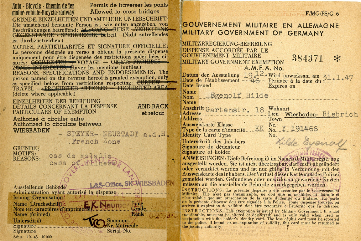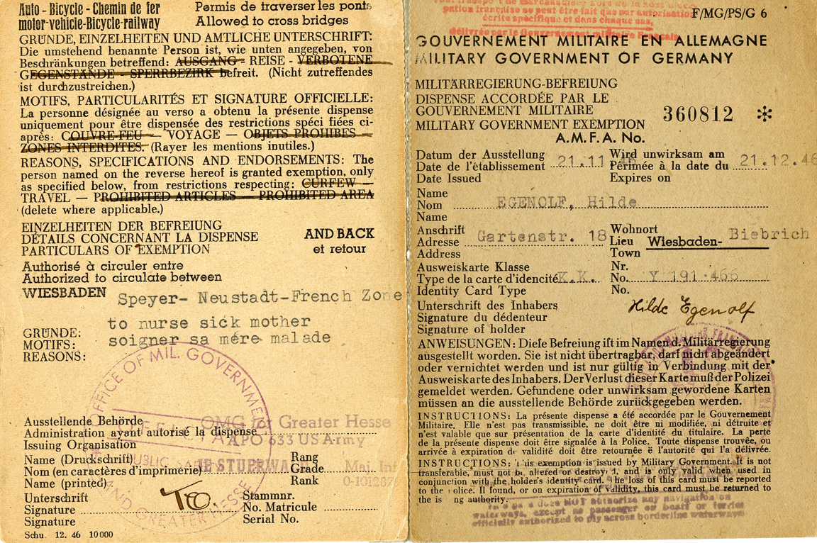 [Above: Interestingly, here is a post-WWII (December 21, 1946) Allied occupation (French Zone) card for Hilde. As is noted, this is for her to take care of her sick mother. It also allows her to 'cross bridges' and is stamped by the U.S. Army. Crazy.]