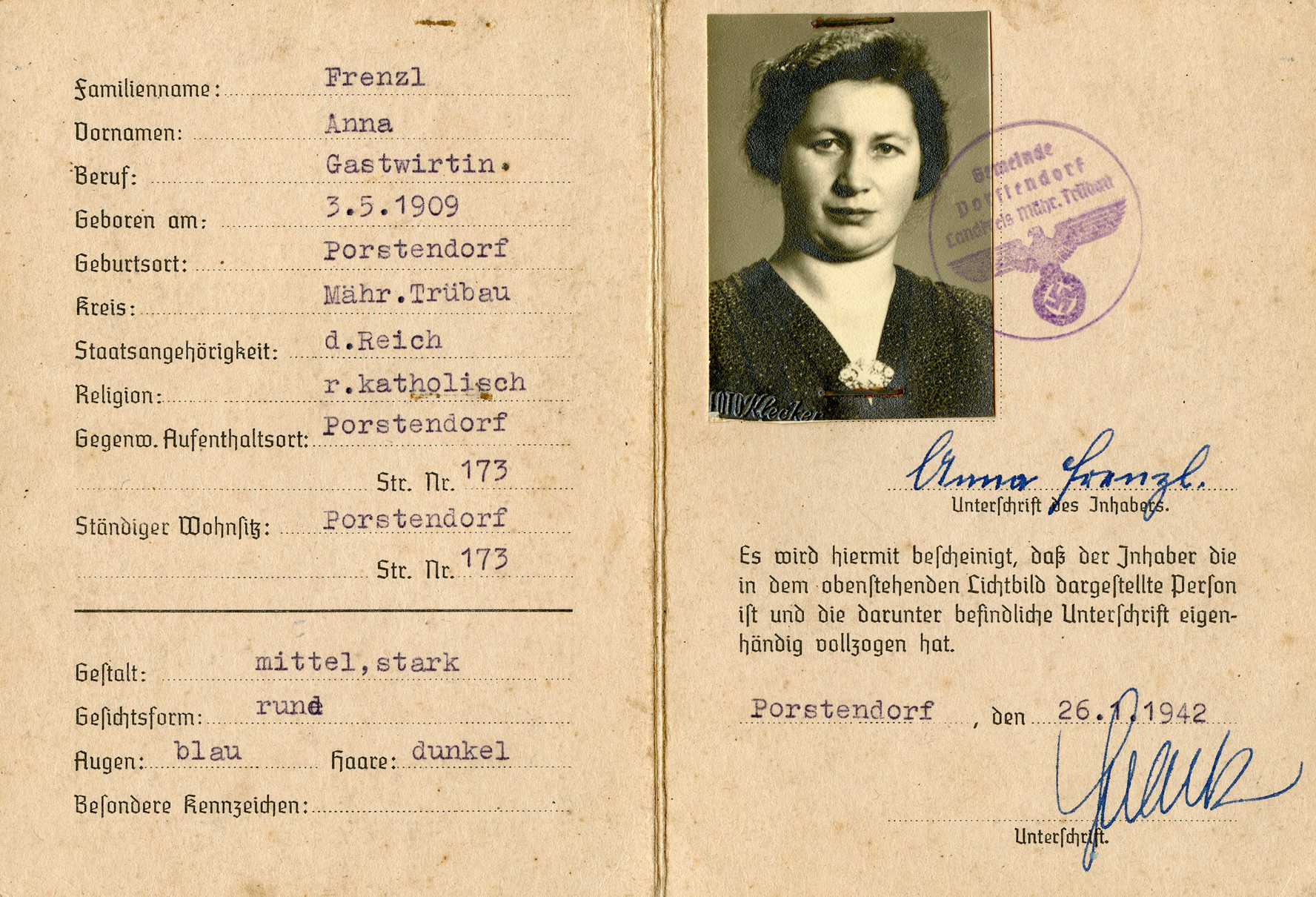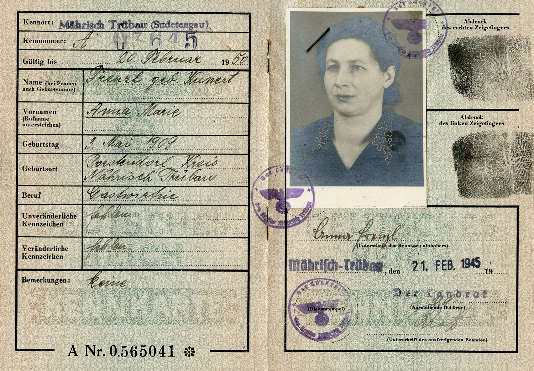 [Above: Meet Anna Marie Frenzl. This is a oddly plain Third Reich I.D., it also has a very low number - 72. This is from February 21, 1945, from Sudetenland.]