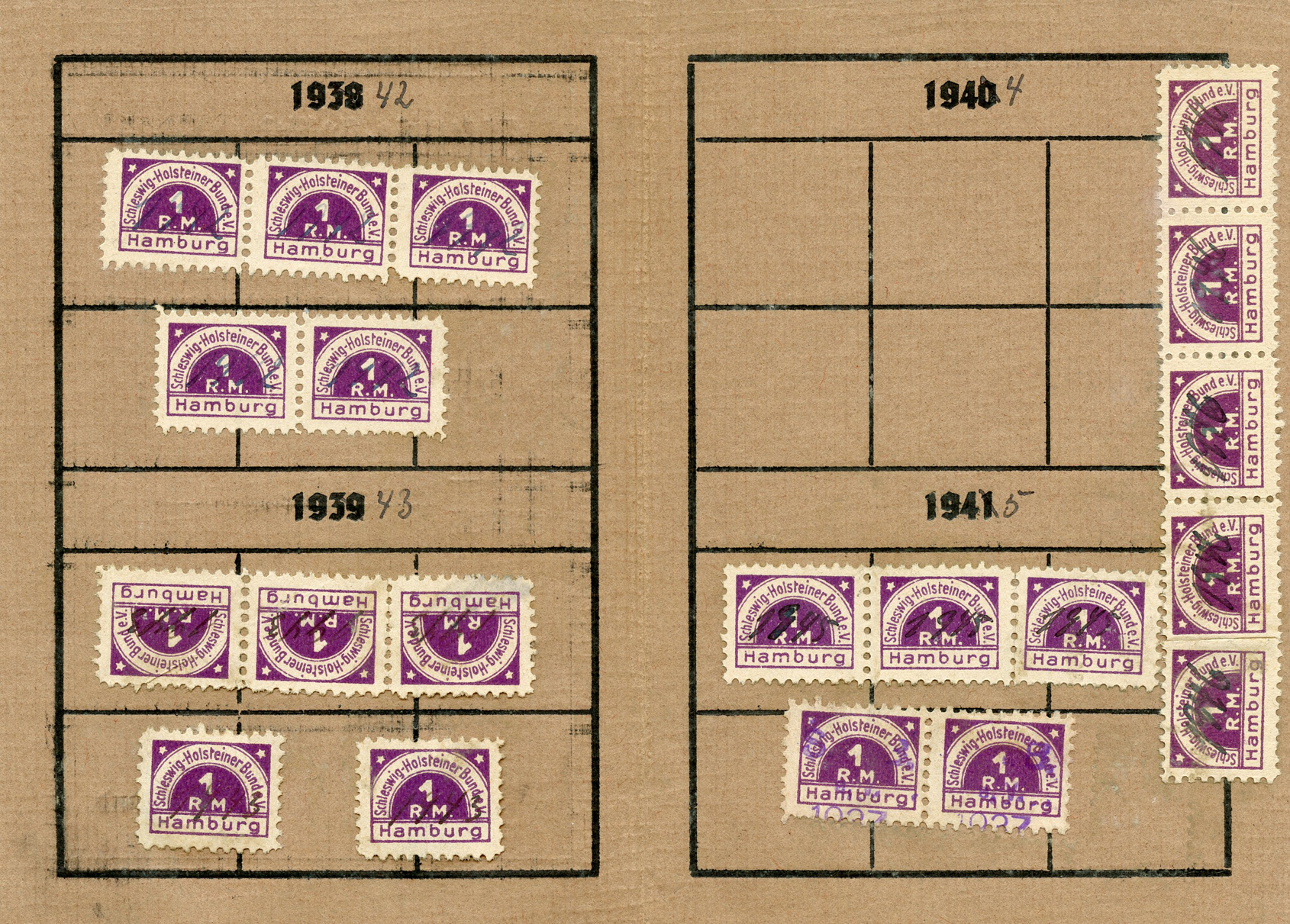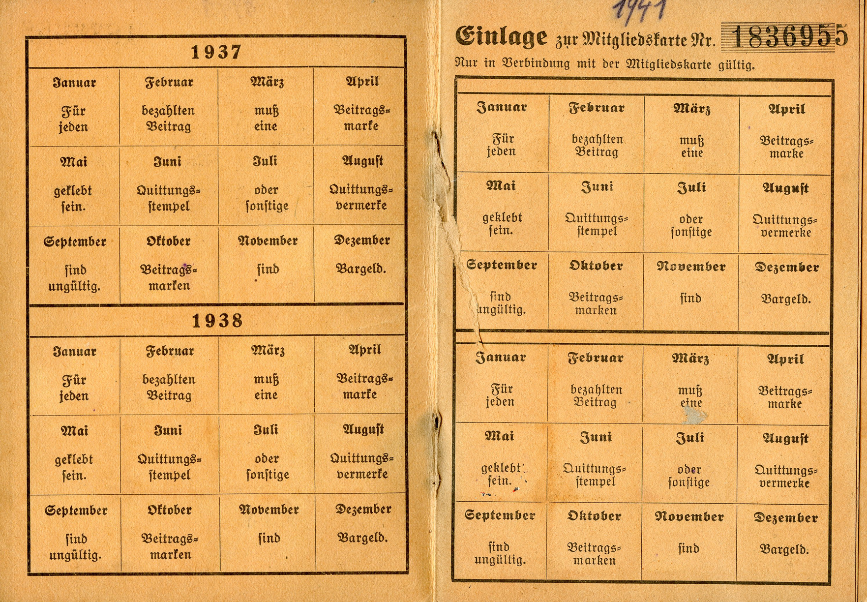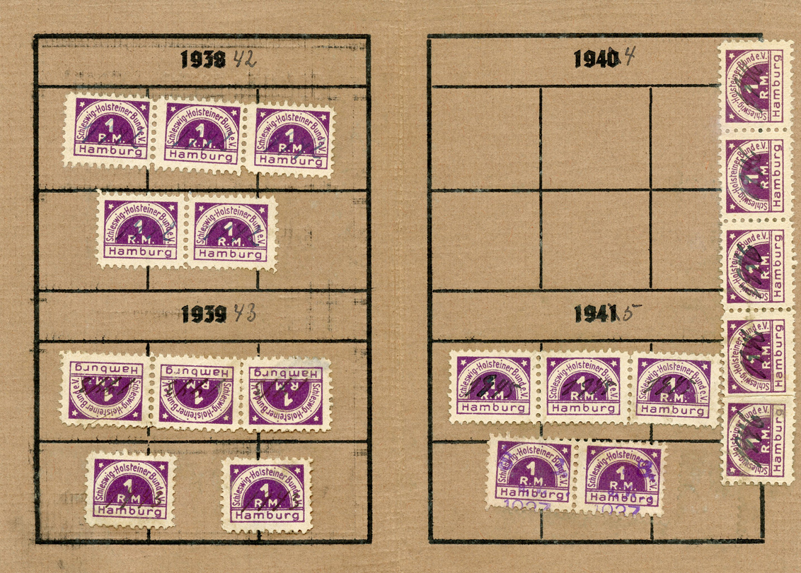 [Above: Inside, with dues stamps from 1938-1941. Note that each year cost five marks. According to the cover of the booklet, which says 'Mindest Jahresbeitrag', this is the 'Minimum annual contribution'.]
