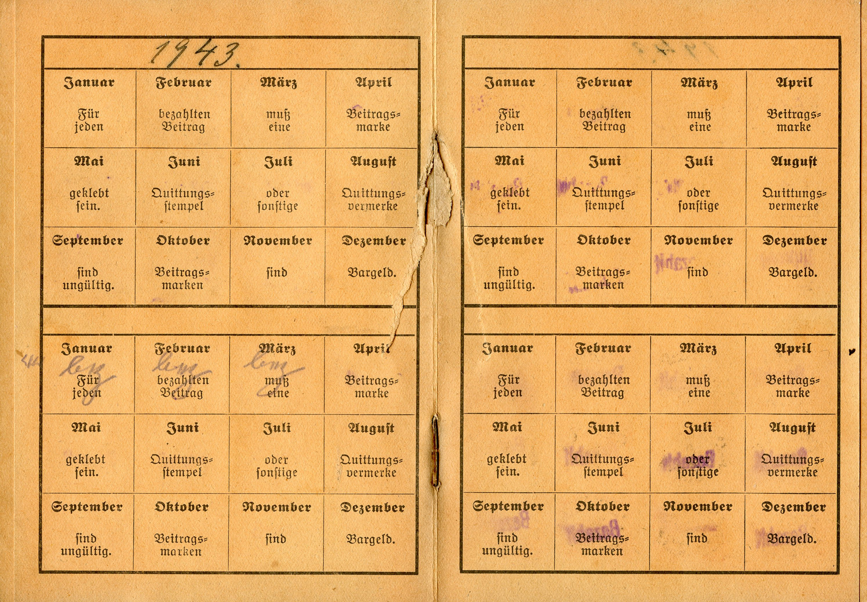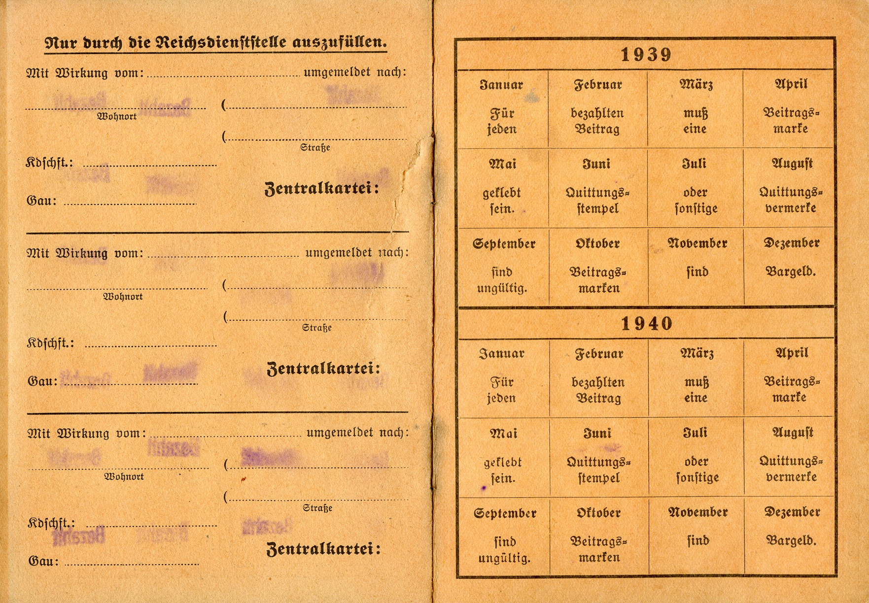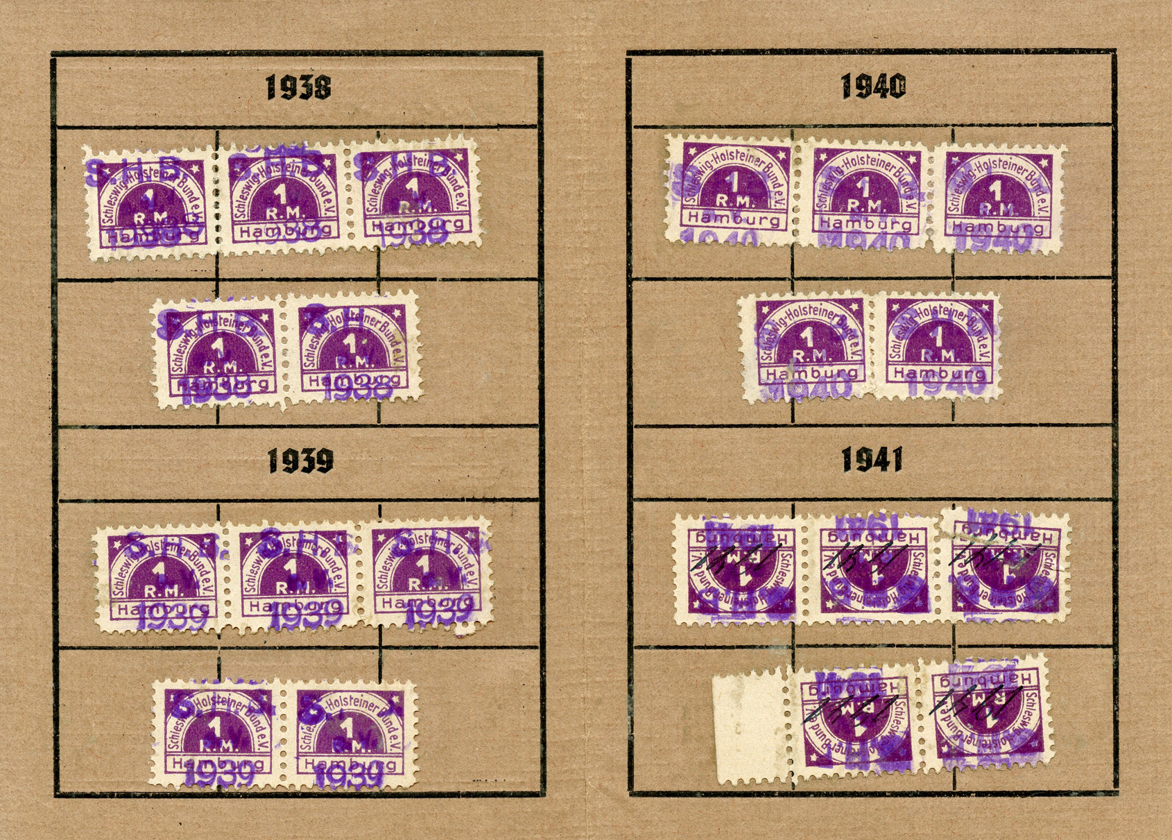 [Above: Inside, with dues stamps from 1938-1941. Note that each year cost five marks. According to the cover of the booklet, which says 'Mindest Jahresbeitrag', this is the 'Minimum annual contribution'.]