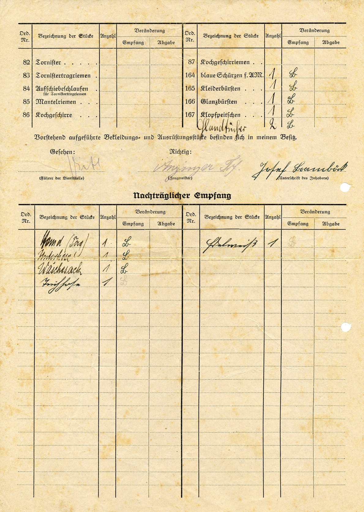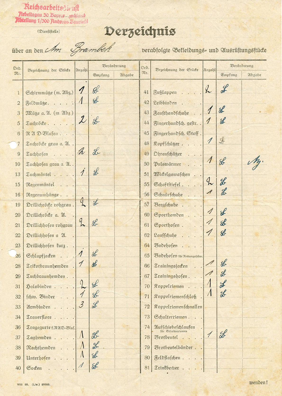 [Above: This is a 'Reichsarbeitsdienst' (Reich Labor Service) checklist of clothing issued. Wait, so this guy was issued three armbands and one pair of underwear?! Hehe...]