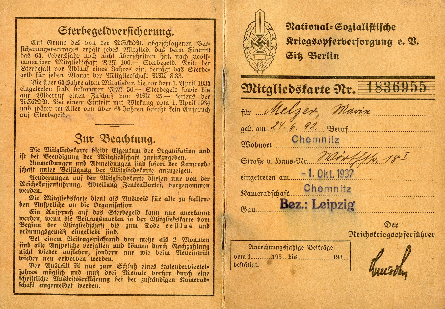 [Above: This booklet is from the 'National Socialistische Kriegsopferversorgung' (The National Socialist War Victim's Care), or NSKOV for short. This was a social welfare organization established in 1934 to help seriously wounded veterans and frontline fighters from World War I. This was issued in October 1937.]