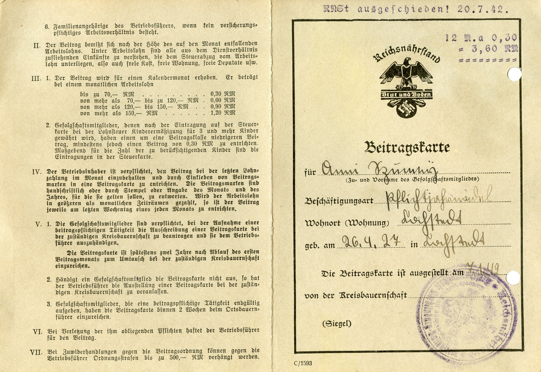 [Below: And Reichsnährstand booklet. This one uses a fancy typewriter font to type in some information, like expiration date and membership fee.]