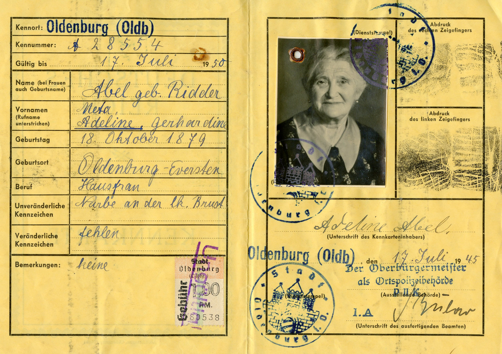 [Below: Here we see this was issued on July 17, 1945 in Oldenburg. It has a strange-looking tax stamp, I think this is a Third Reich issue that they were able to keep after the occupation because it didn't have swastikas on it.]