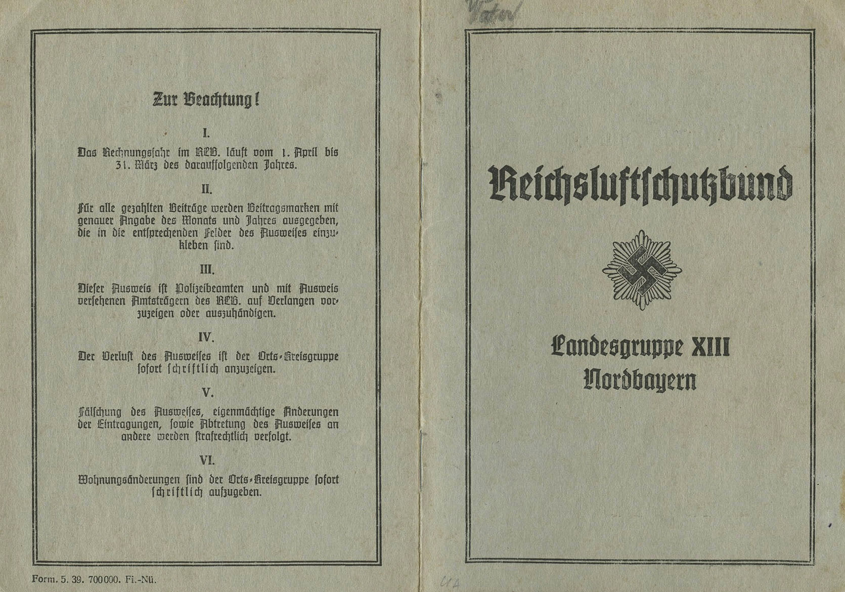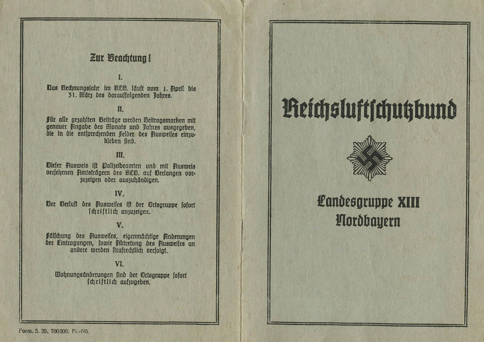[Below: Another membership card from the 'Reichsluftschutzbund' (Reichs Air Protection Organization. This one is also from 'Nordbayern' (North Bavaria). Front.]
