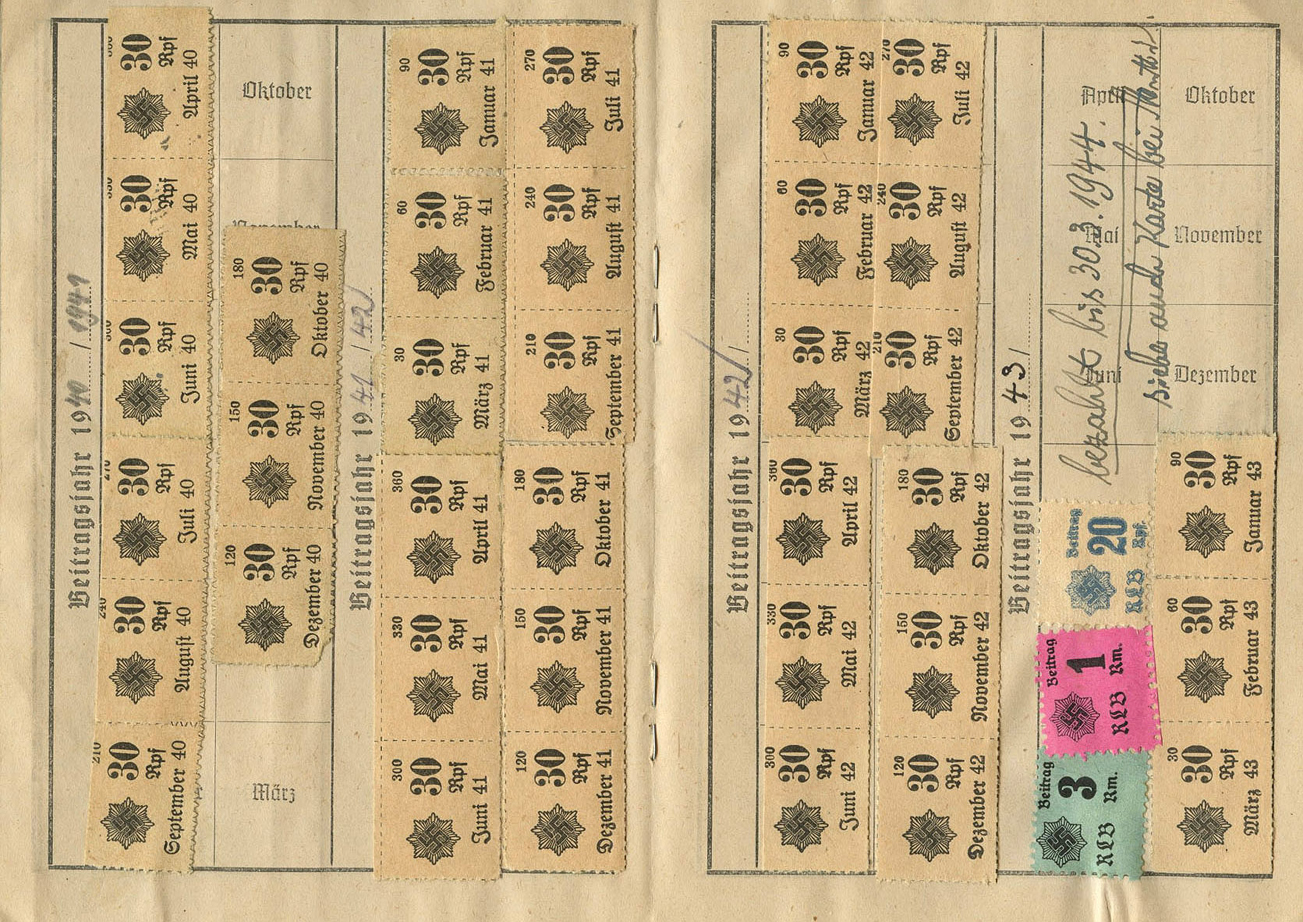 [Below: This is a Reichsluftschutzbund (Reich Air Protection Organization dues book, 1938-1944. Reverse/cover.]