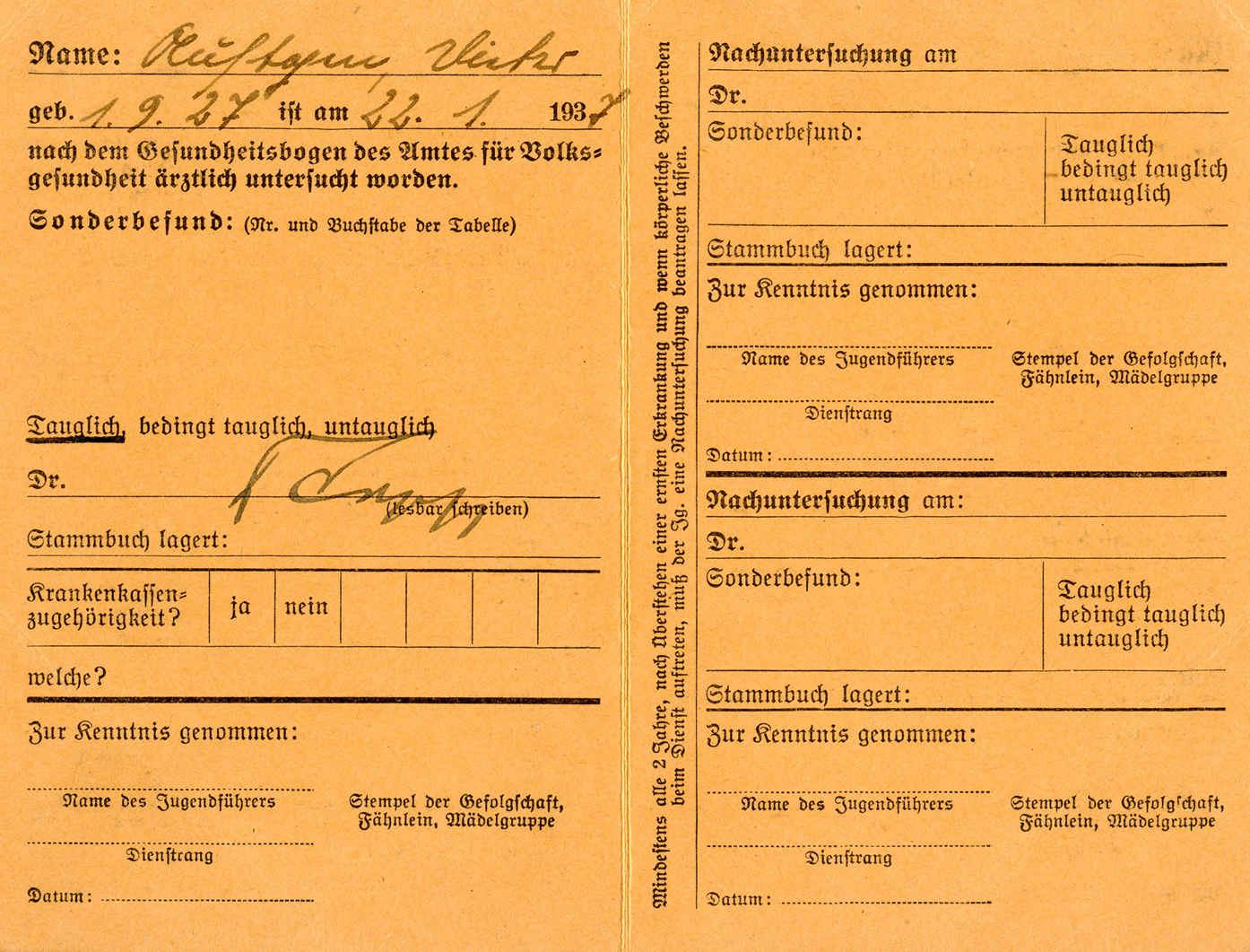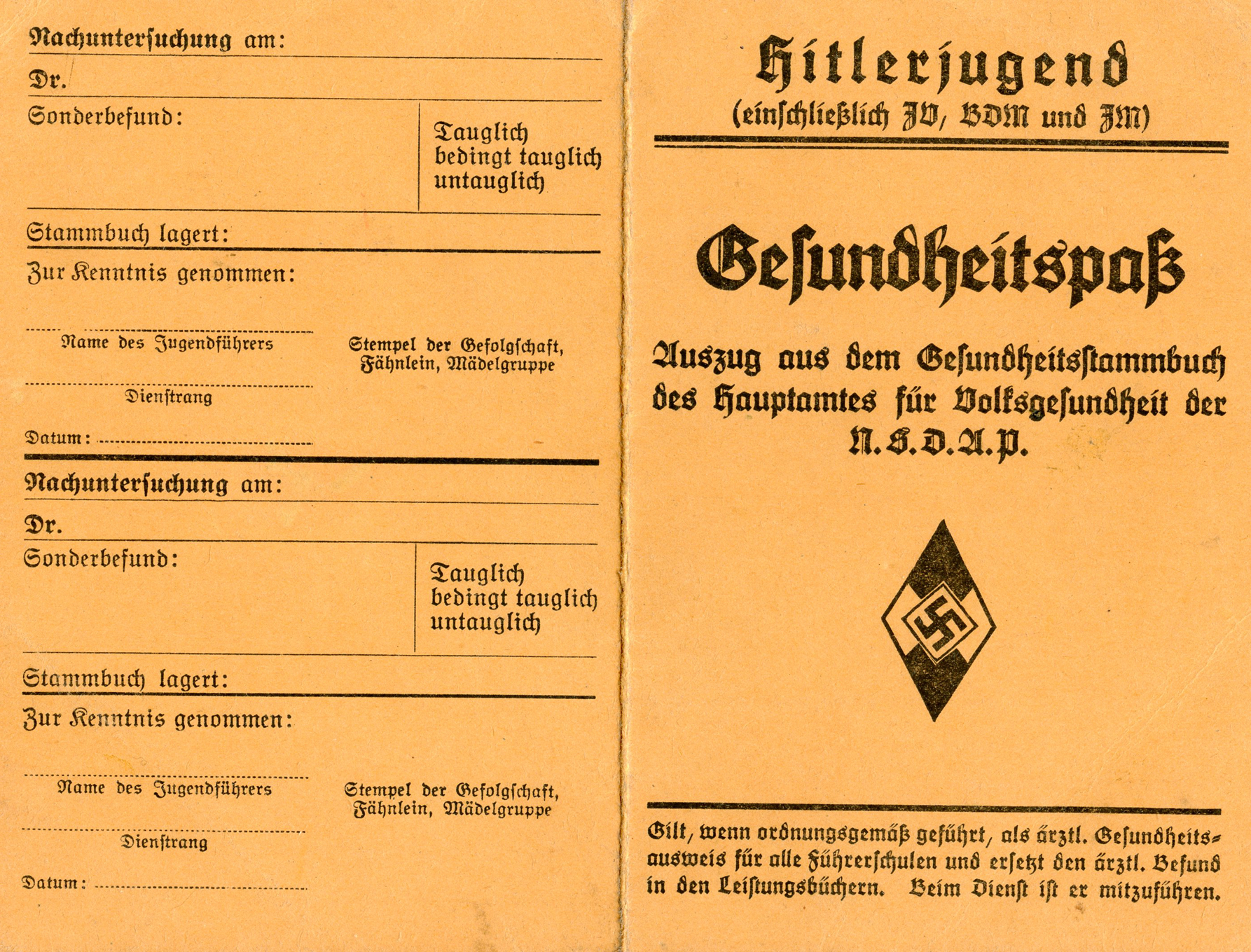 [Below: This is a 1937 'Gesundheitspaß' (Health Pass) for the 'Hitlerjugend (einschließlich JV, BDM und JM)' which stands for Jungvolk, Bund Deutscher Mädel and the JungMädelbund. Front/reverse.]