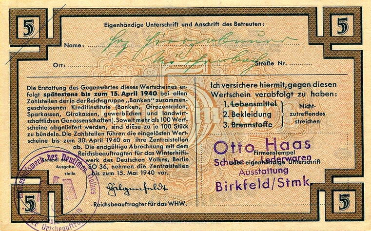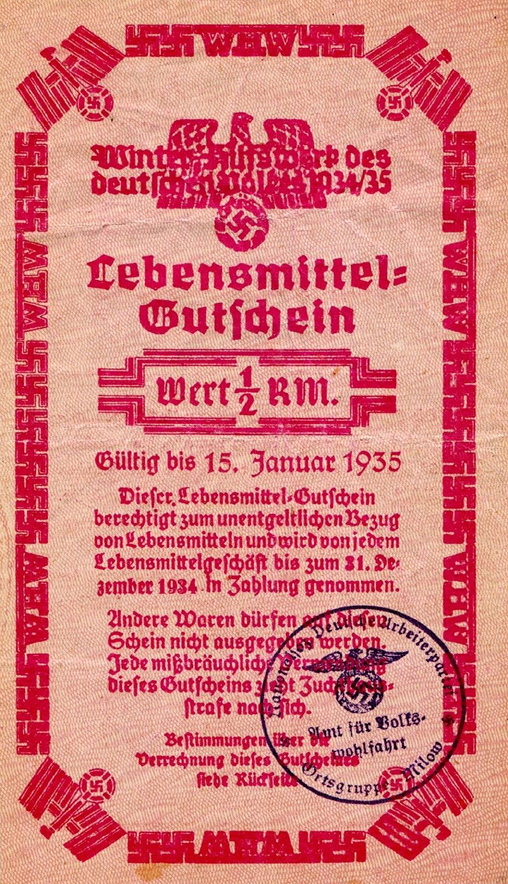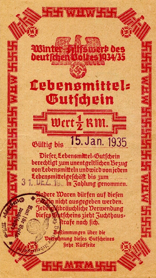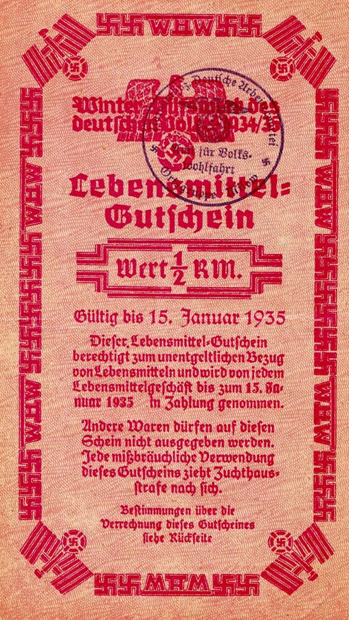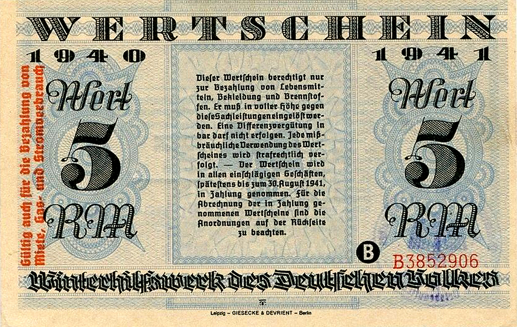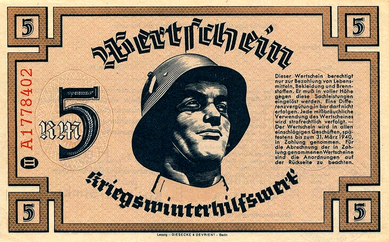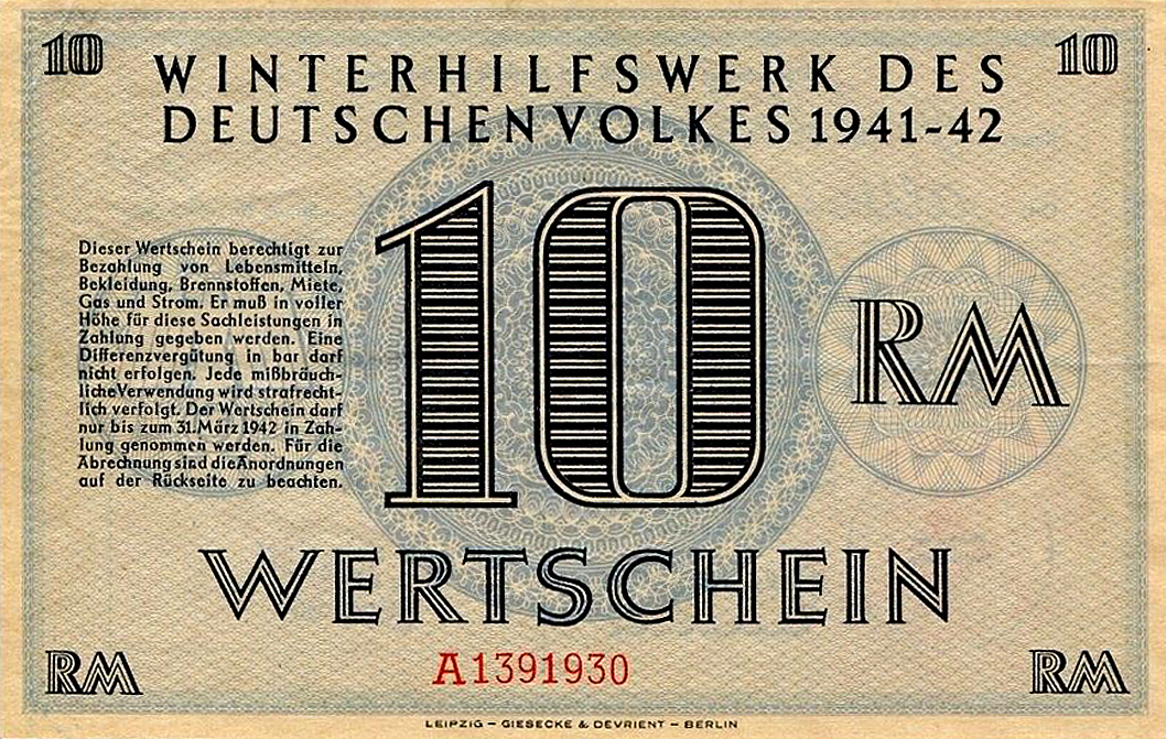 [Below: 3 RM, 1945. This is another one done by the 'Nationalsozialistische Volkswohlfahrt' (The National Socialist People's Welfare). Gau Niederschlesien. Front.]