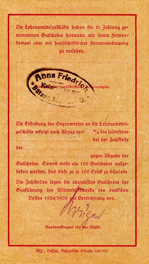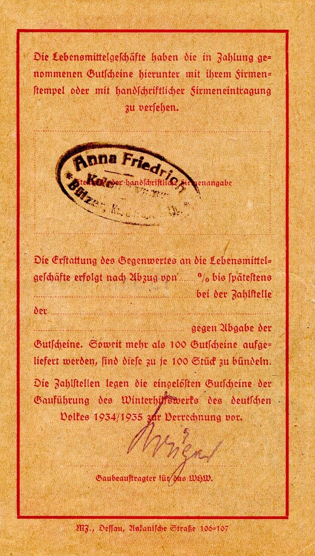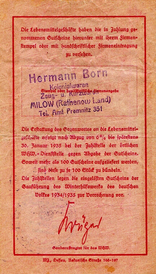 [Below: This is considered a type 2 ration coupon from Milow, Germany. 1934/35. Front/reverse.]