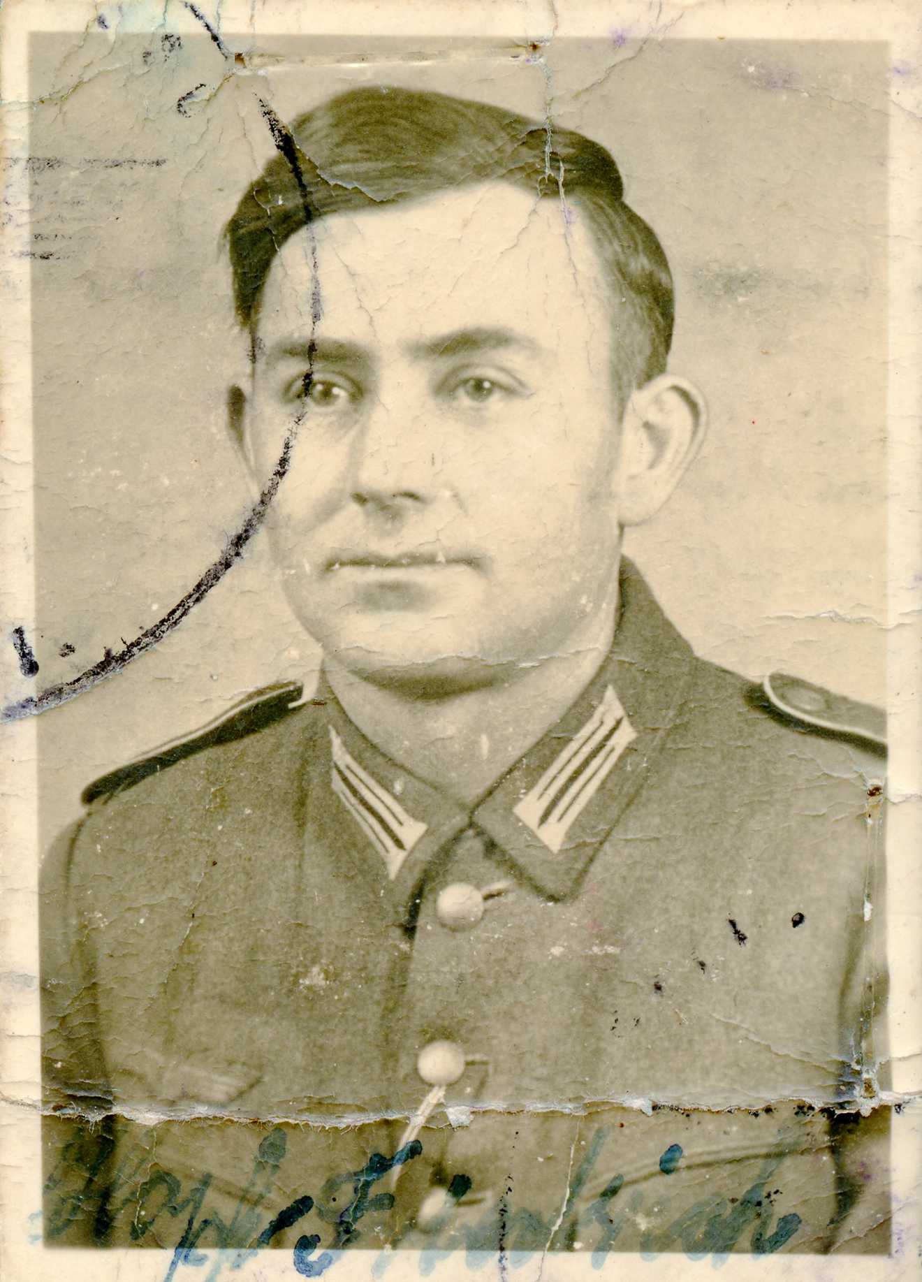 [Below: Oh wow, this is signed Friedrich Hopf, so now we know who owned this book. This was taken from a photo ID card, you can see the staple holes. So, I think this book was actually distributed under the Allied occupation, to Herr Hopf, who was a German P.O.W. in an Allied concentration camp. Click to enlarge.]