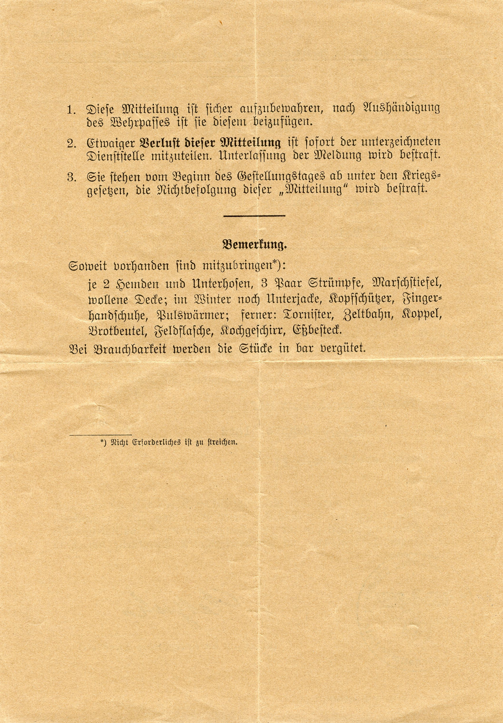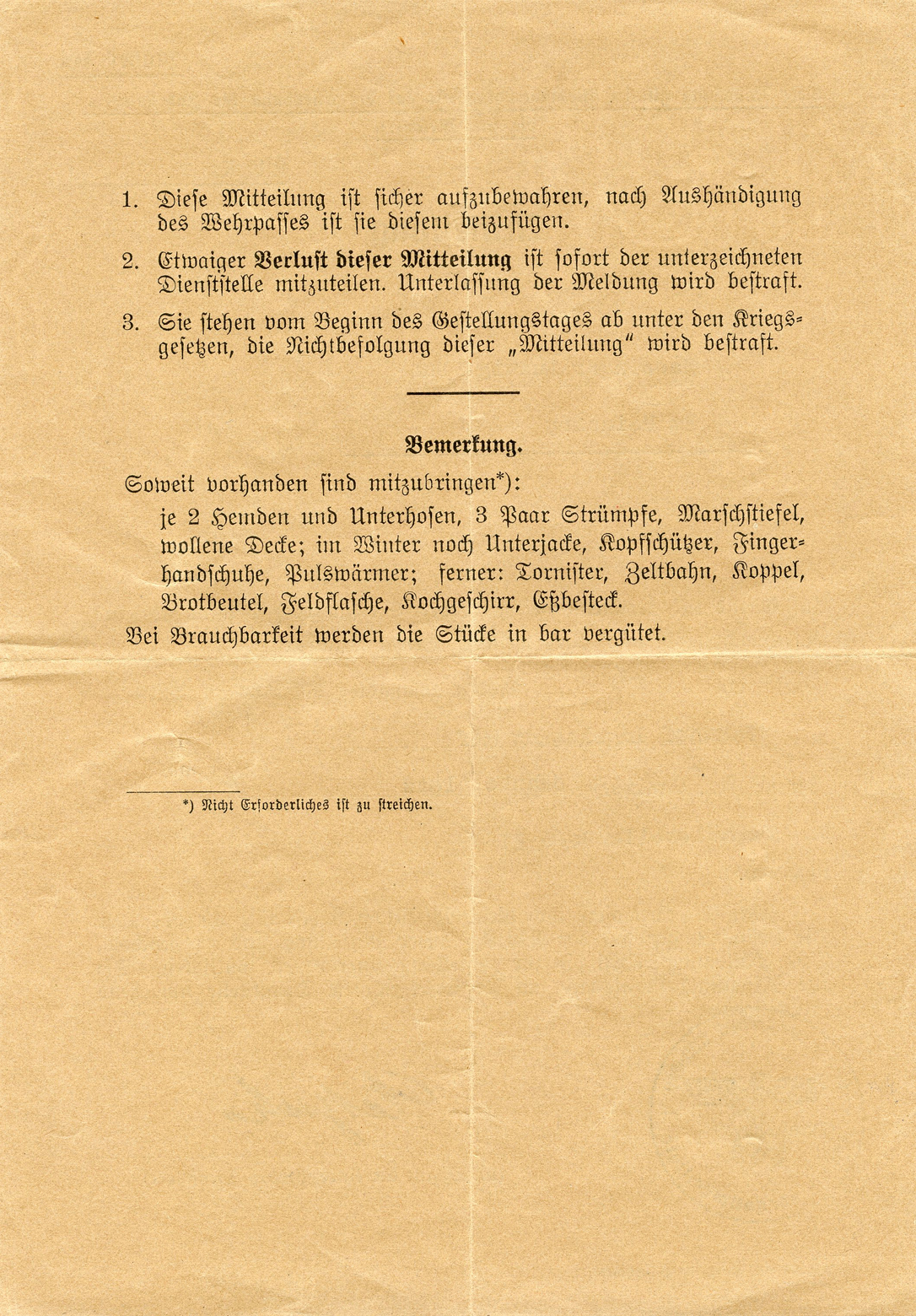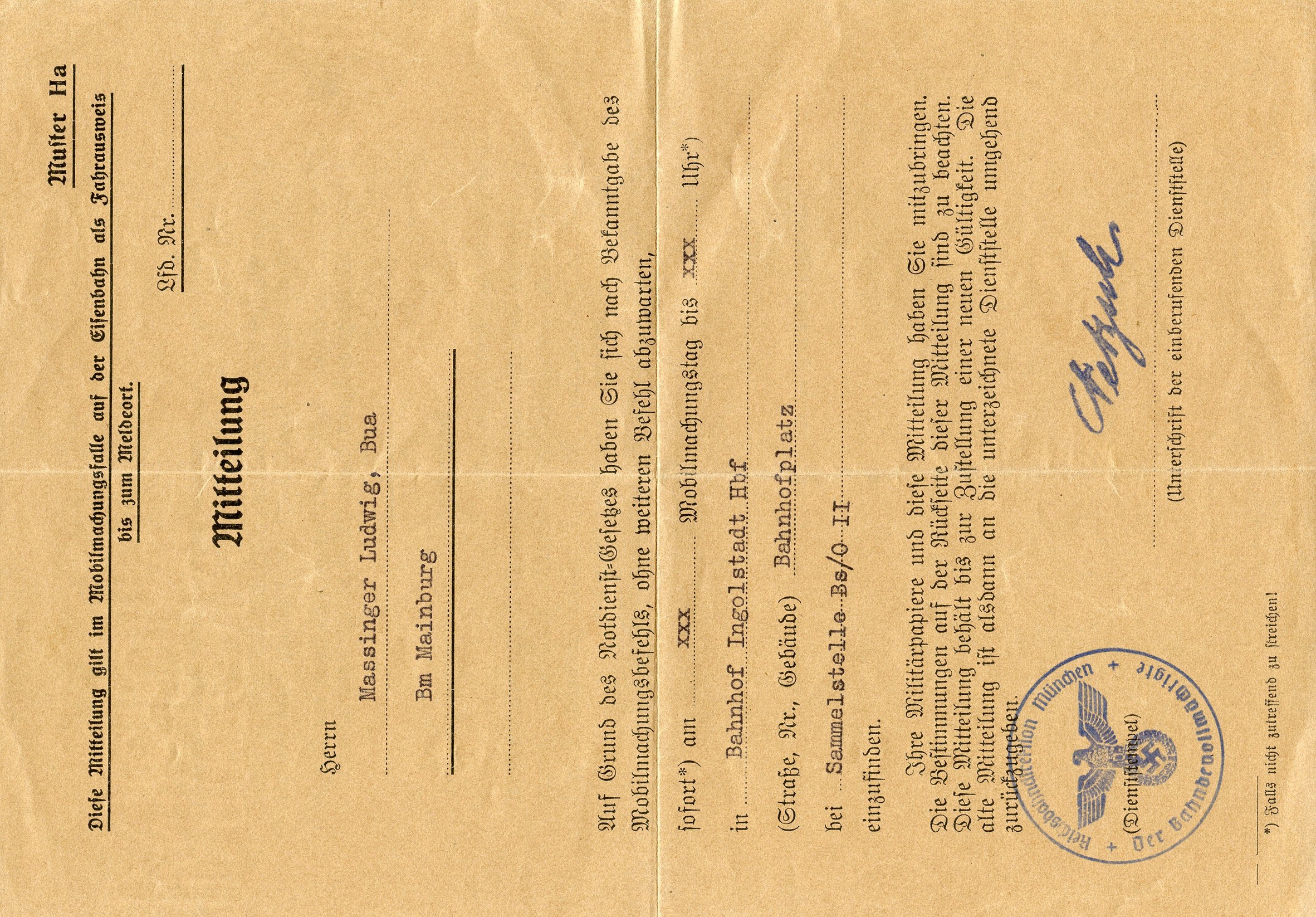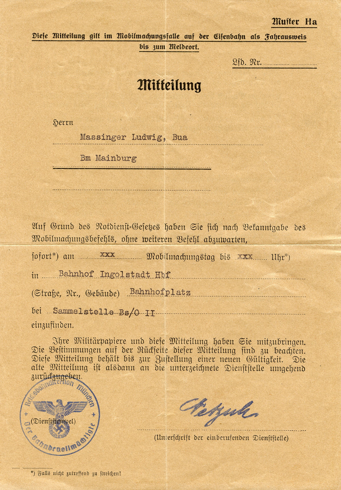 'According to the Emergency Service Act, after the mobilization order has been accounced, without waiting for further orders, immediately on XXX mobilization day by XXX o'clock report to Ingolstadt Central Station.'