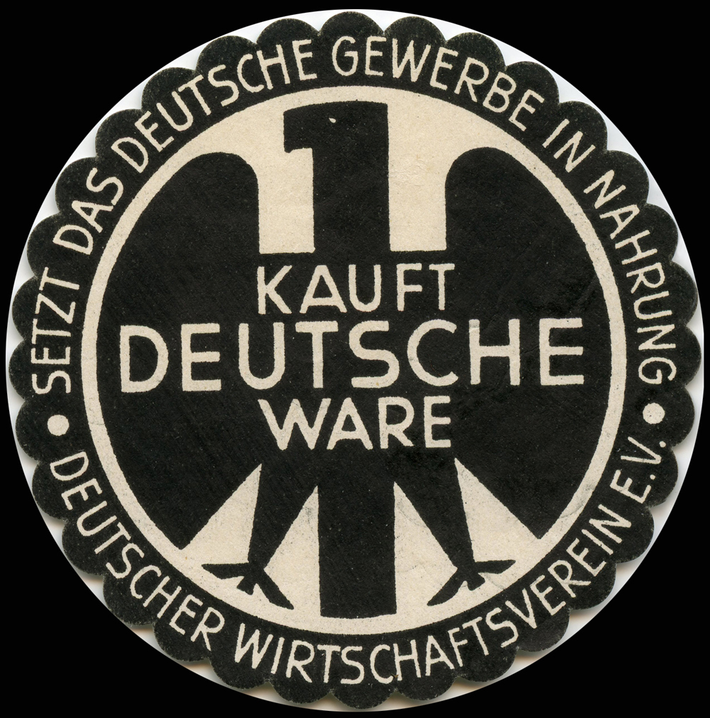 [Below: This stamp is huge. It says: 'Setzt das Deutsche Gewerbe in Nahrung - Kauft Deutsche Ware - Deutscher Wirtschaftsverein E.V.' (Support German businesses in the food industry - Buy German goods - German Business Association). Click to enlarge.]