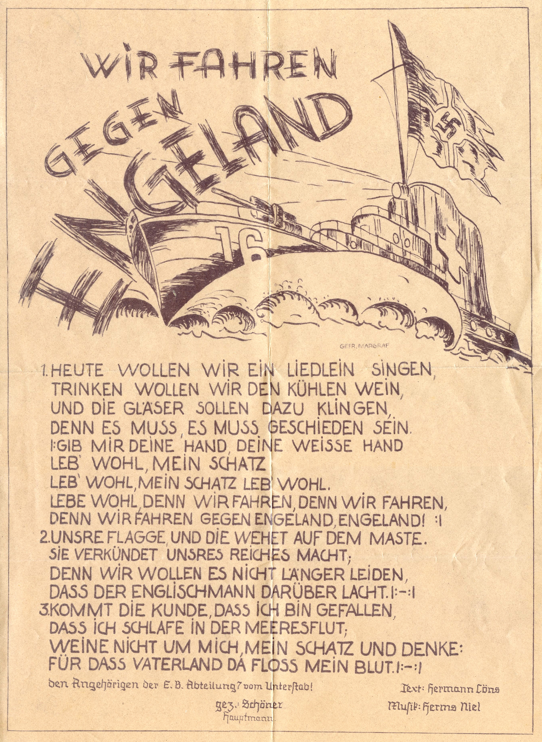 [Below: This is a poster taken from a German Kriegsmarine patriotic song called 'Wir Fahren Gegen England' (We are Sailing Against England). The lyrics are written by Hermann Löns, who wrote the famous book Der Wehrwolf. Click to enlarge.]