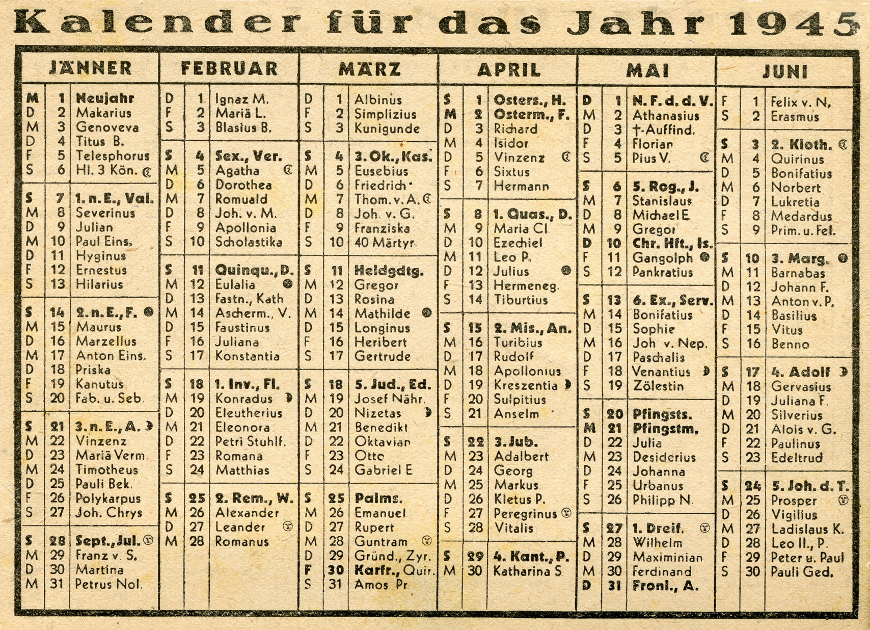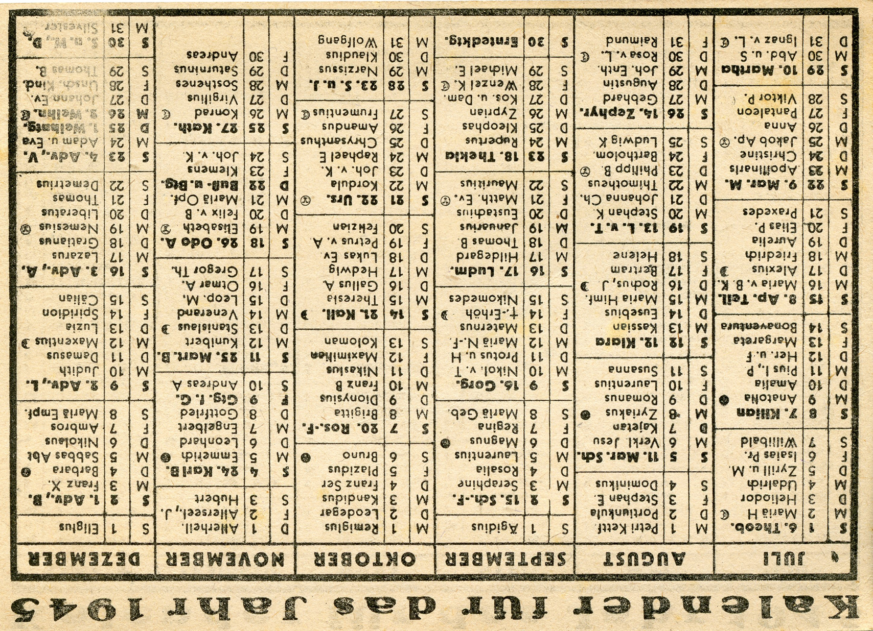 [Below: Pocket calendar for the dreadful year of 1945. This is about the size of a postcard and lists the names of many saints. Click to enlarge.]