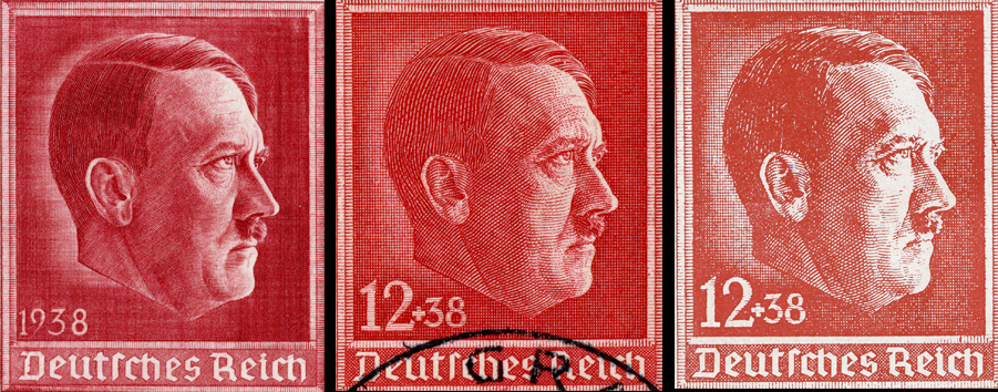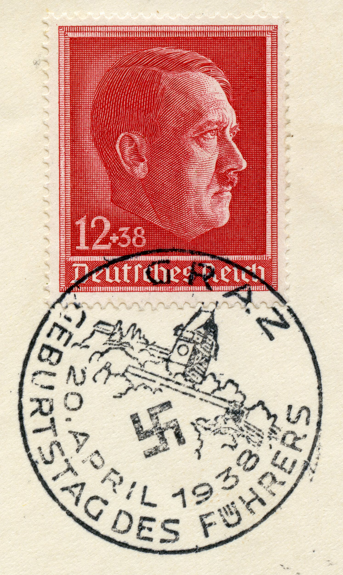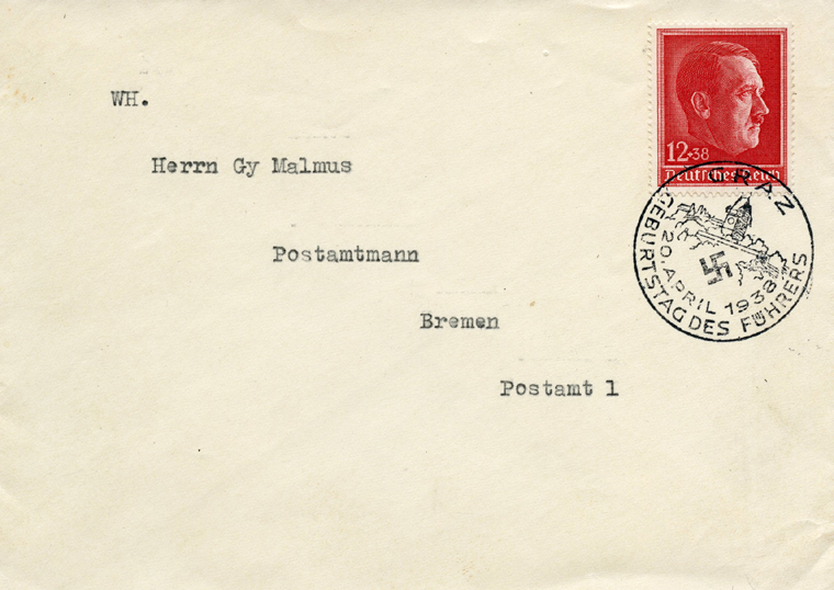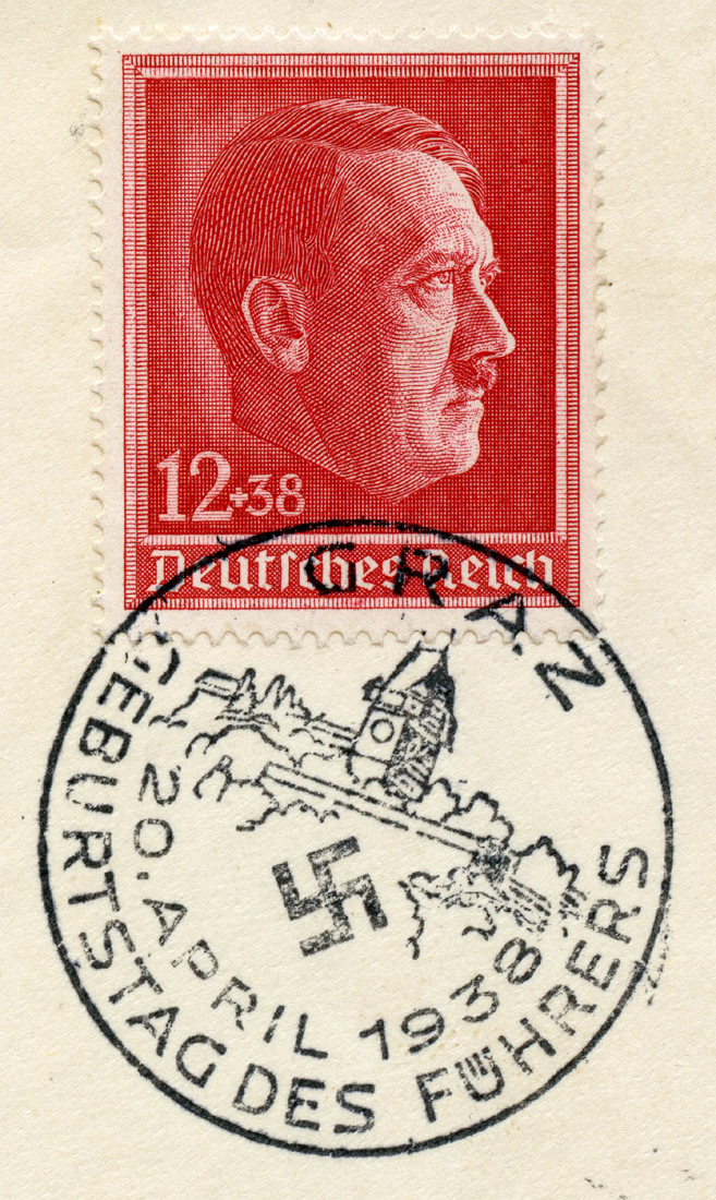 [Below: Envelope showing the design, postmarked in Graz, on Adolf Hitler's birthday, April 20, 1938. Graz is the second largest city in Austria.]