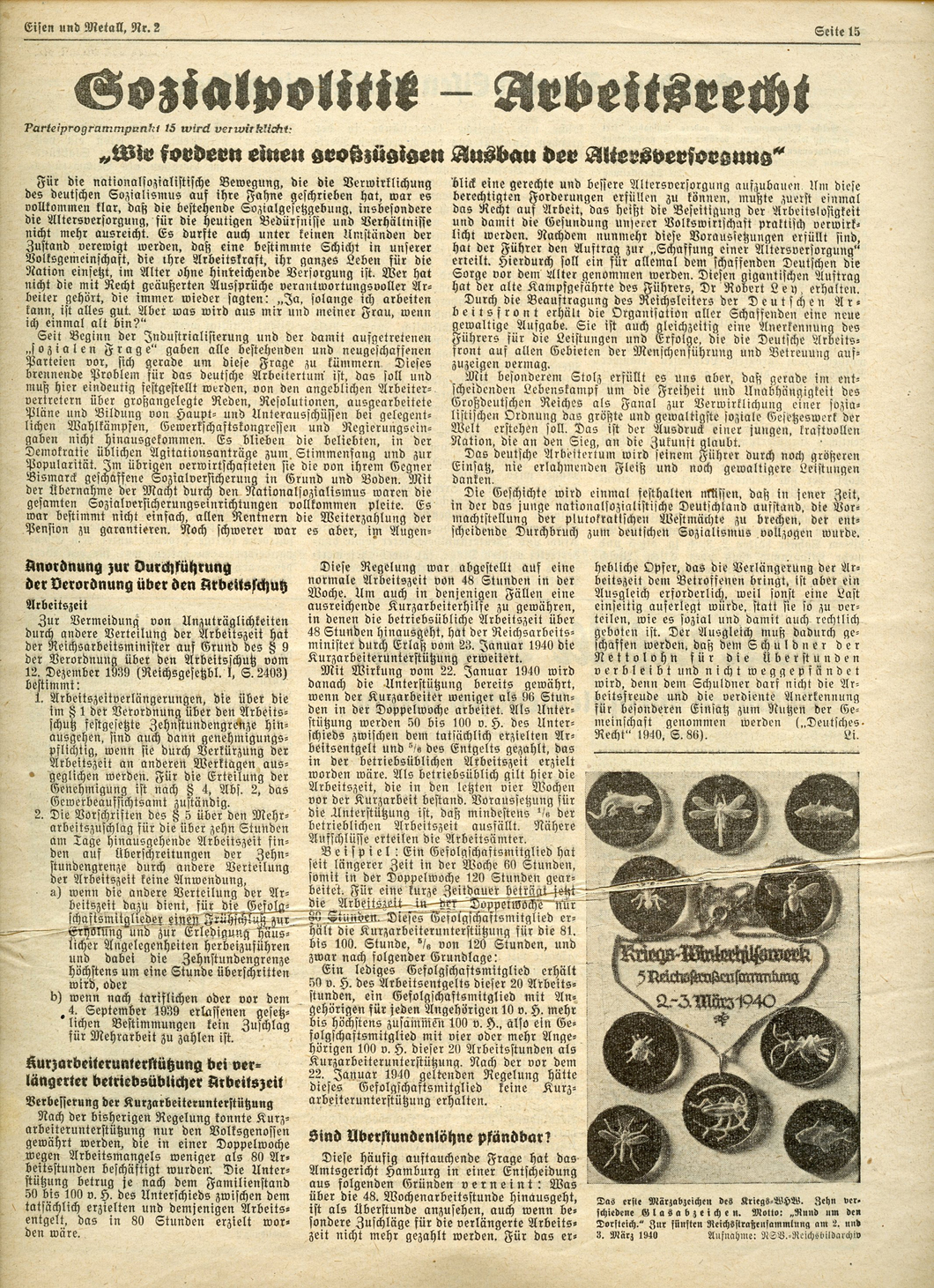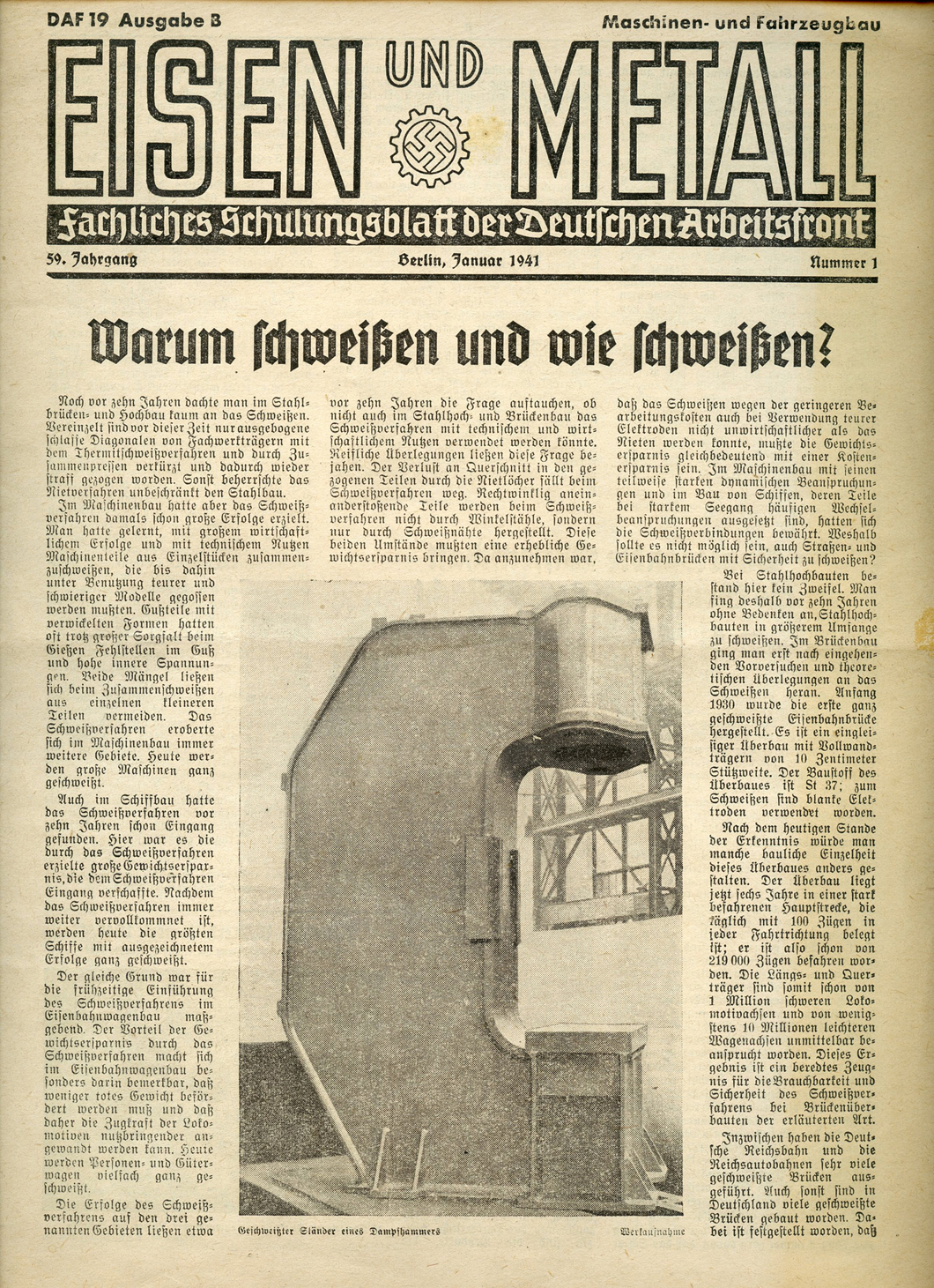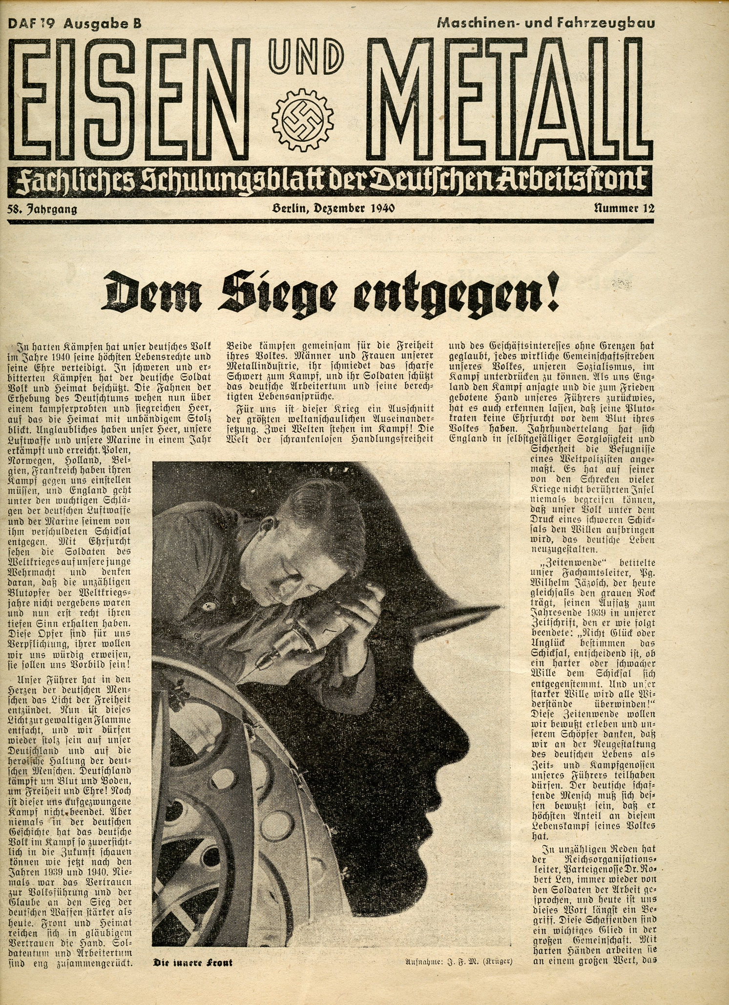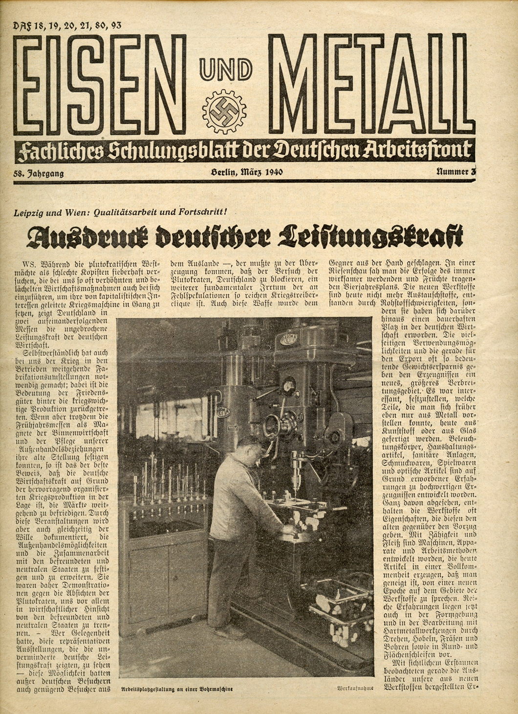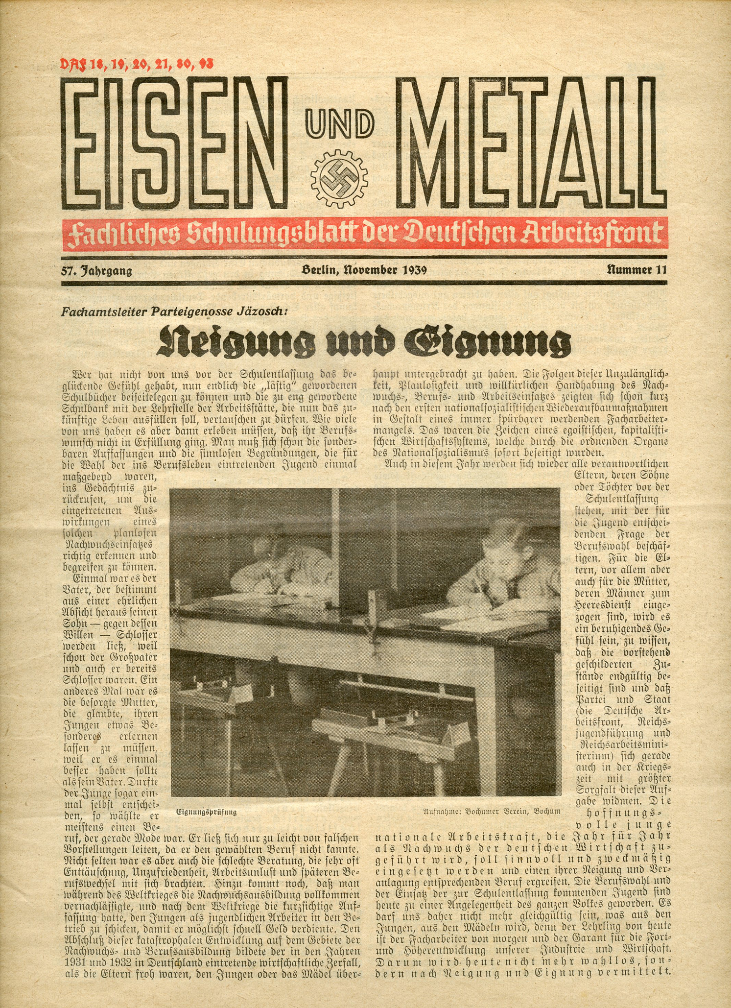 [Below: Below are a selection of rare DAF newspapers, entitled 'Eisen und Metall - Fachliches Schulungsblatt der Deutschen Arbeitsfront' (Iron and Metal - Professional Training Sheet of the German Labor Front), November 1939.]