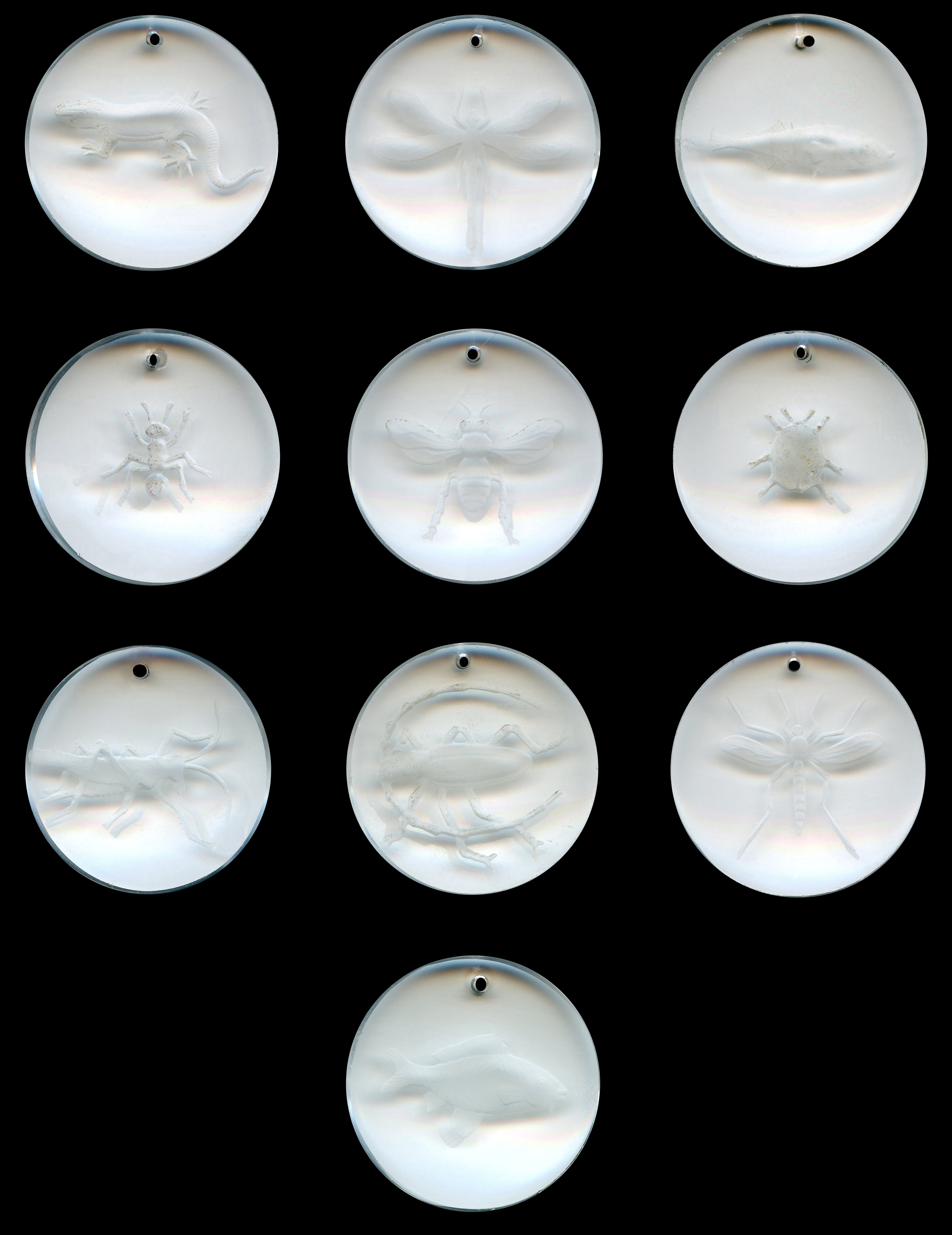 [Below: Here are the glass WHW donation pendants pictured above! Isn't it cool to see a modern picture of these? Luckily I had a complete collection of them. The ones pictured above are inverted, for whatever reason. The etching job for something mass produced and released in 1940 is very good. These are about the size of an American quarter, or about one inch. I believe when these were released they were actually painted, but very few survive with their paint intact.]