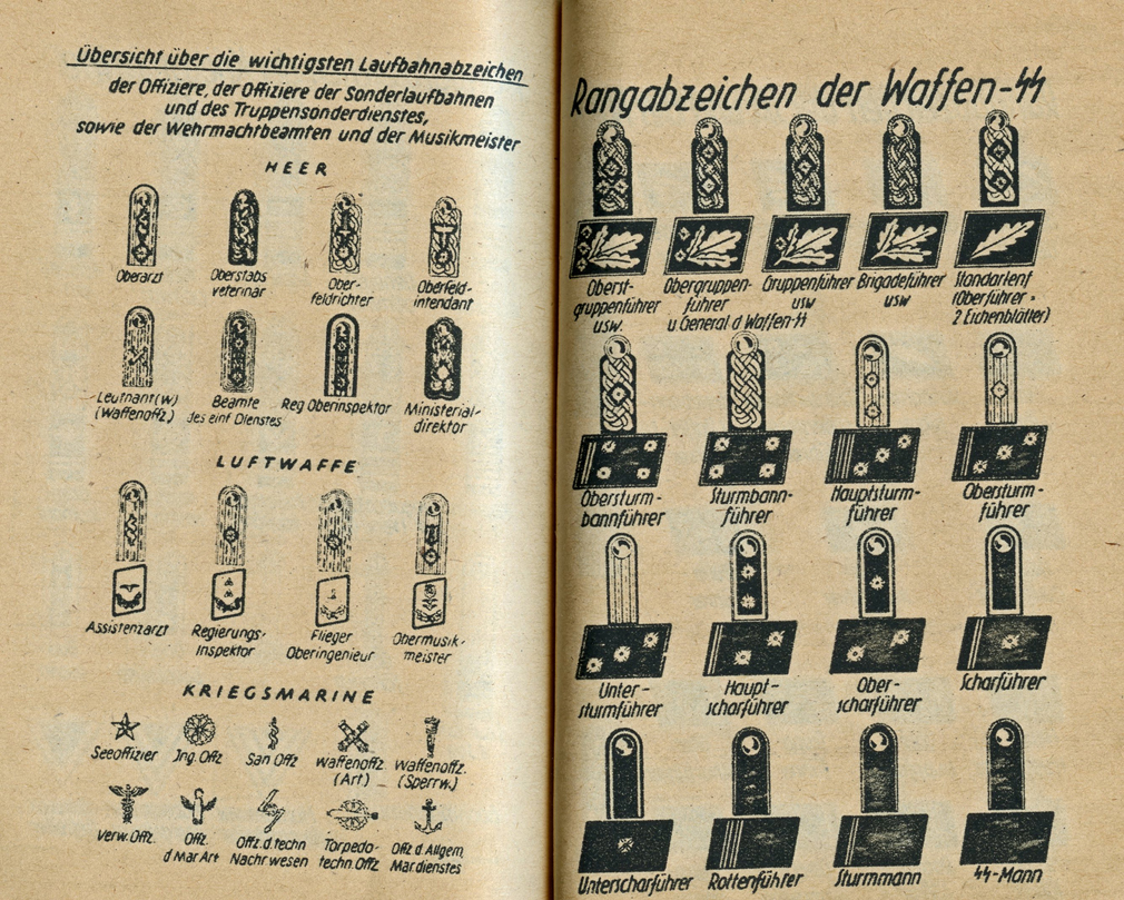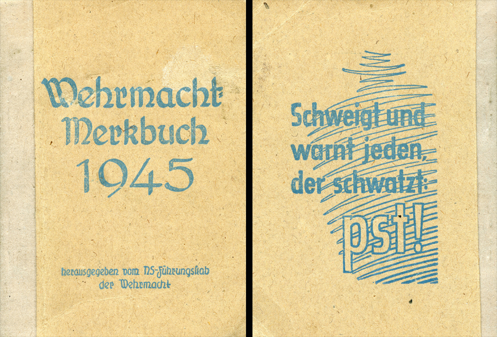 [Below: Front and reverse. This tiny book is called 'Wehrmacht Merkbuch 1945' (Wehrmacht Handbook 1945) published by 'Herausgegeben vom NS-Führungsstab der Wehrmacht' (Published by the NS Leadership Staff of the Wehrmacht). The reverse of the book reminds soldiers 'Schweigt und warnt jeden der schwatzt: pst!' (Be silent and warn everyone who chatters: shh!). This is a really neat book and tiny! It would fit in the palm of your hand. It was difficult to scan since the pages don't open wide, so I did my best to give you an idea of the material within. This book has a little bit of everything; a day planner, calendars, facts and information of all kinds. Click the image to see a lot more.]