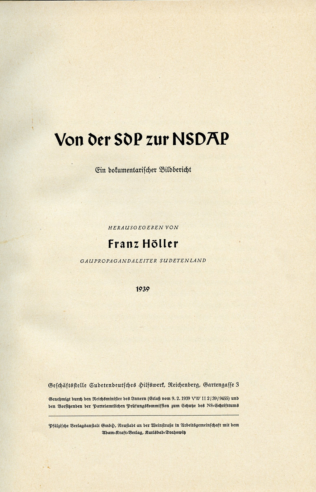 [Below: An important book on understanding the 1938 'Sudetenland Crisis', entitled 'Von der SDP zur NSDAP - Ein dokumentarischer Bildbericht' (From the SDP to the NSDAP - A Documentary Pictorial Report), 120pgs, (c)1939. The initials 'SDP' stand for the 'Sudetendeutsche Partei' (The Sudeten German Party), created by the tireless National Socialist fighter Konrad Henlein. Click to see inside.]