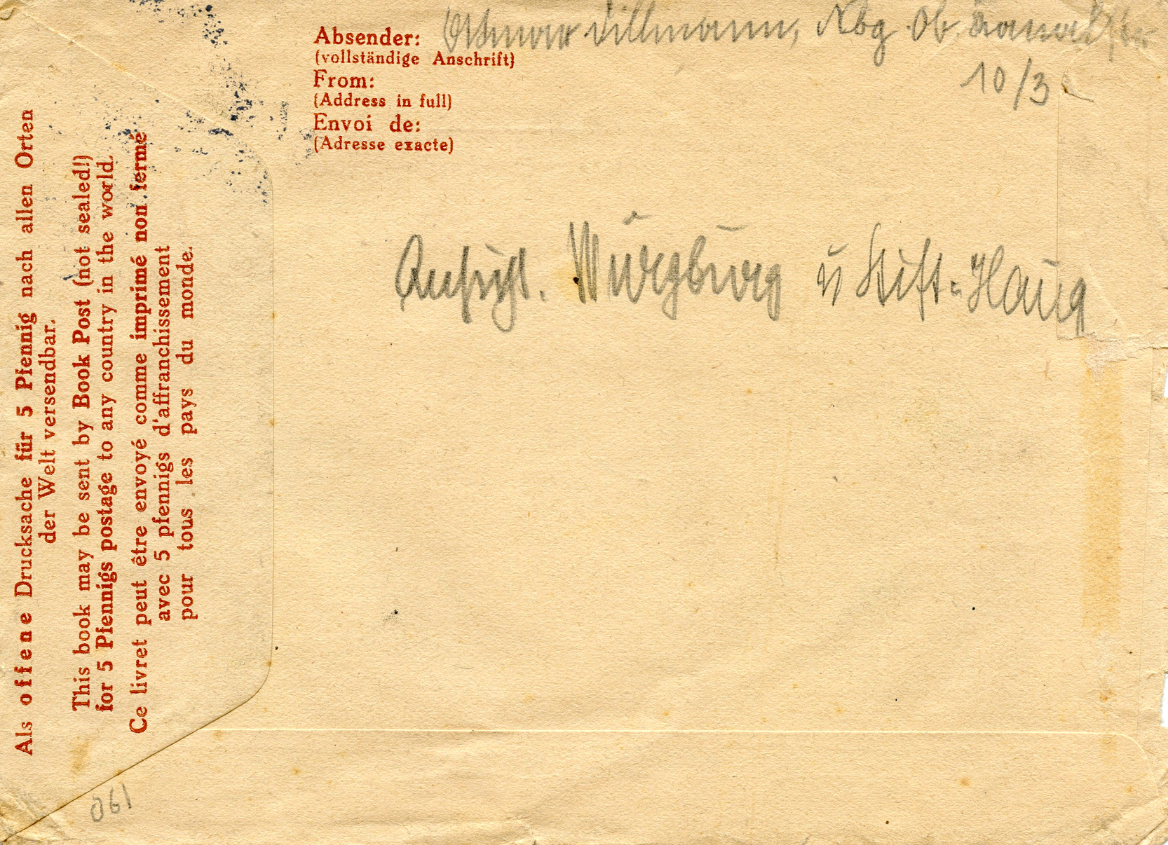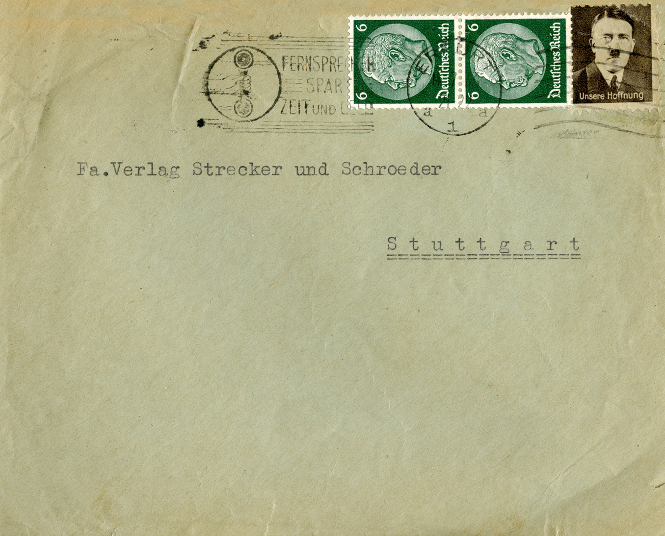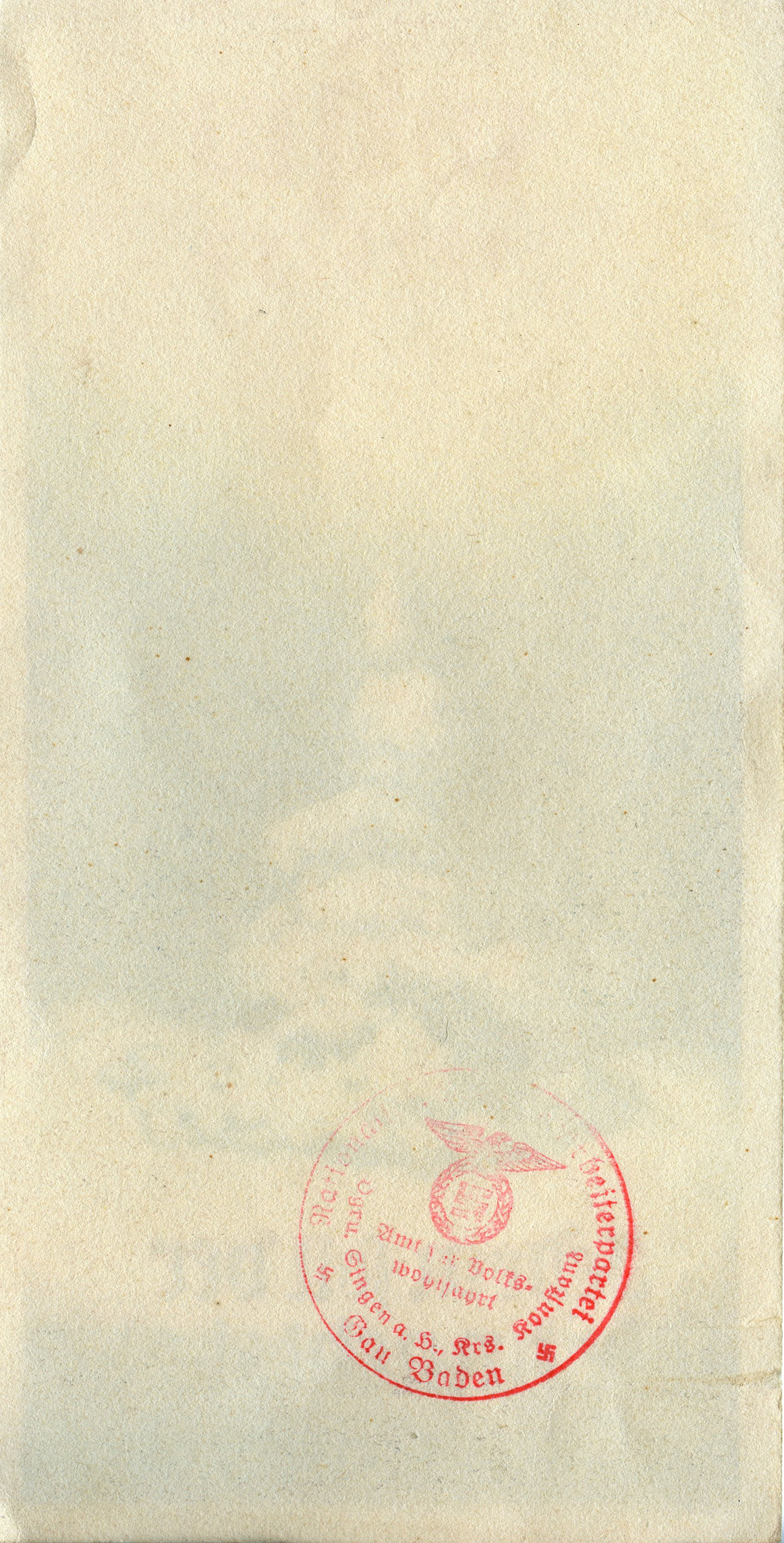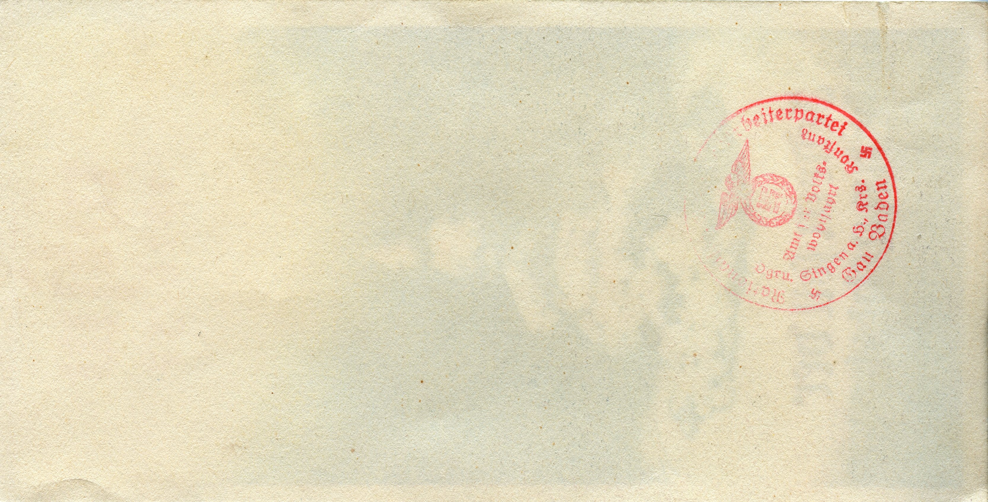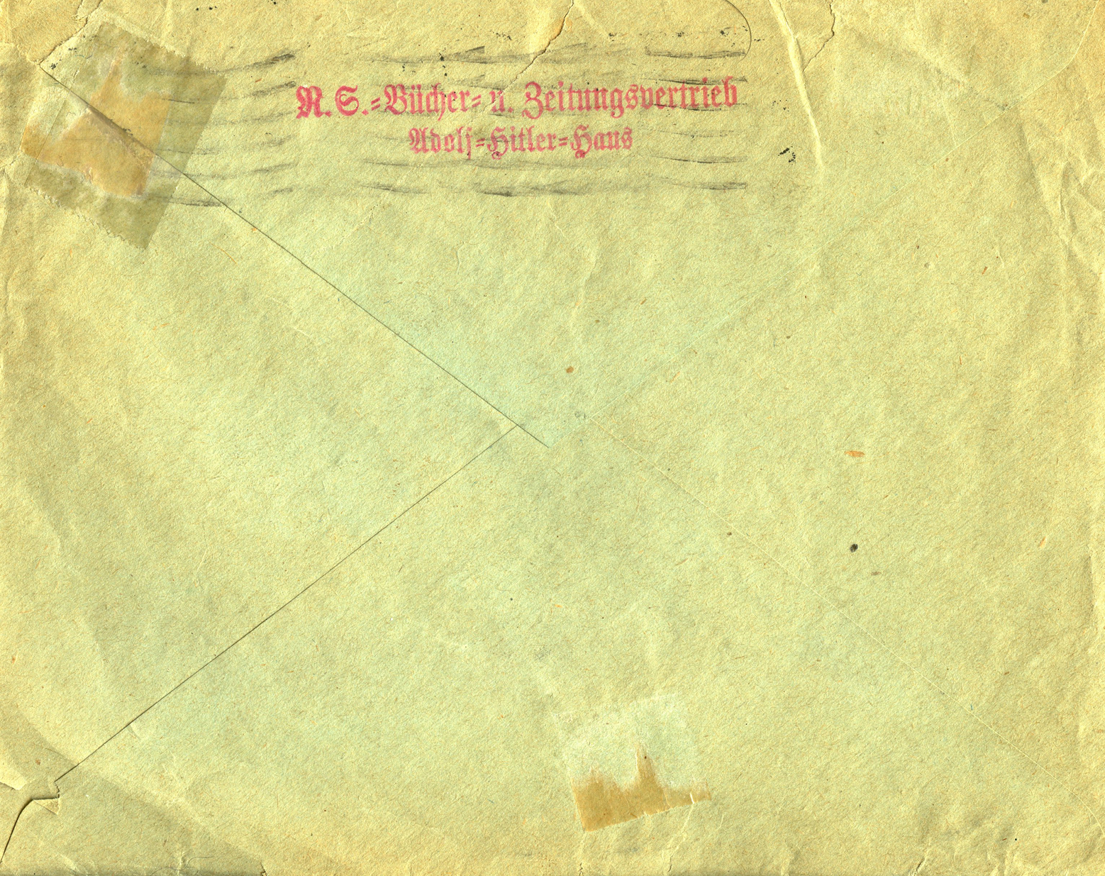 [Below: Reverse of envelope. This has an interesting return address, it says: 'N.S. Bücher u. Zeitungsvertrieb Adolf Hitler Haus' (N.S. Books and Newspaper Distribution Adolf Hitler House).]