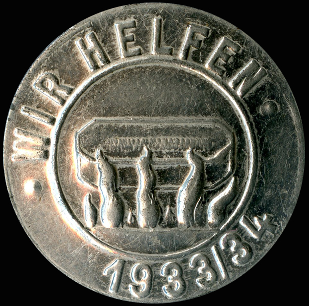 [Below: This pin (aluminum version) says: 'Wir Helfen 1933/34' (We Help 1933/34).]
