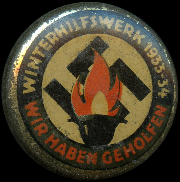 [Below: This steel pin, from 1933-34, says: 'Wir Haben Geholfen' (We Helped.]