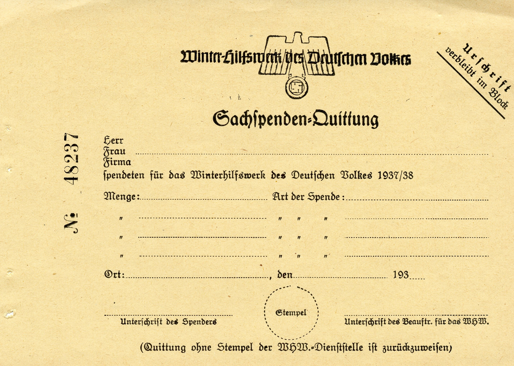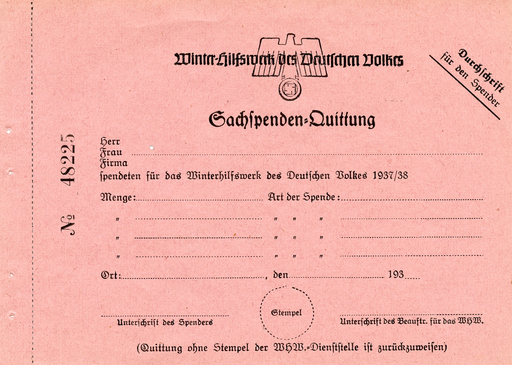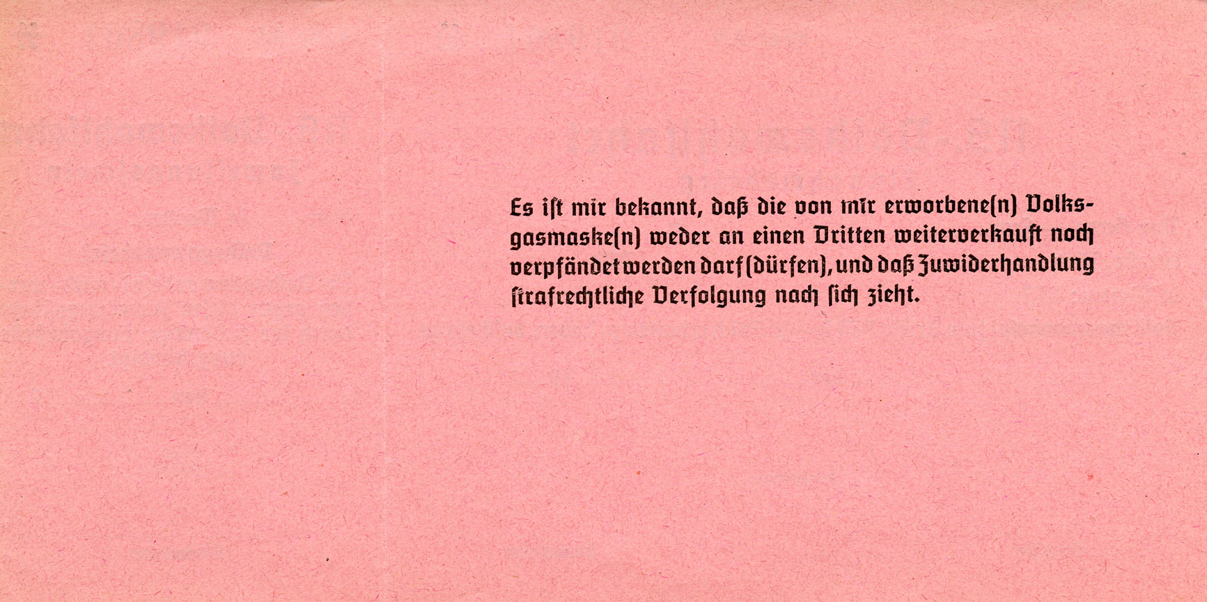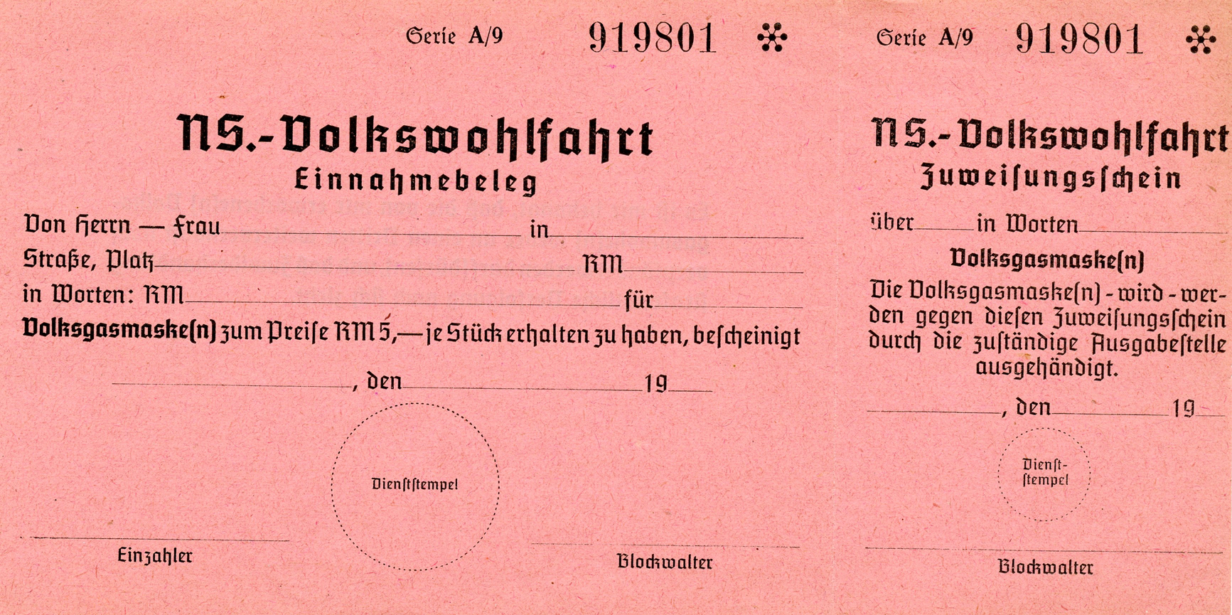[Below: While not from the WHW, this is from the Nationalsozialistische Volkswohlfahrt (National Socialist People's Welfare), or NSV. This is a form to purchase a People's Gas Mask for 5 RM.]