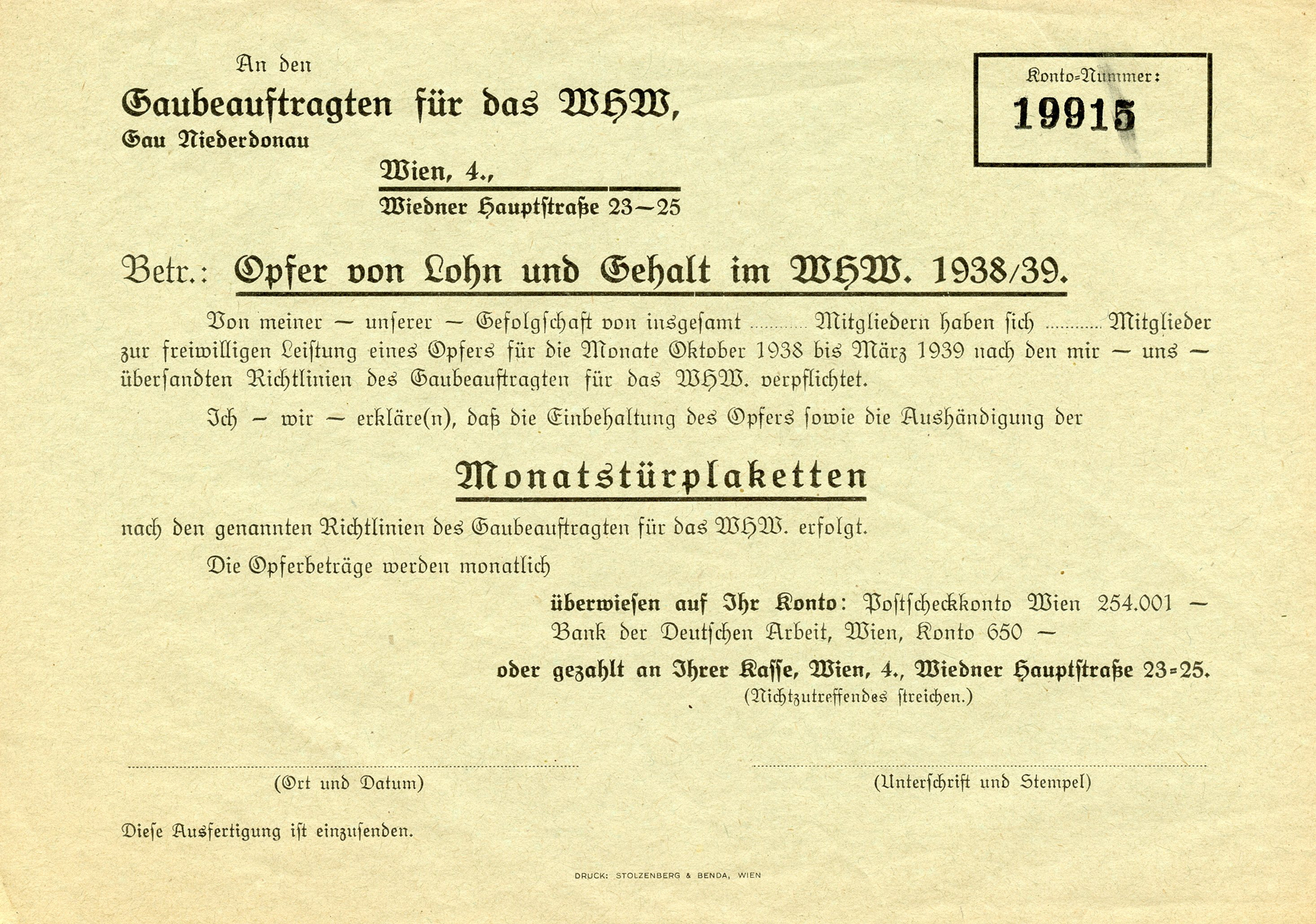 [Below: WHW 1938-39 donation form. This detailed the volunteering of a specific amount from your monthly wages.]