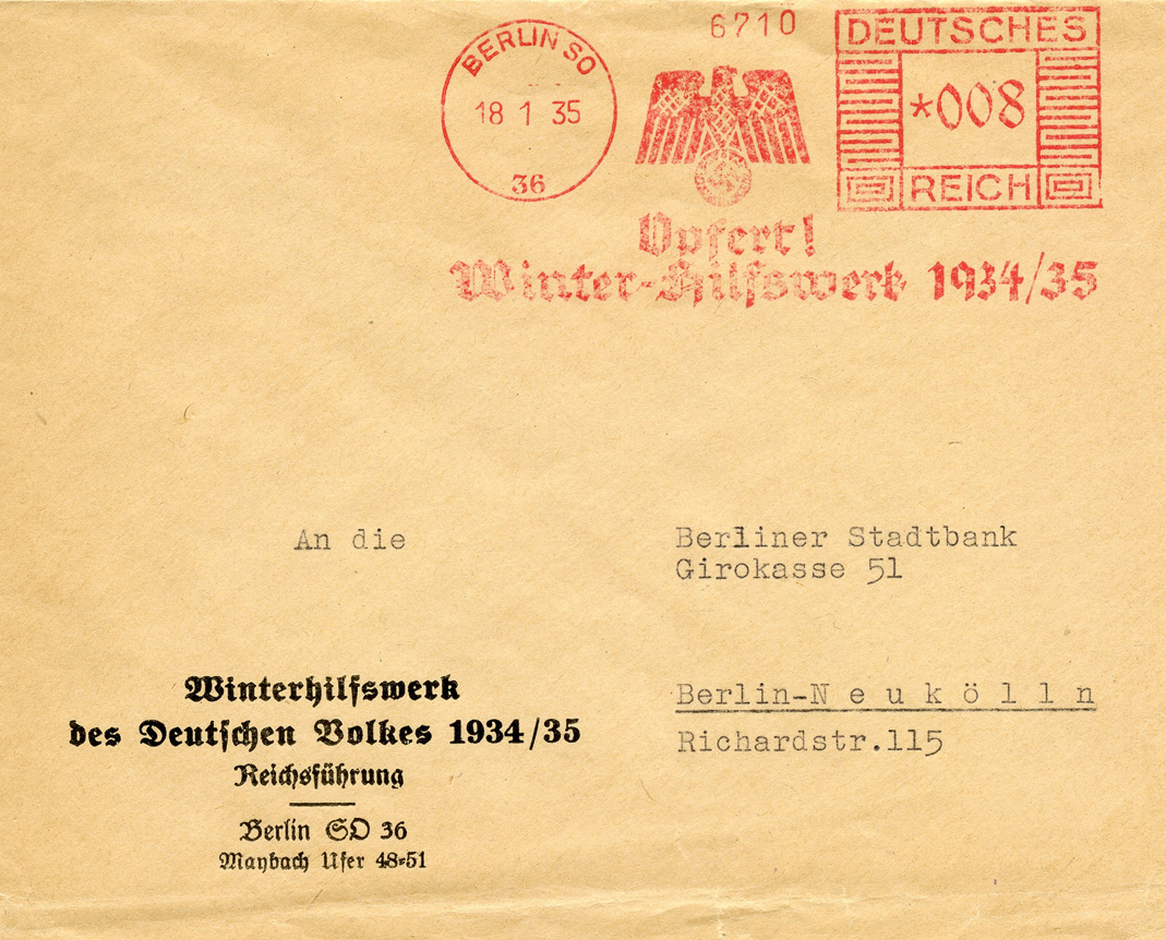 [Below: 1935 WHW meter mail from the Berlin WHW to the Berlin State Bank.]