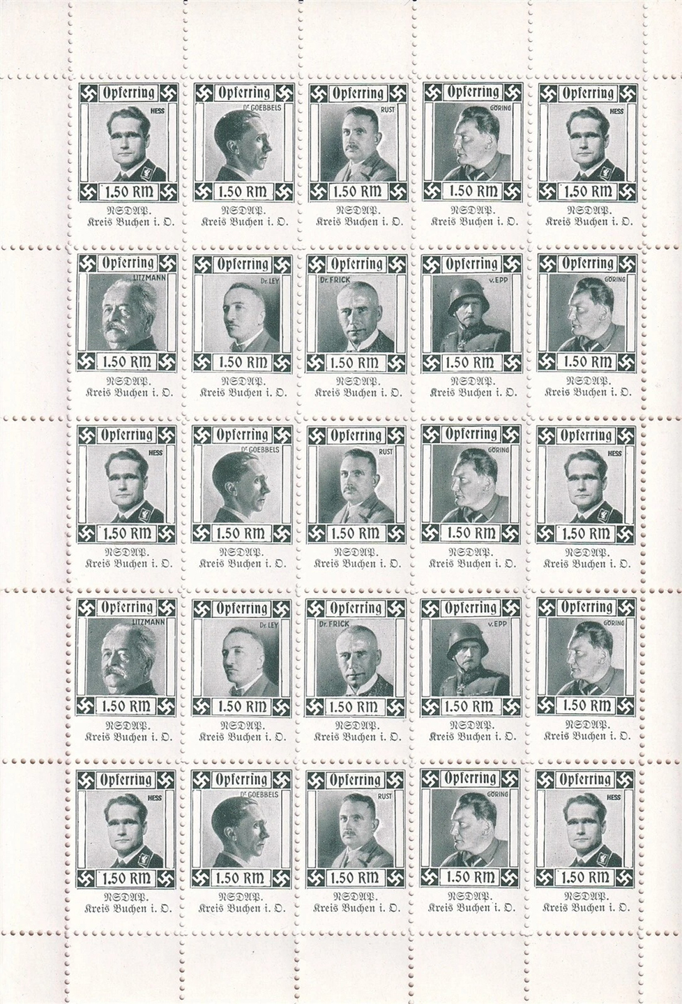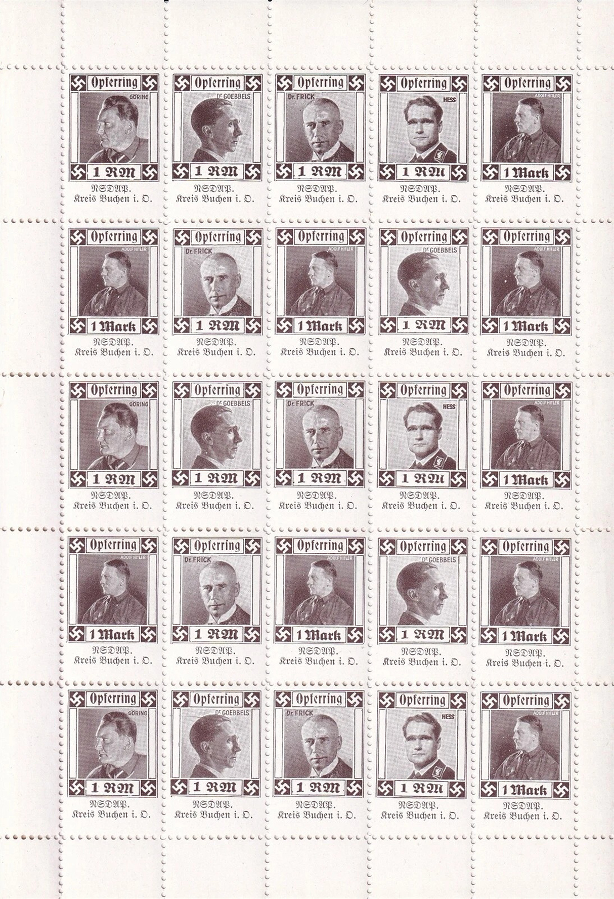 [Below: Very rare sheets of early NSDAP donation stamps.]