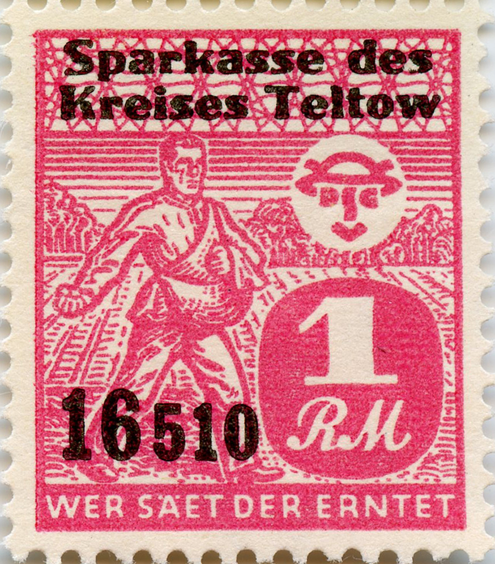[Below: Another savings stamp, this one says 'Sparkasse des Kreises Teltow - Wer Säet der Erntet' (Teltow District Savings Bank - He who sows reaps).]