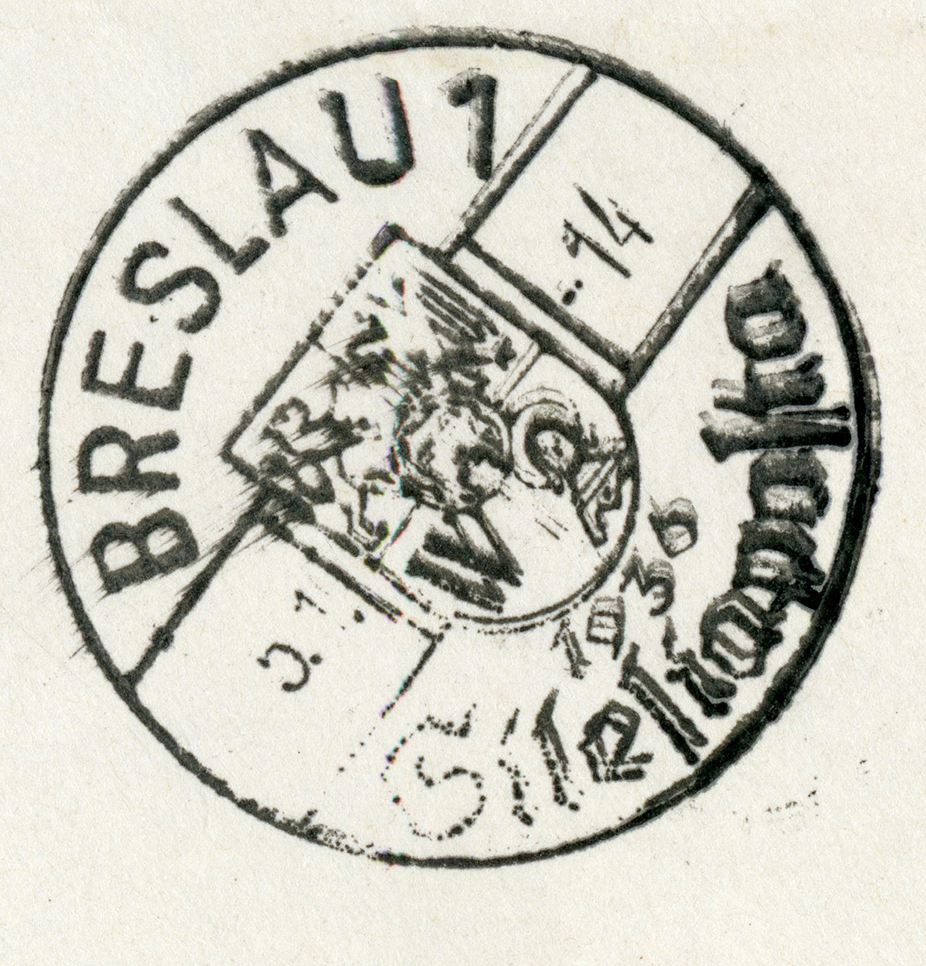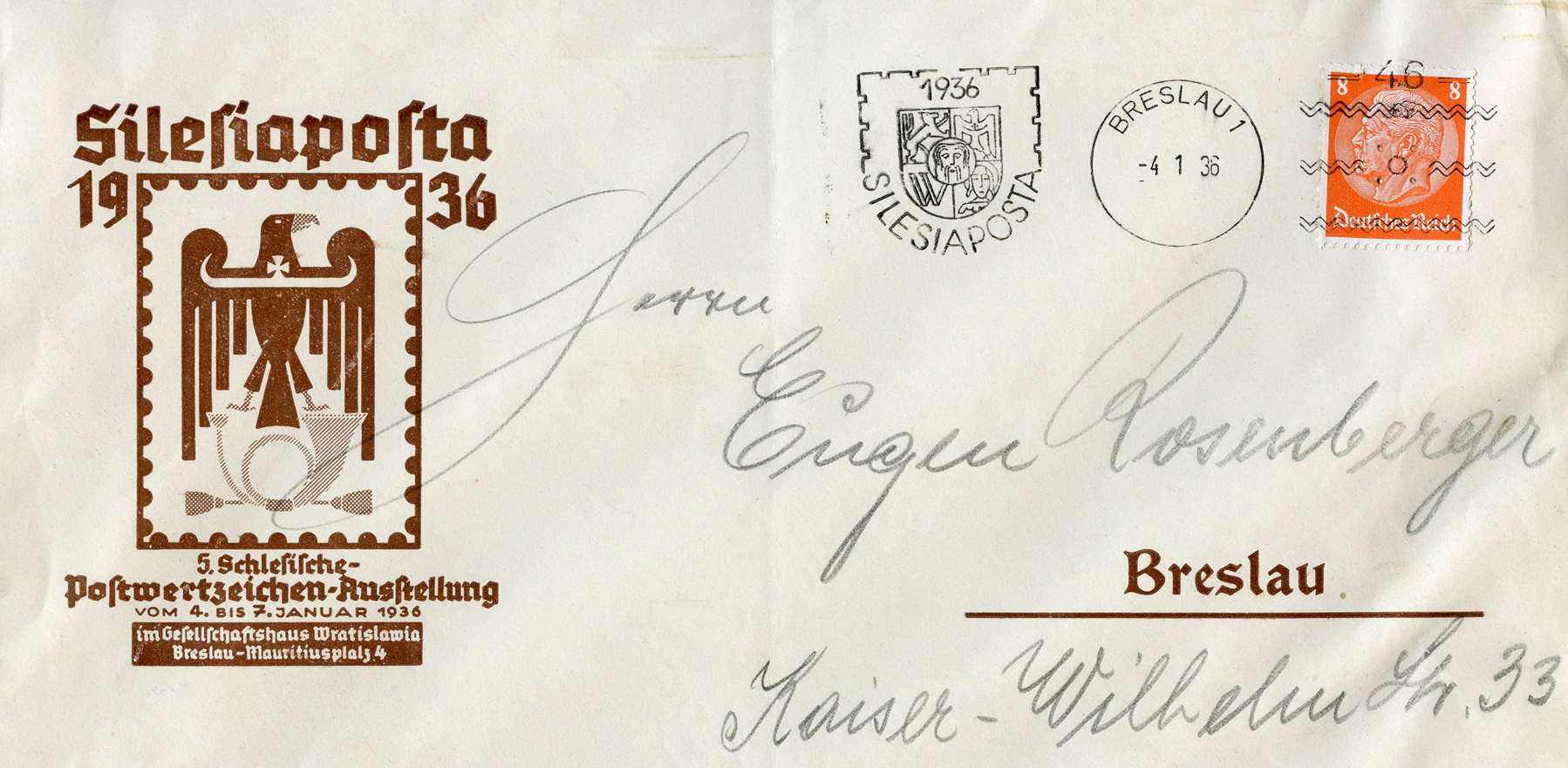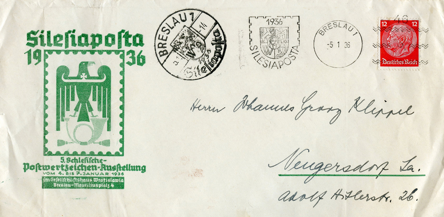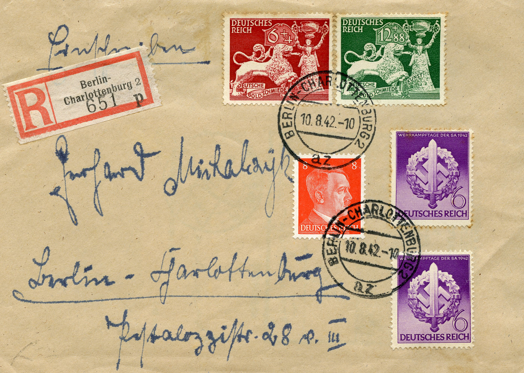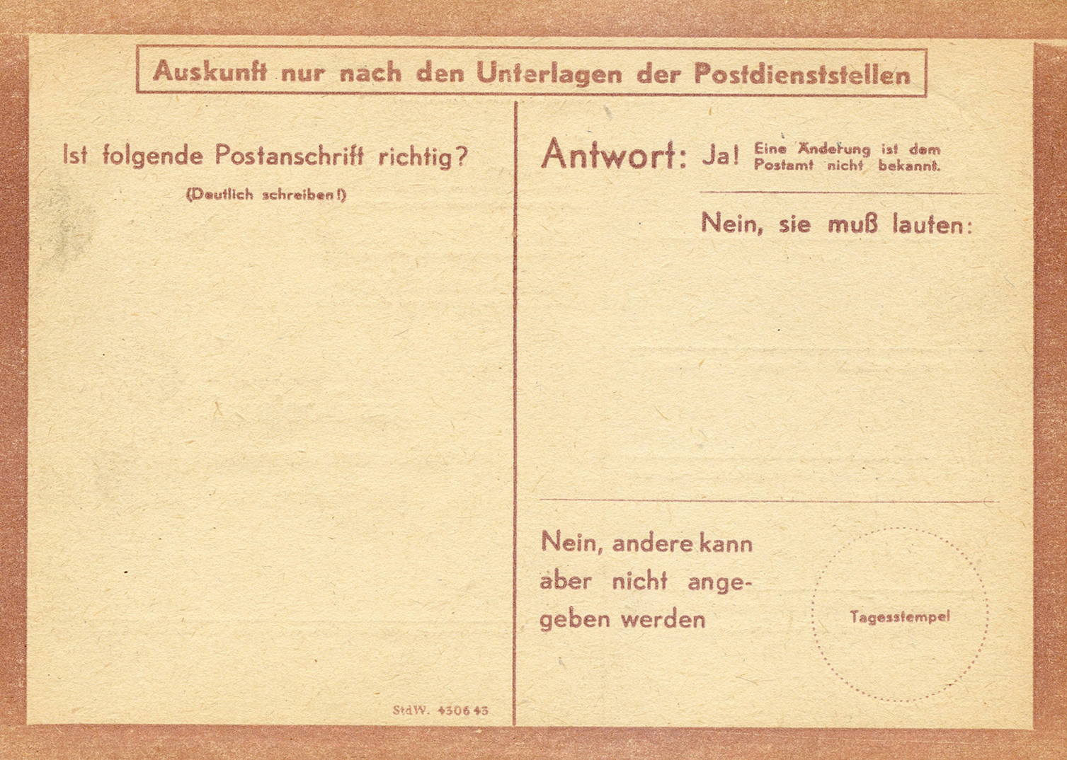 [Below: Sent to a different address -- Adolf Hitler Street, with a different cancel as well.]