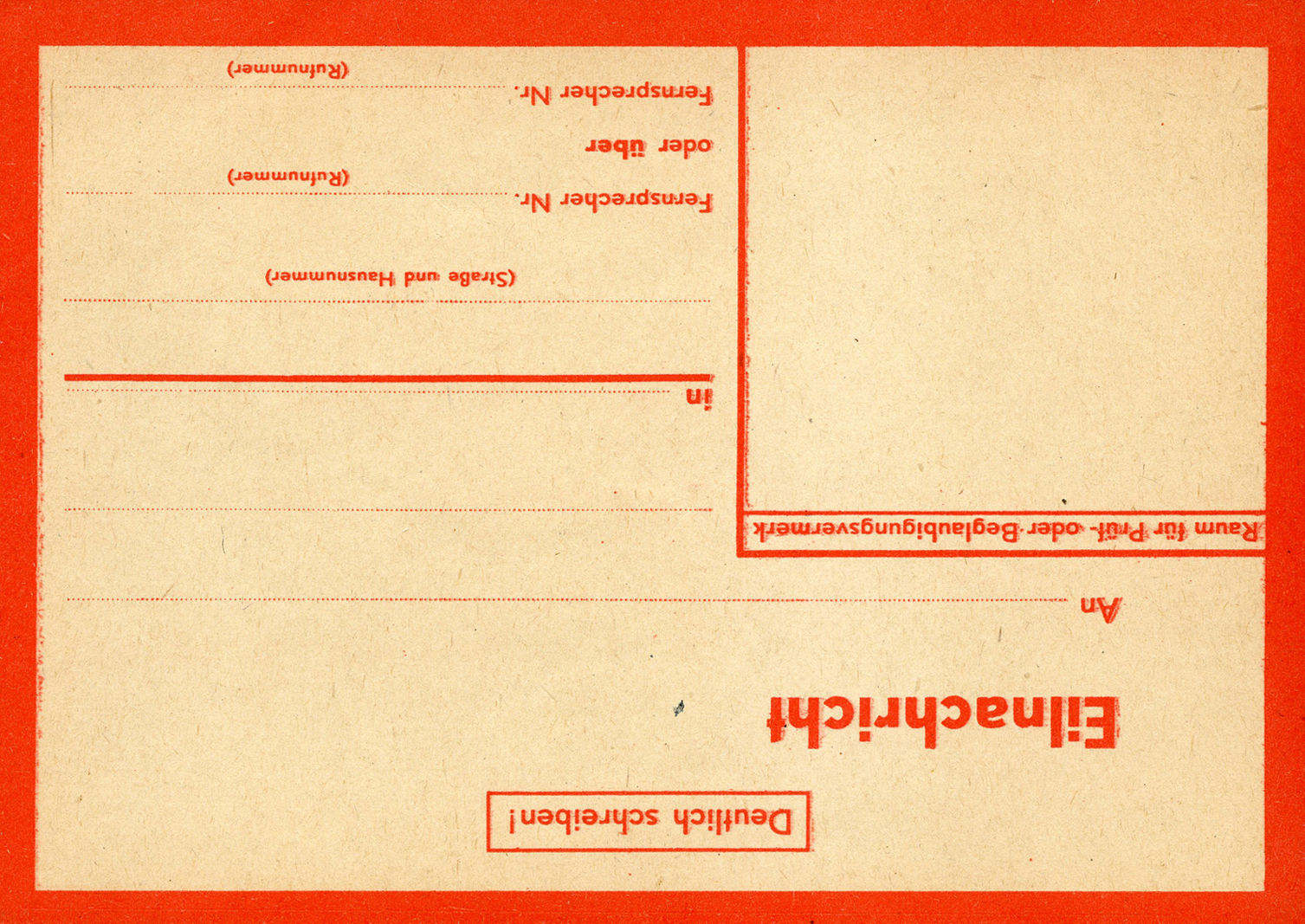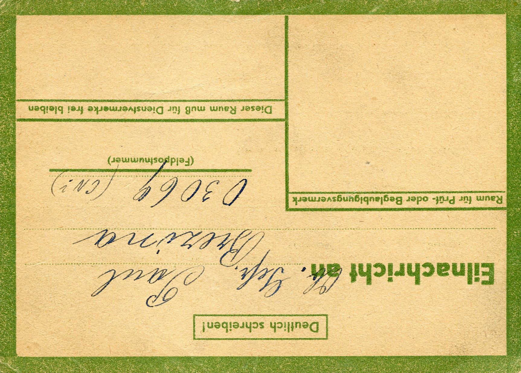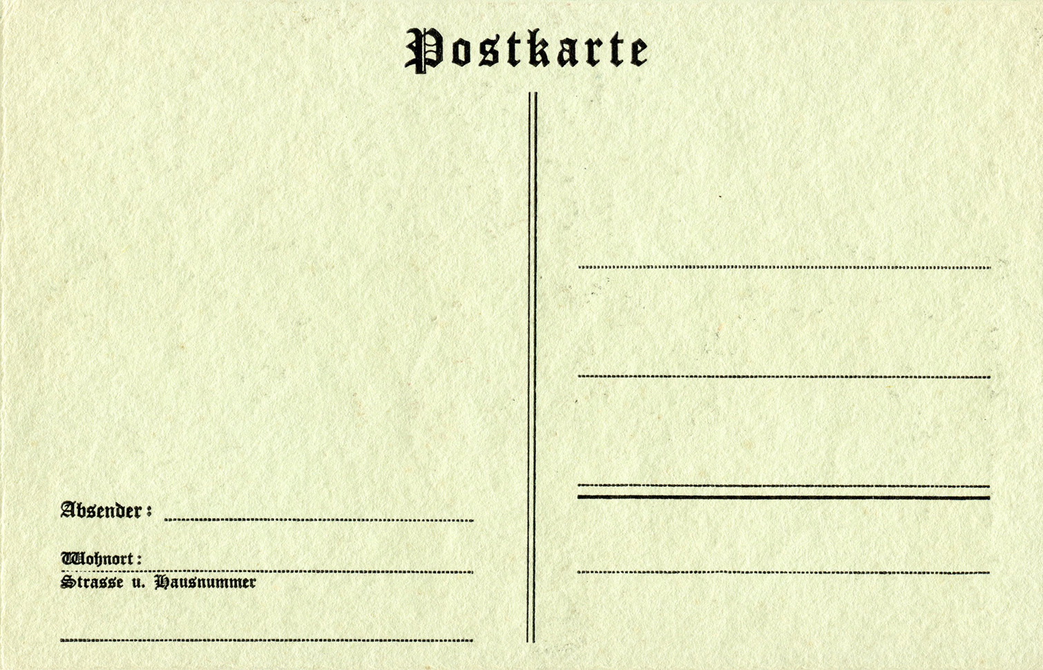 [Below: This postcard's text is the same as the green postcard above, minus the spot to write a Feldpost number.]