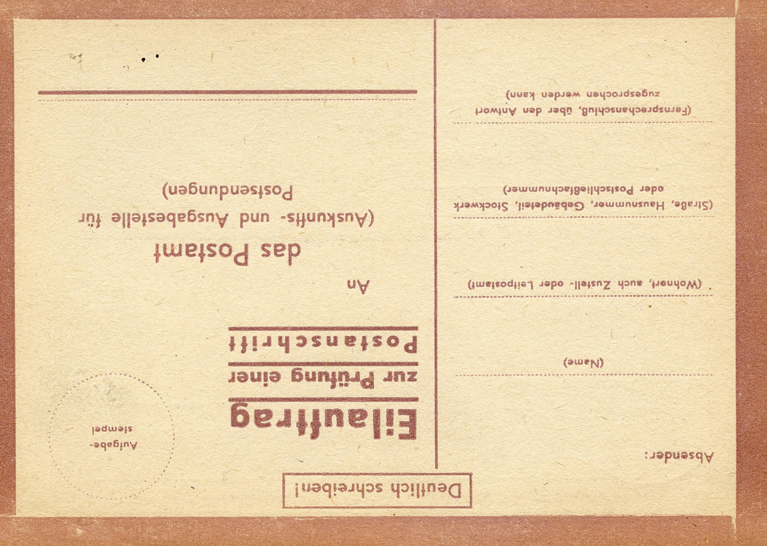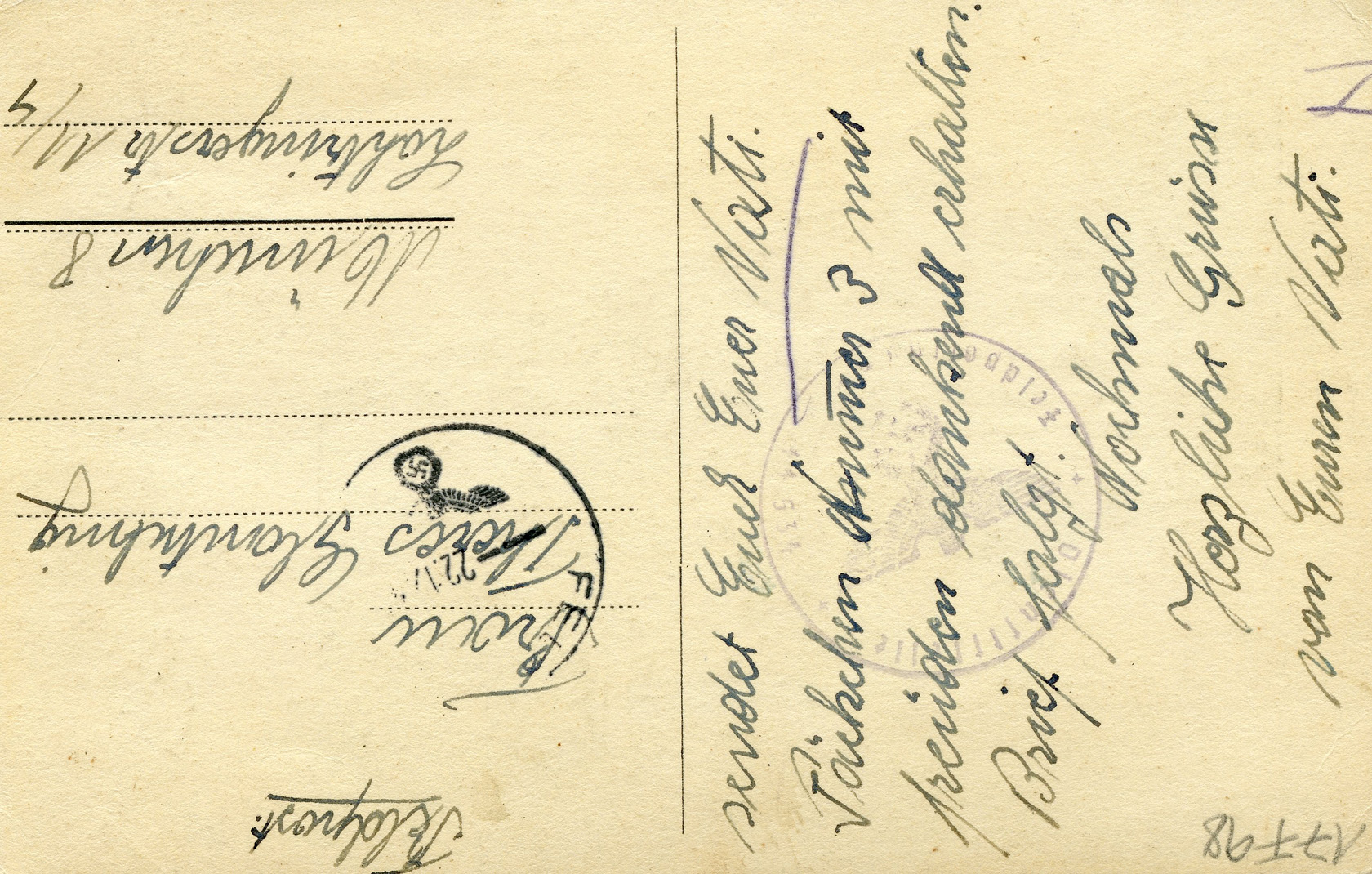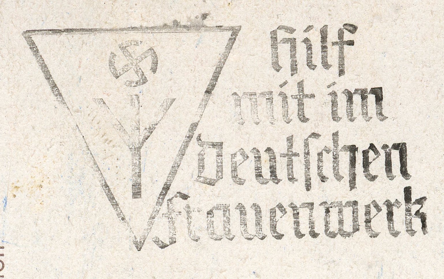 [Below: Reverse. Hey, they wrote the message upside down. That means whatever they wrote means the opposite of its meaning. This was postmarked on August 23, 1940 and has an interesting cancel, it says: 'Hilf mit im Deutschen Frauenwerk' (Help with the German Women's Work).]