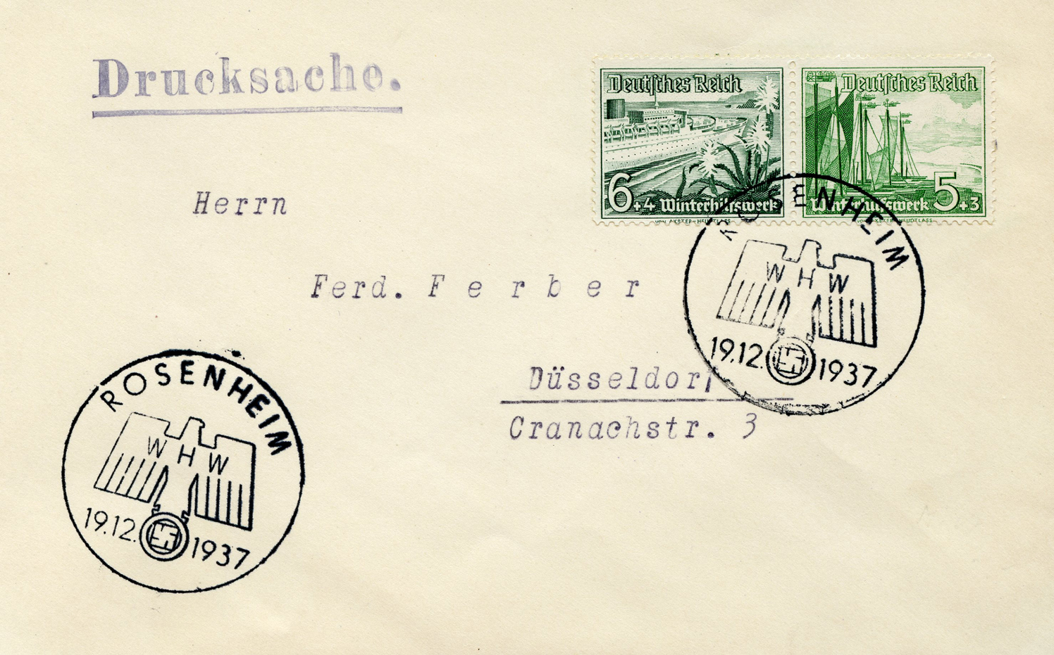 [Below: This pair of stamps are known as a se-tenants, which means when stamps of two different designs are connected. This normally didn't happen, usually it was only found from books of stamps, so it is uncommon, but not rare, used on envelopes. This also shows a nice pair of WHW (Winterhilfswerk) cancels from December 19, 1937. The reverse is blank.]