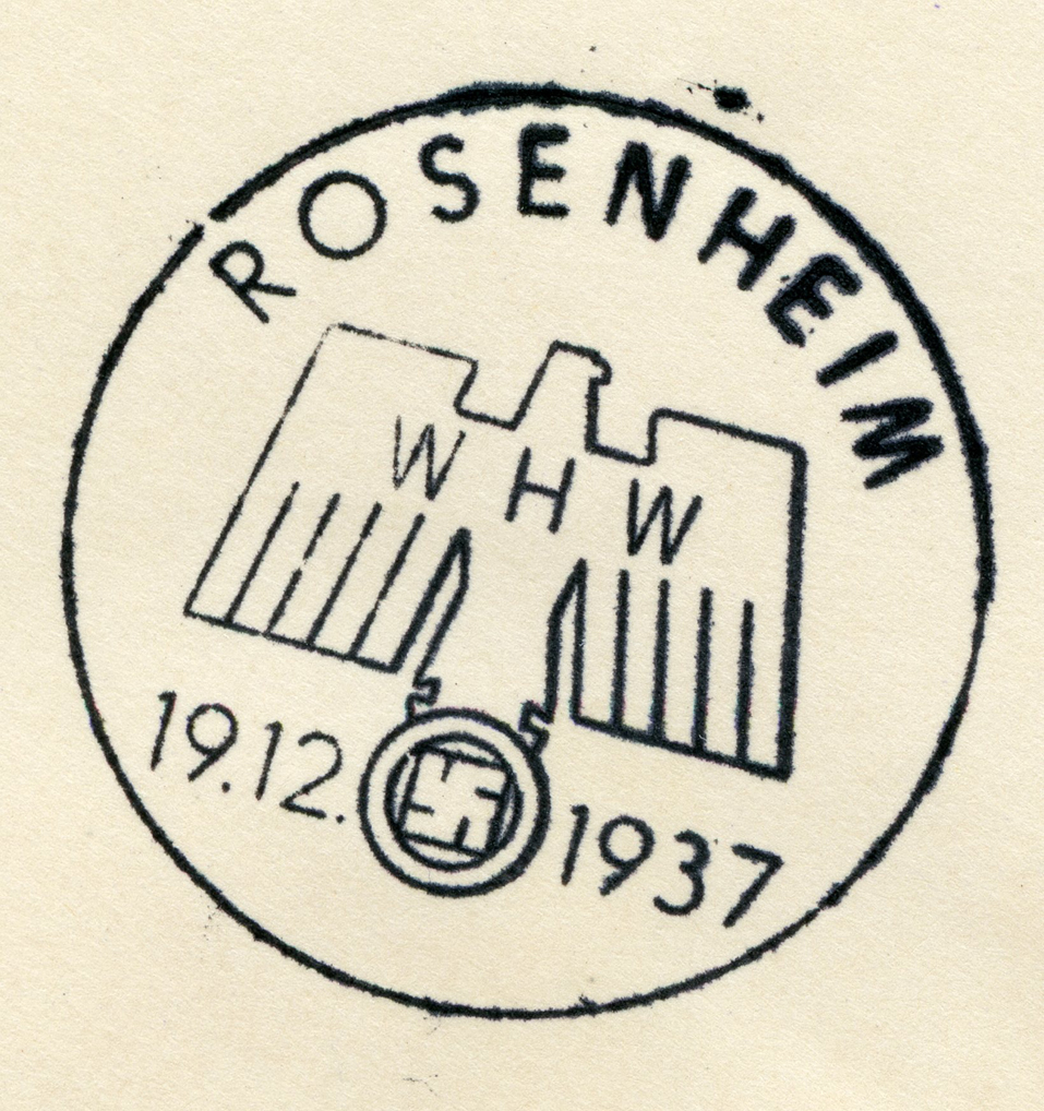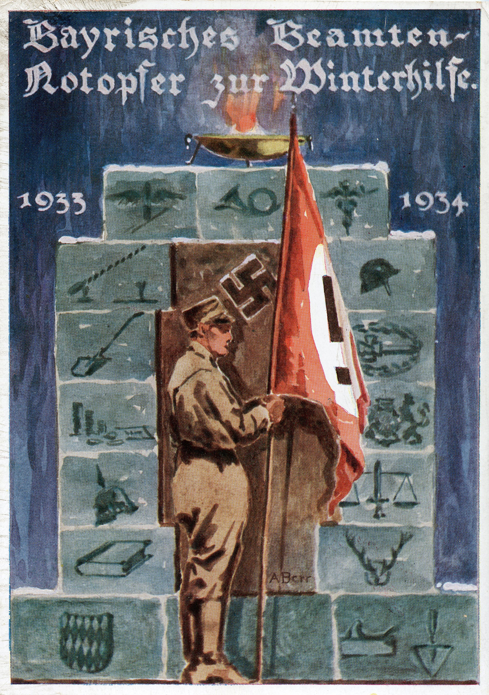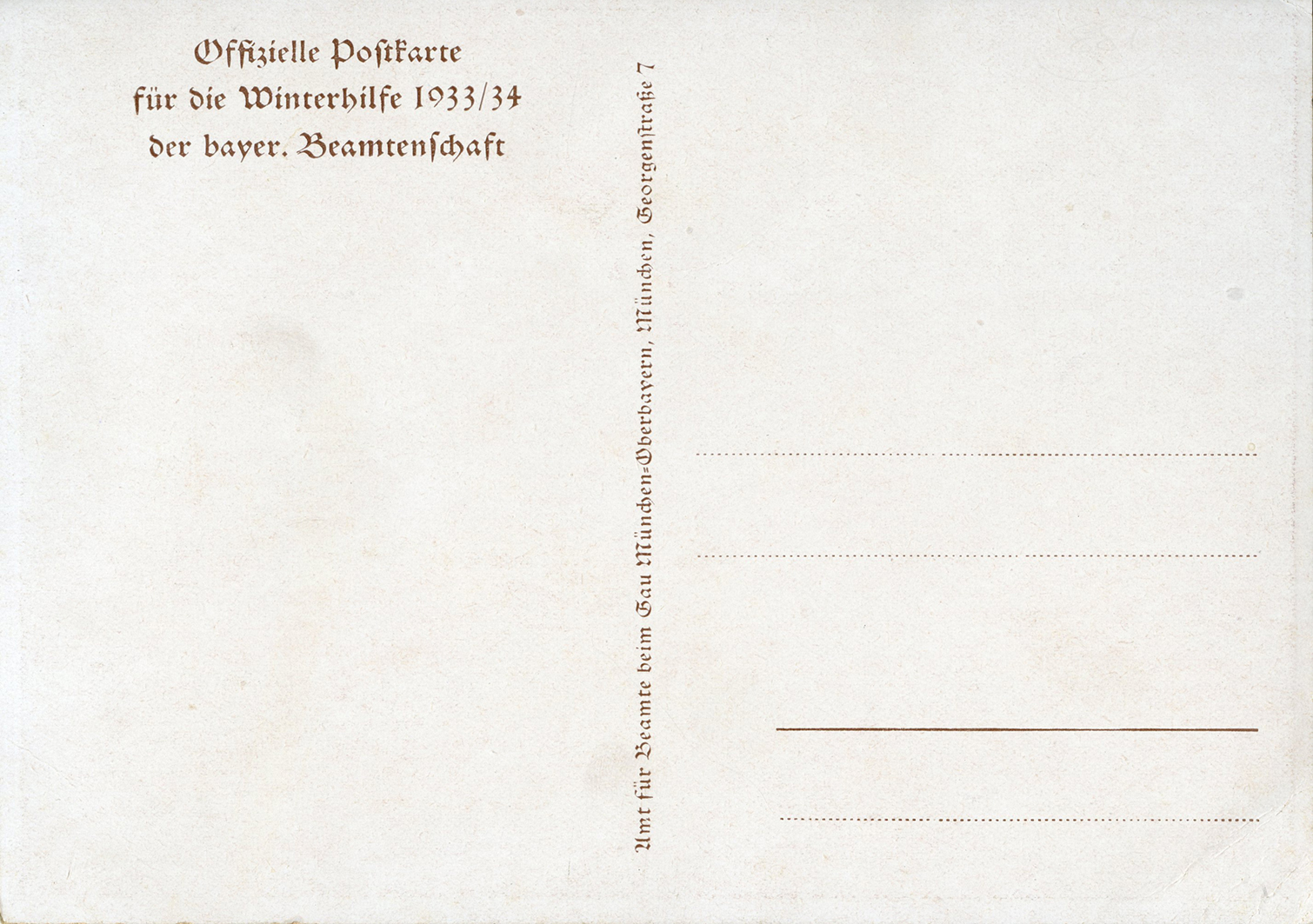[Below: A cool postcard that says 'Bayrisches Beamten Notopfer zur Winterhilfe 1933 - 1934' (Bavarian Civil Servants' Emergency Donation for Winter Relief 1933 - 1934).]