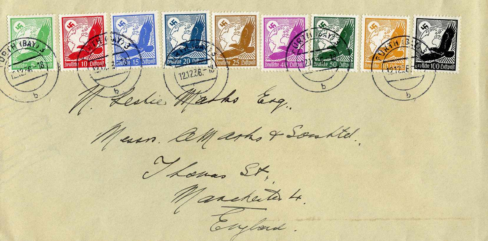 [Below: This has every single German airmail postage stamp, obviously done by a collector, sent on December 12, 1936 from Fürth (Bavaria), to Manchester England.]