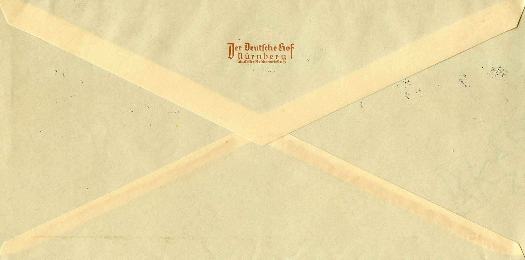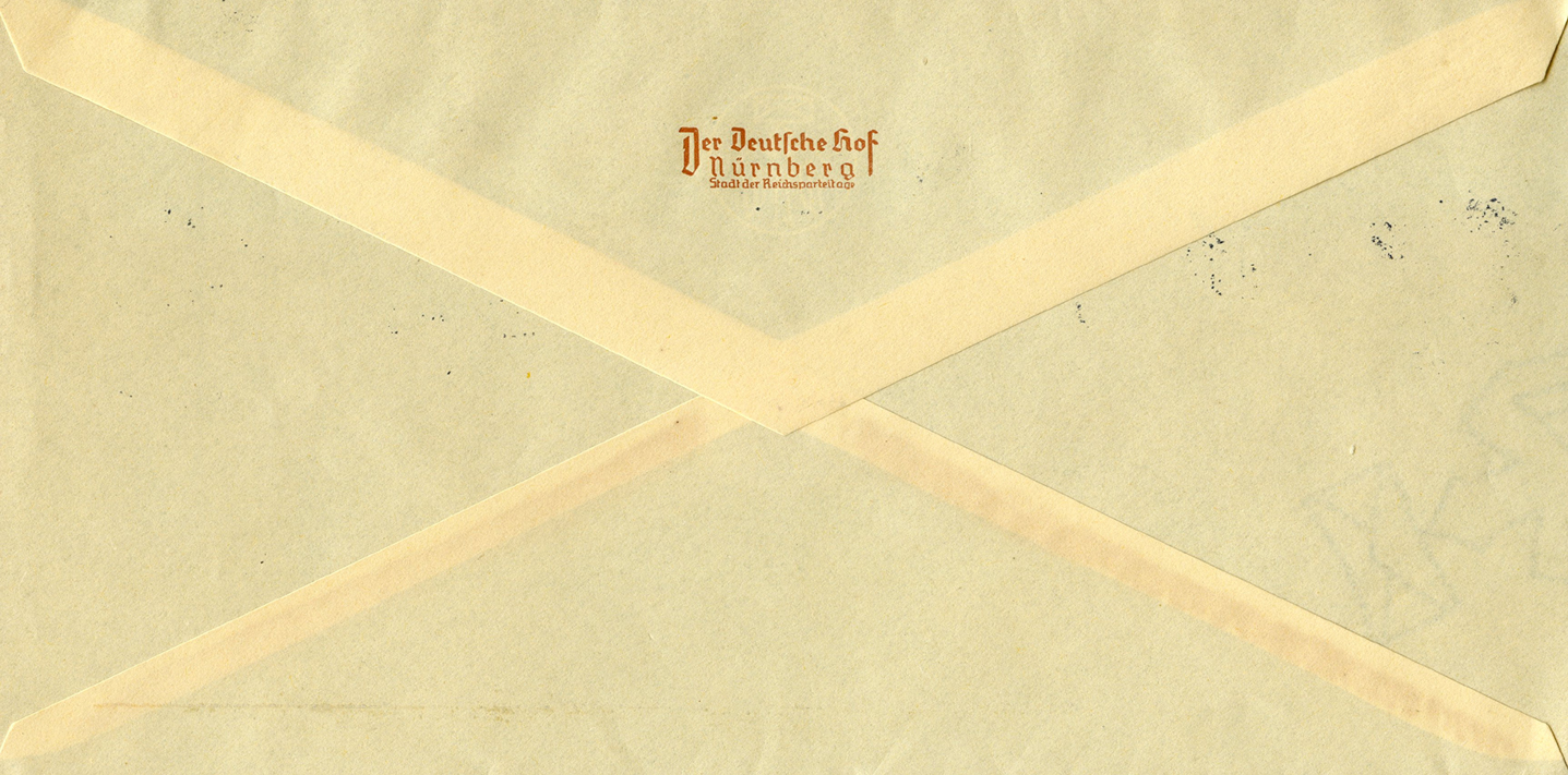 [Below: Reverse. This is from the 'Der Deutsche Hof' in Nuremberg and proclaims it is the state of the Reich Party Day. The Deutsche Hof was a special hotel where Adolf Hitler would stay during his time in the city, a practice that began in the earliest days of the Party. The period advertisements boasted the hotel was 'das Haus des Führers in Nürnberg' (The House of the Führer in Nuremberg). There are also a number of photographs showing Adolf Hitler reviewing his troops from the front of the hotel. Lastly, even the hotel's own silver service pieces were marked with a swastika and wreath.]