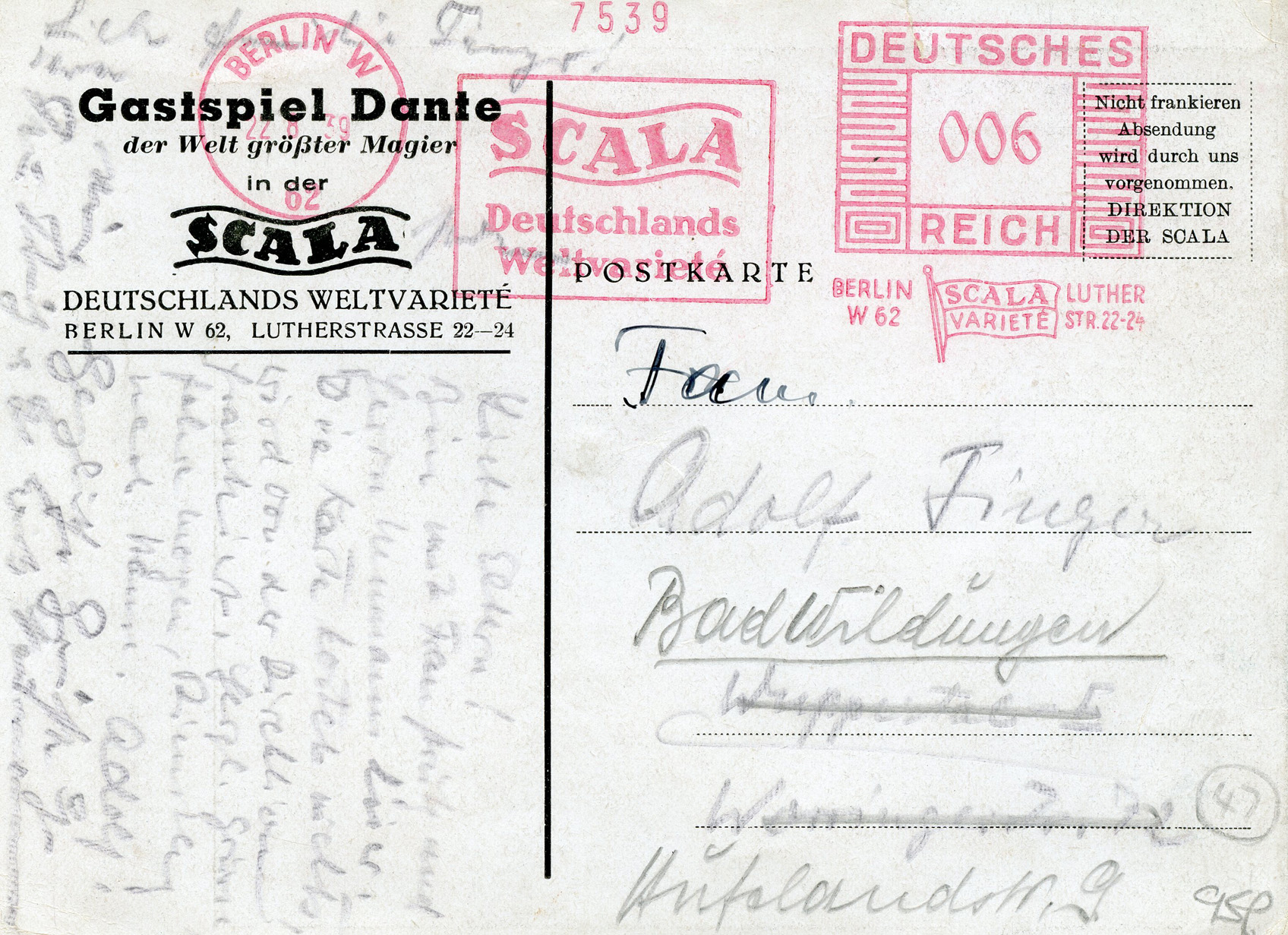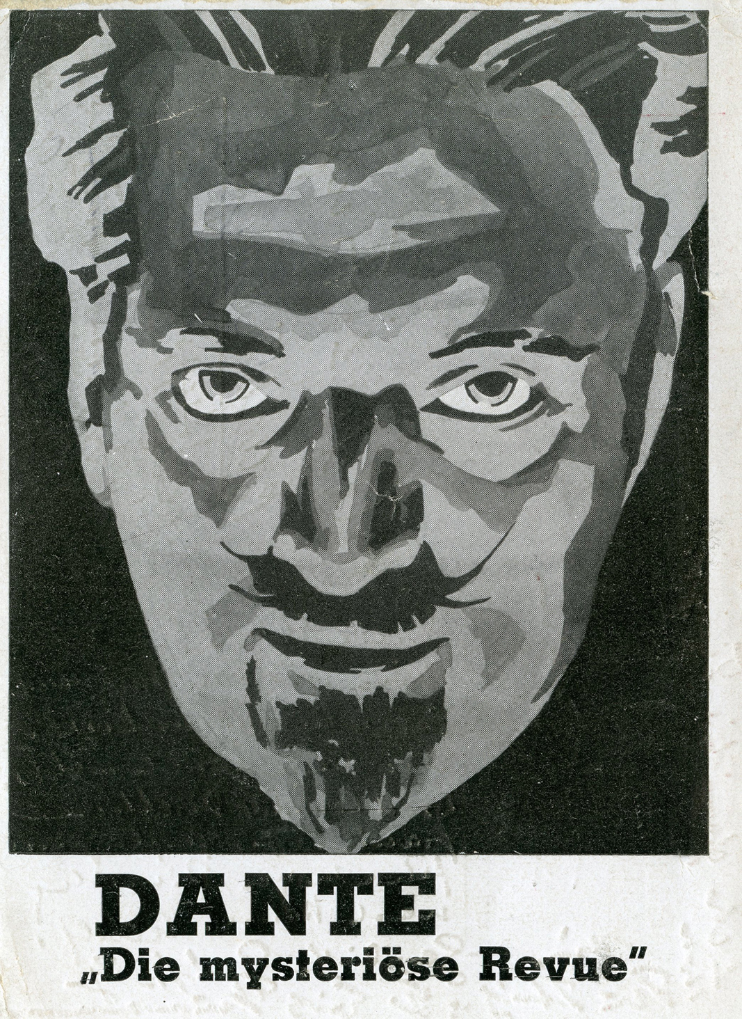 [Below: This striking postcard says 'Dante Die mysteriöse Revue' (Dante The Mysterious Revue). Let's scroll down and learn more about this...]