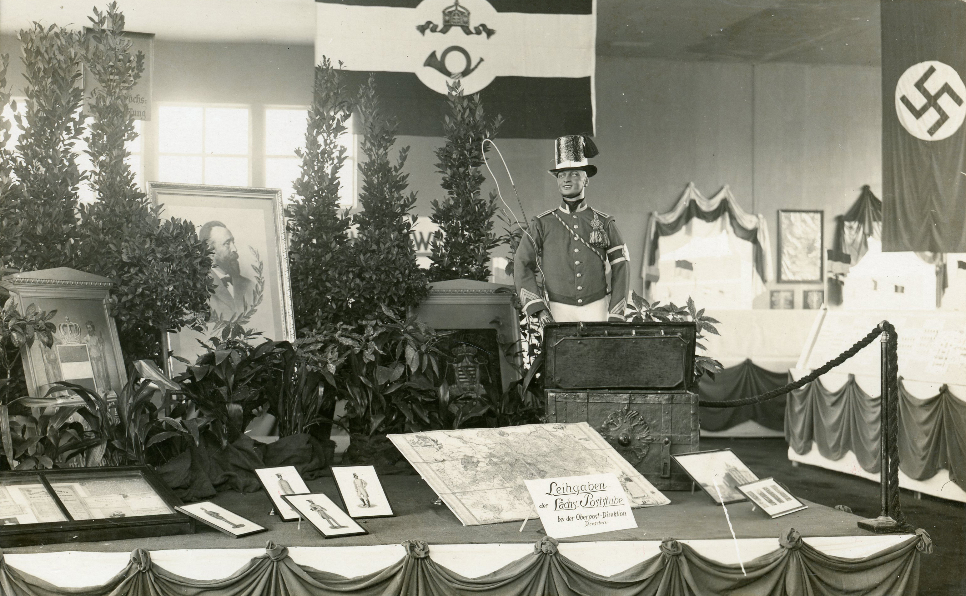 [Below: An interesting postcard honoring an event nearly lost to time. This says ' Leihgaben der Sächs. Poststube bei der Oberpost-Direktion Dresden' (Loans from the Saxon Post Office at the Upper Postal Directorate Dresden). So it is showing historical postal items on loan from the above mentioned. Check out that beautiful old trunk, it is a strongbox, where I'm guessing mail was locked into during transport.]