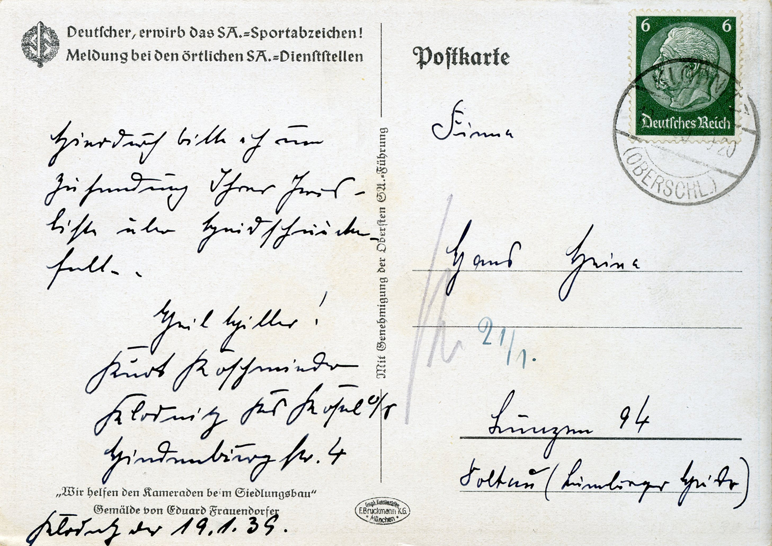 [Below: I wish I could read this writing... I can spot 'Heil Hitler!'. This is dated and canceled on January 19, 1939. Unfortunately this has a boring, regular cancel.]