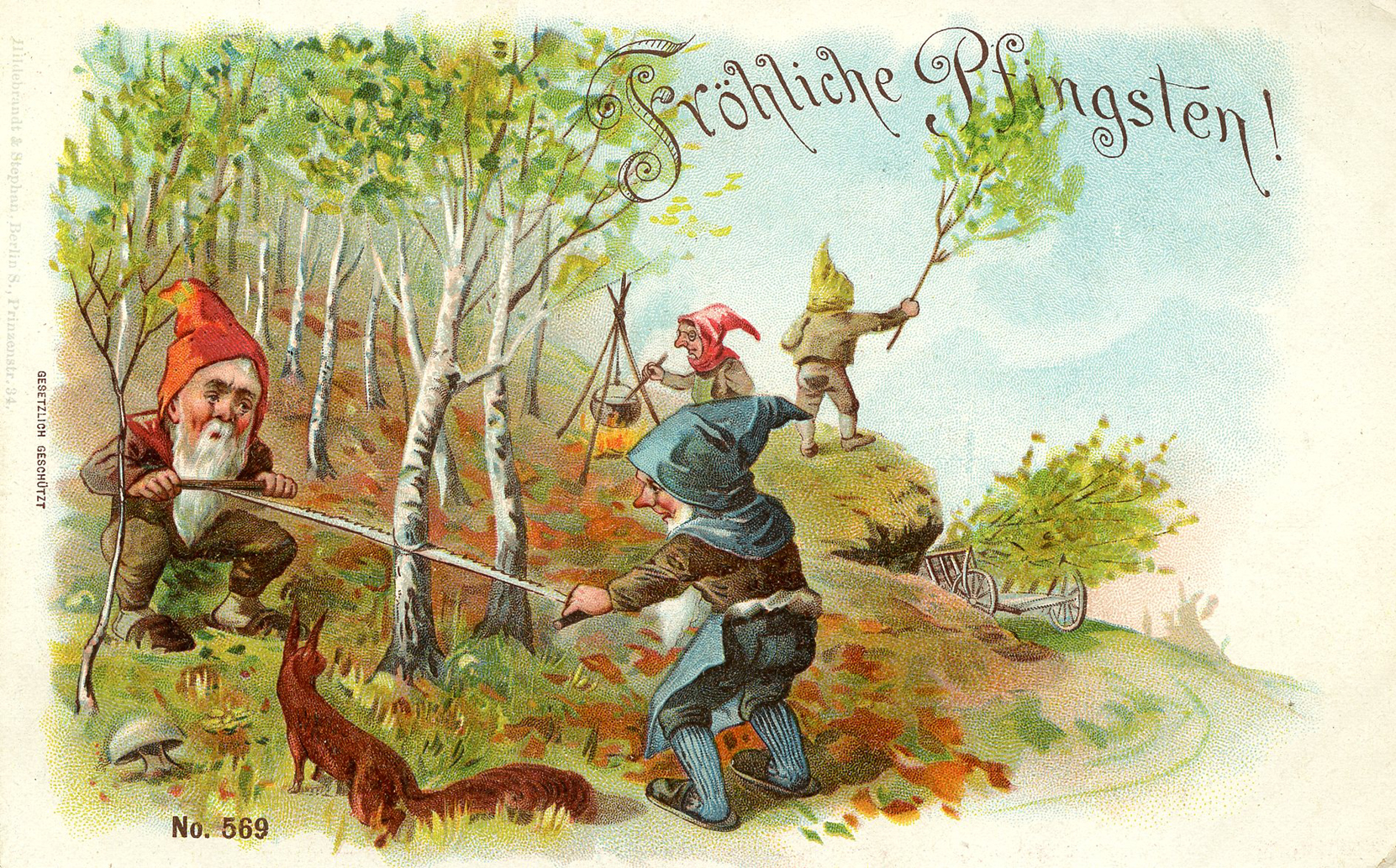 [Below: This postcard, showing Satanic, Pagan dwarves, says 'Fröhliche Pfingsten!' (Happy Pentecost!).]