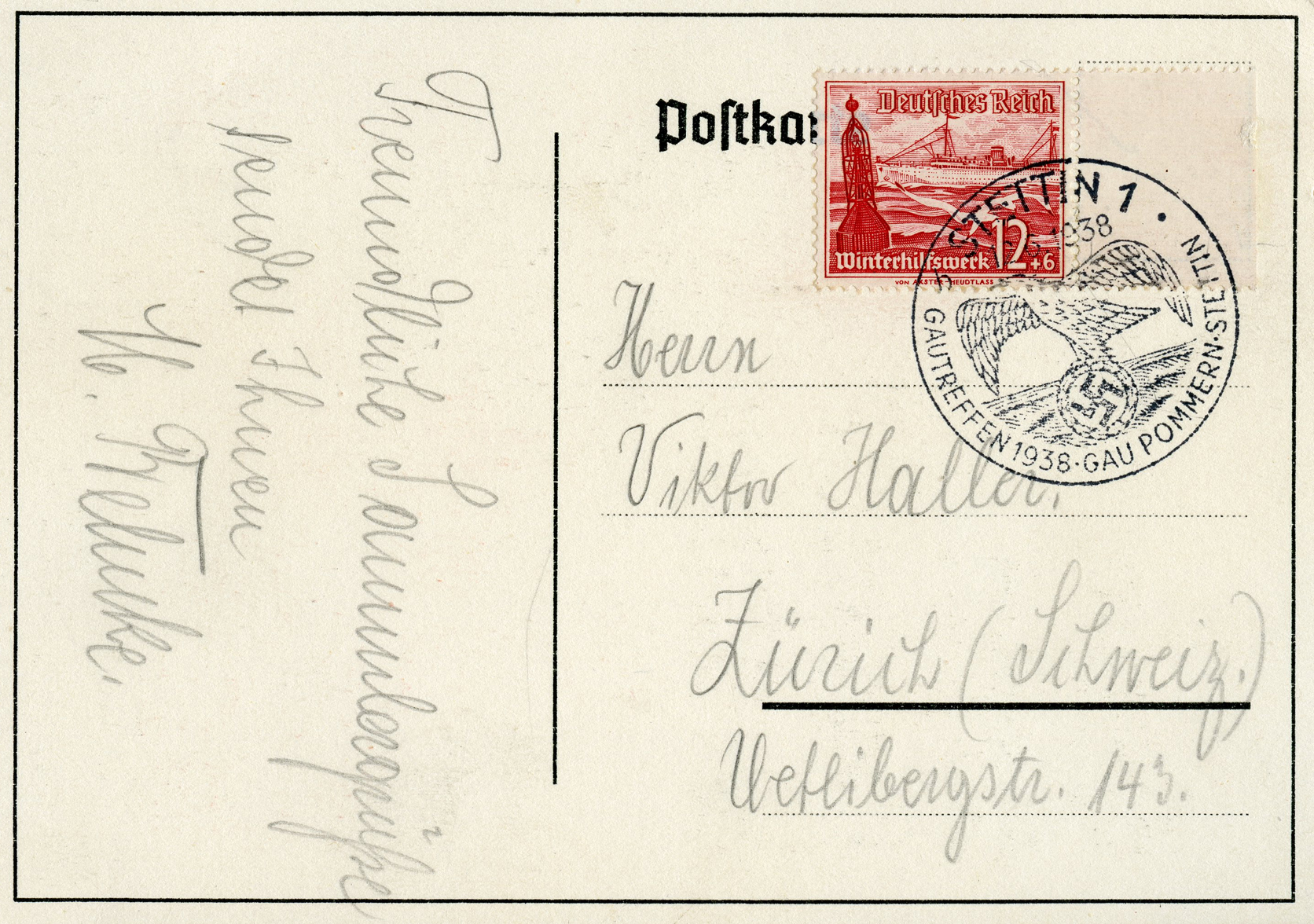 [Below: Some really eye-catching postcards on this page. This one says: 'Gau=treffen Pommern der NSDAP - Stettin 10.-12. Juni 1938' (Pomeranian Regional Meeting of the Nazi Party - Stettin, June 10-12, 1938).]