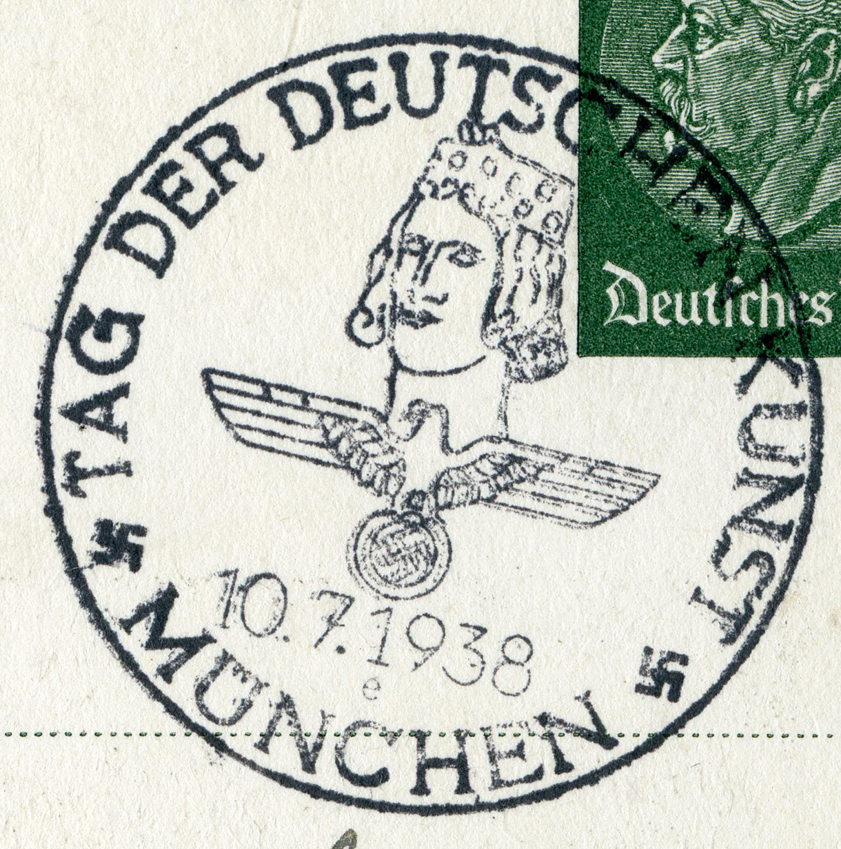 [Below: Here we see that this postcard was produced for the 'Deutsches Turn-und Sportfest' (German Gymnastics and Sports Festival). I'm guessing the dancing on the front of this postcard represented a celebration for the sporting event? The event cancel shows a date of July 29, (1938), and if you look carefully the postage stamp itself is for the event.]