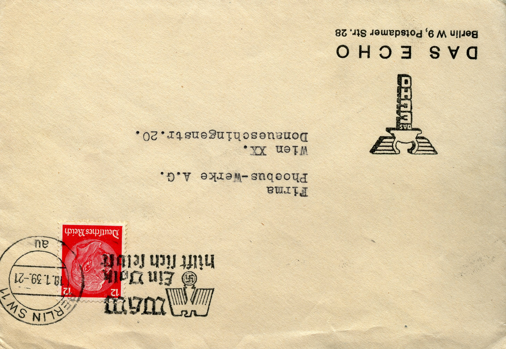[Below: This was canceled on July 3, 1939 and sent to Latvia from the Steyr company. Steyr is a motor company that has been around for over 150 years. They are located in the beautiful town of Steyr, Austria, although this envelope was sent from an address in Berlin. It says: