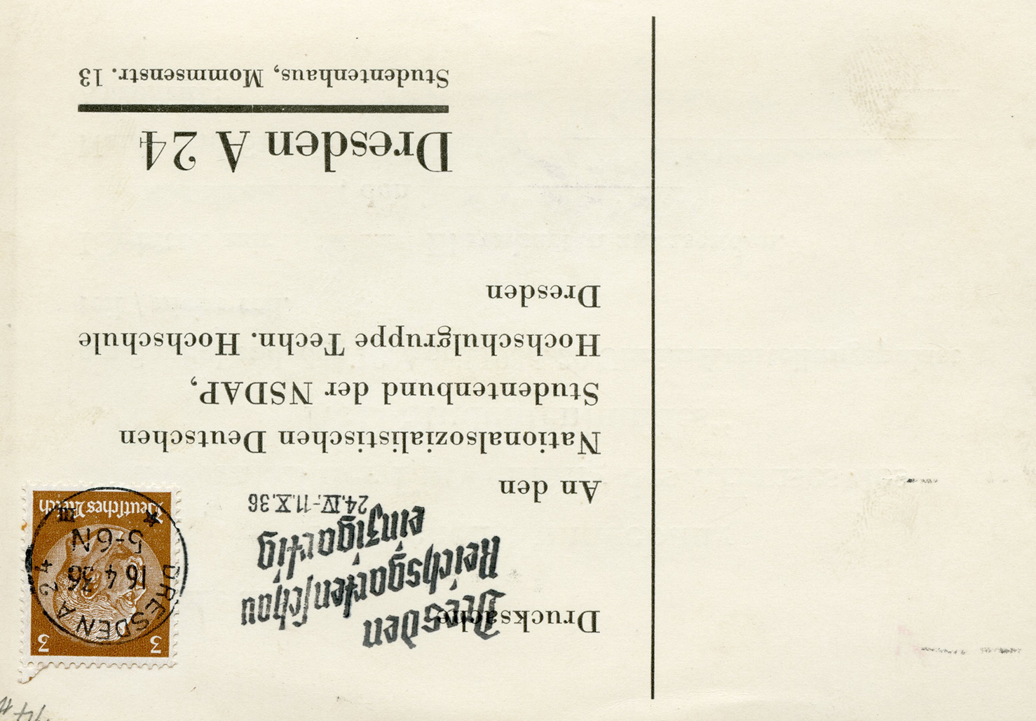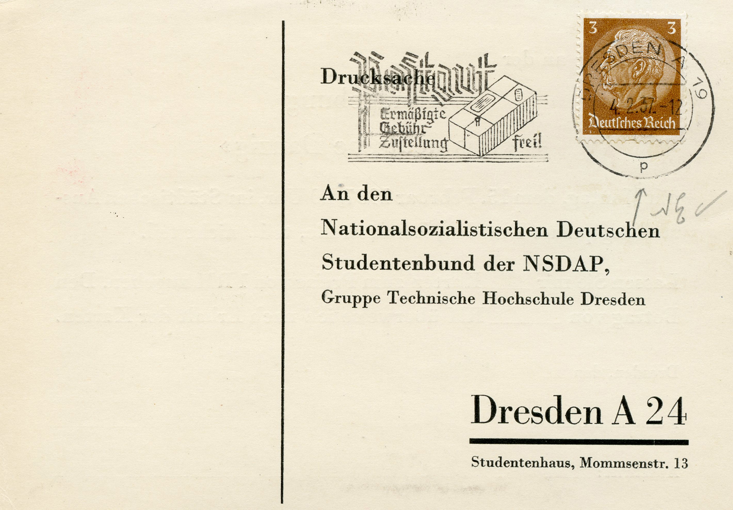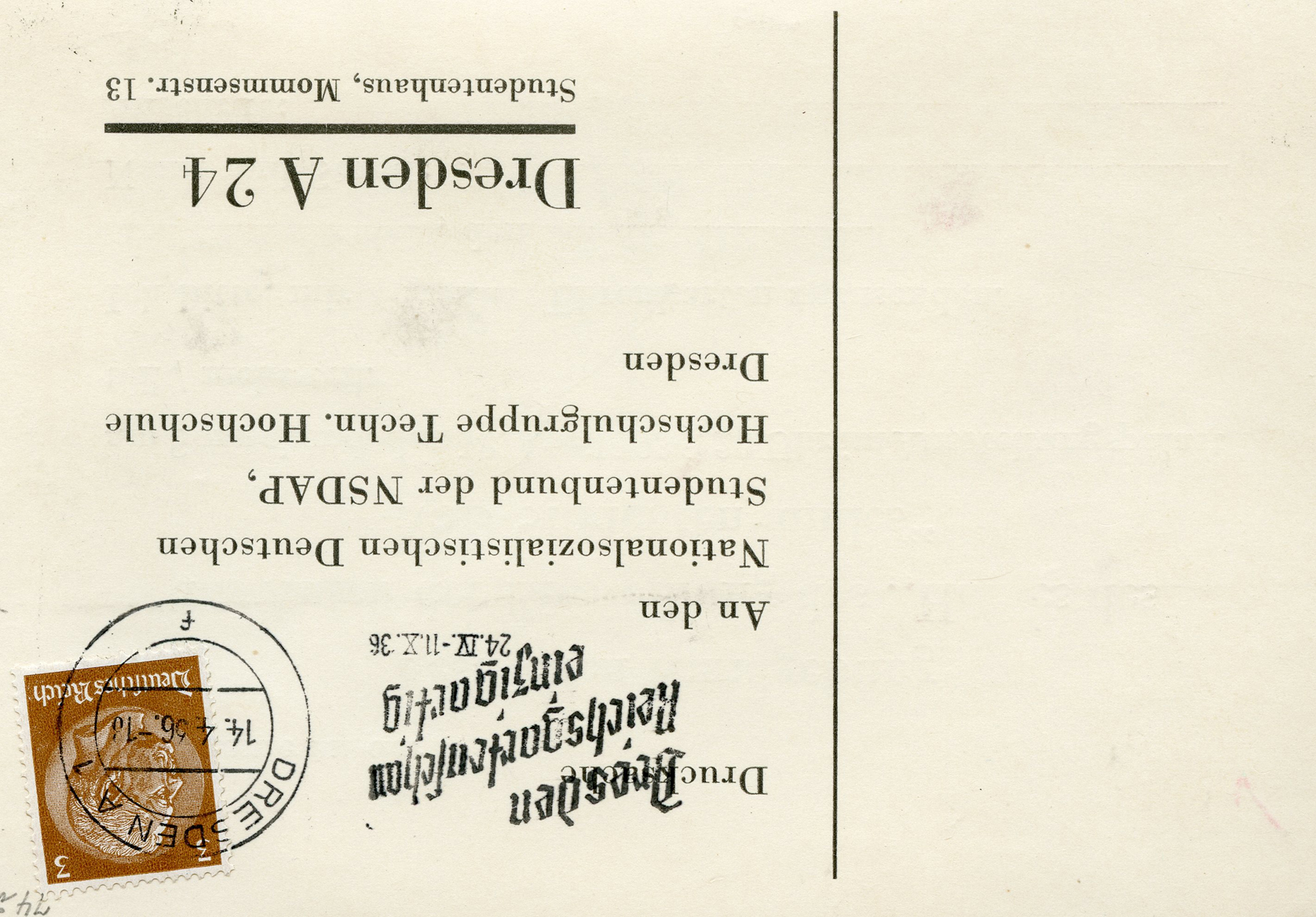 'An den Nationalsozialistischen Deutschen Studentenbund der NSDAP - Hochschulgruppe Techn. Hochschule Dresden'