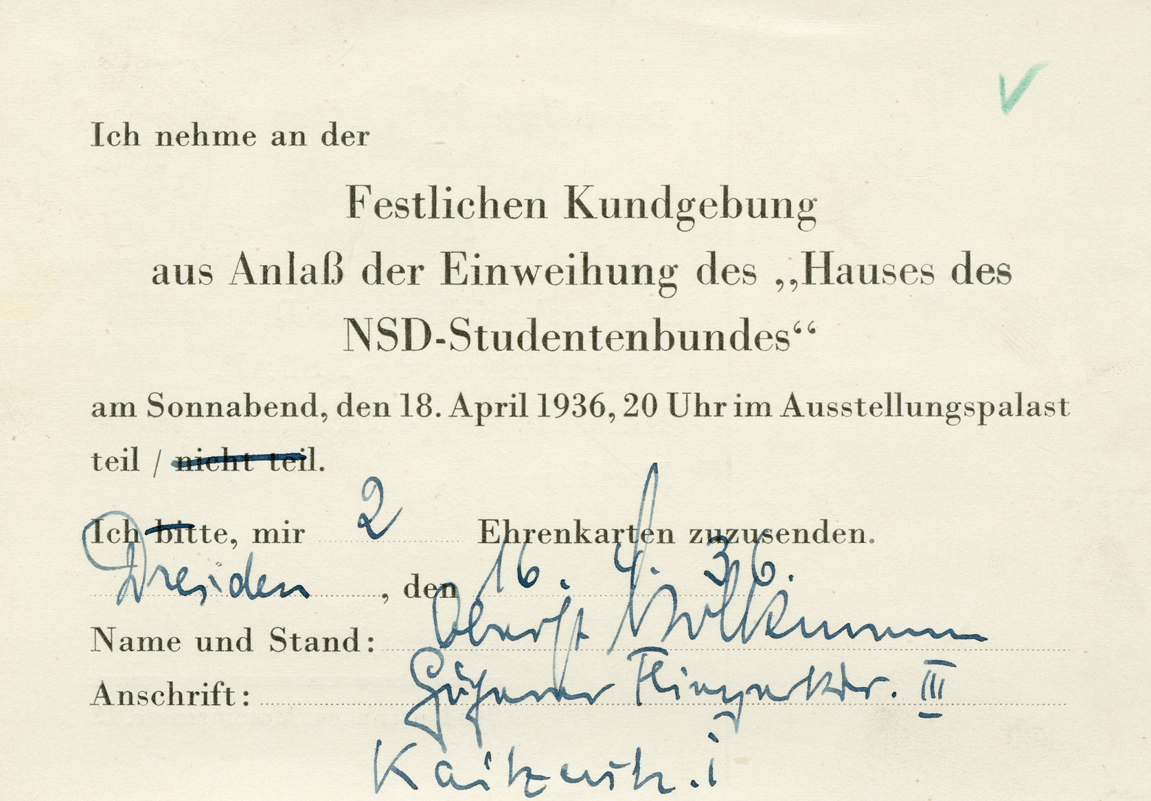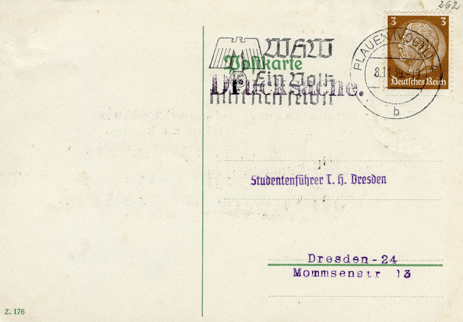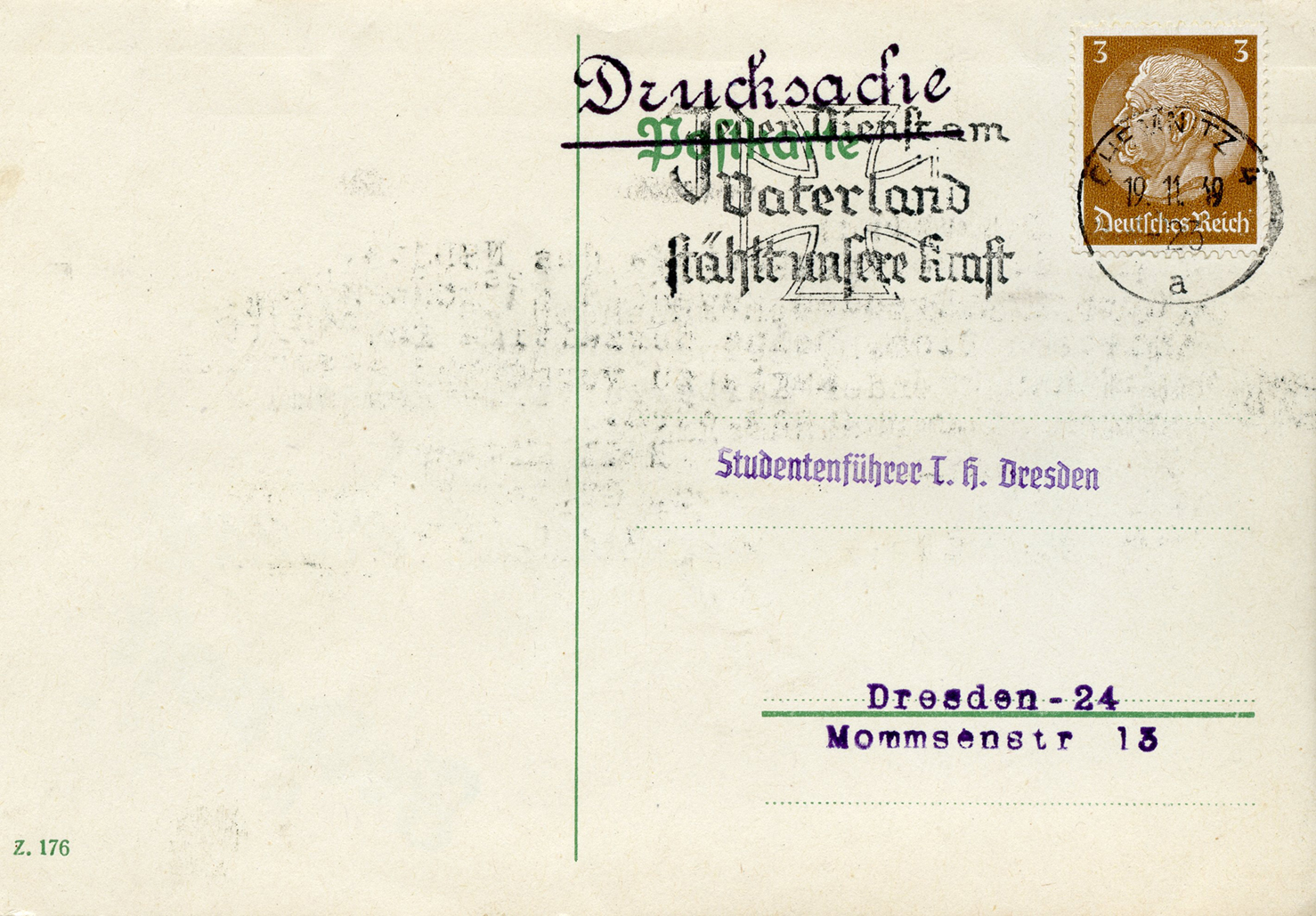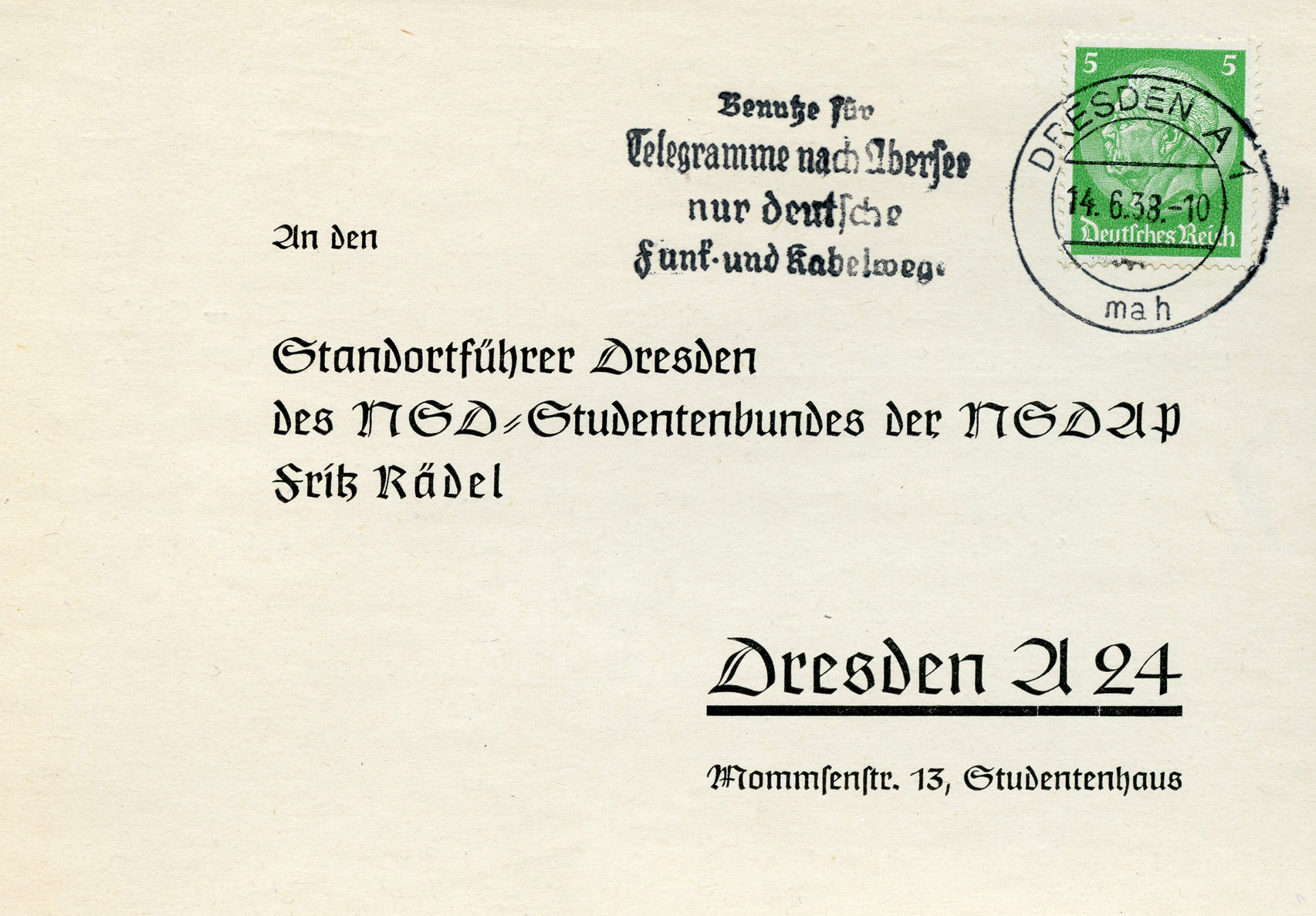 'An den Nationalsozialistischen Deutschen Studentenbund der NSDAP - Hochschulgruppe Techn. Hochschule Dresden'