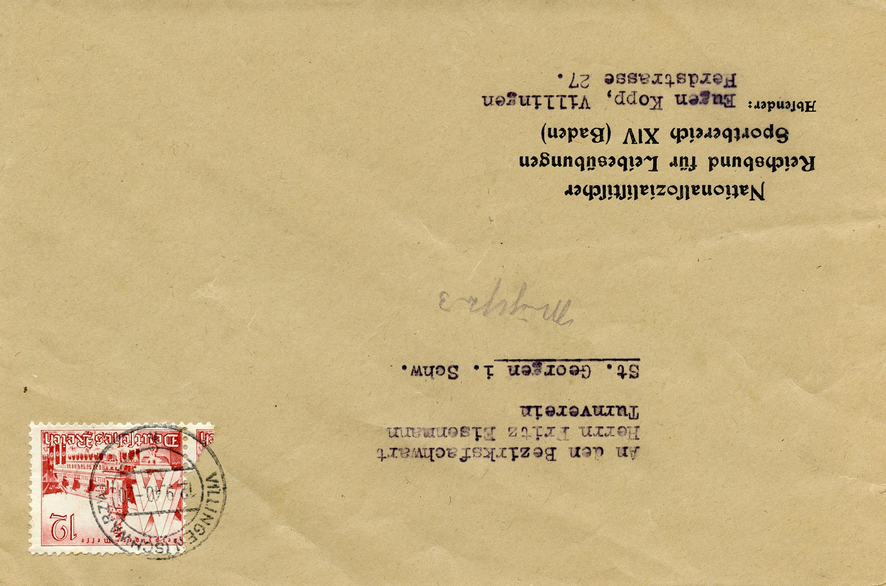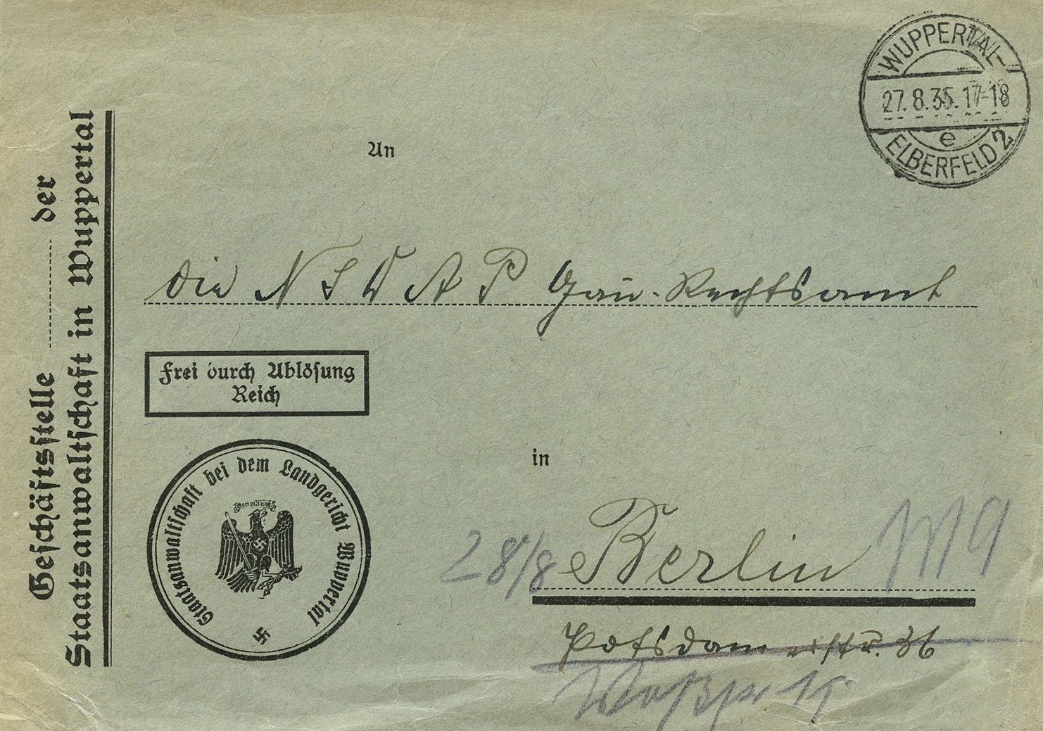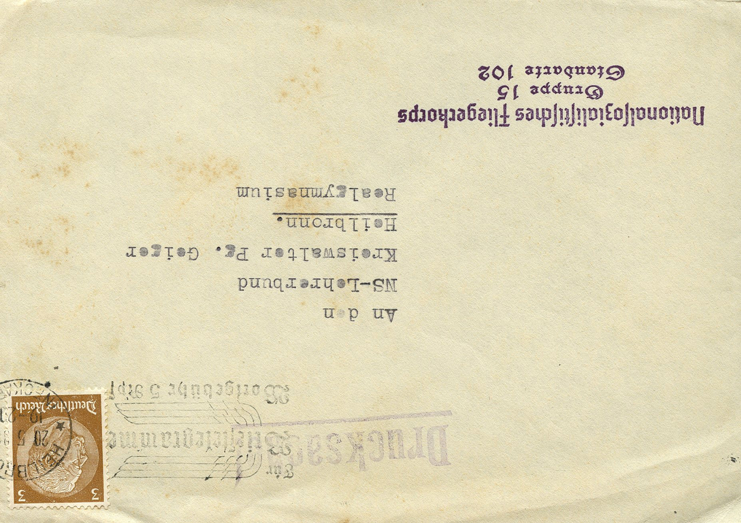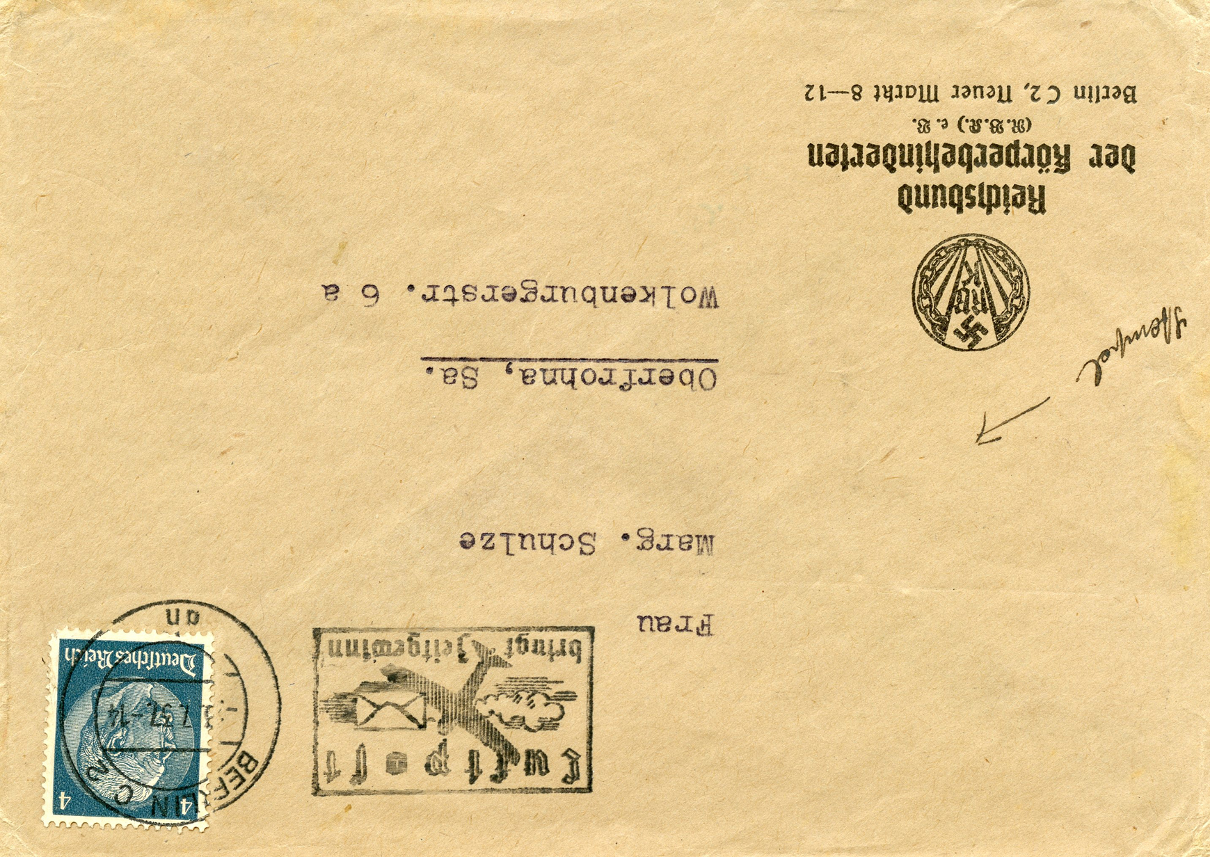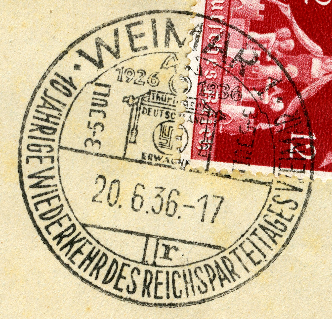 In the lower lefthand corner we see 'N.S.D. St. B.' which stands for Nationalsozialistischen Deutschen Studentenbund. Canceled on April 18, 1936.]